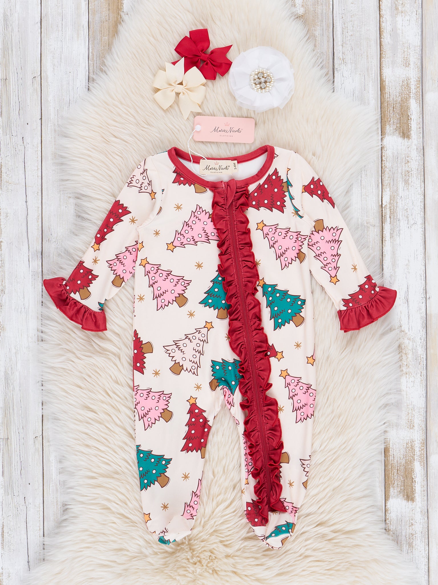 Snuggle up in these playful Red & Green Whimsy Trees Footed Sleeper Pajamas! Featuring whimsical Christmas trees and an asymmetrical ruffle zipper closure, these pajamas will keep baby cozy and in the holiday spirit. Perfect for Christmas morning or a festive movie night in!