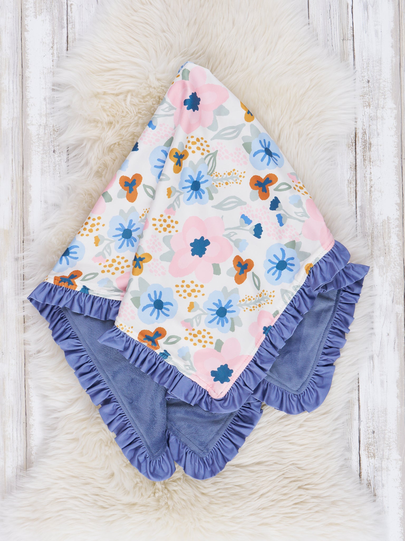 Blue & Pink Floral Watercolor Ruffle Minky Blanket