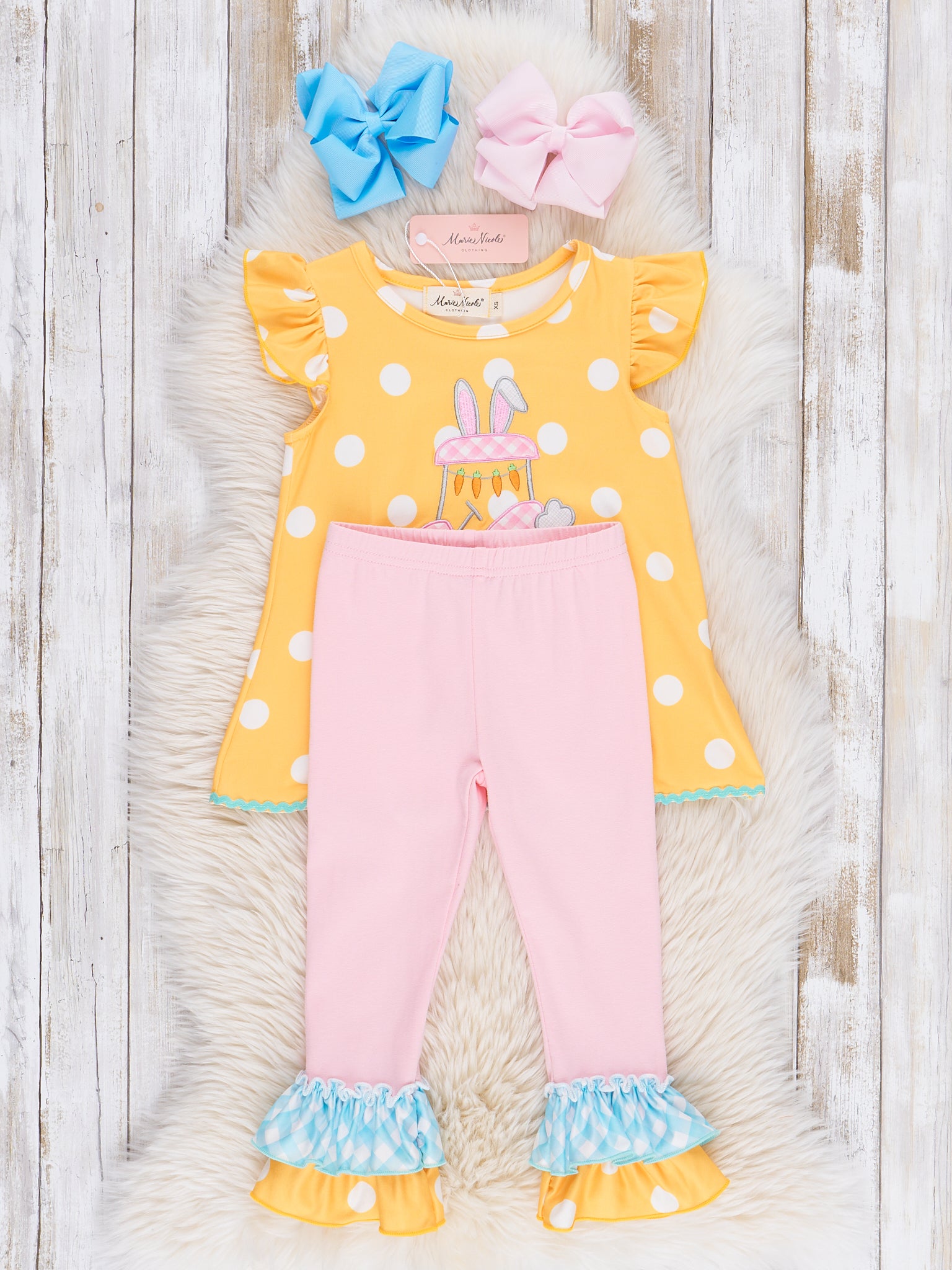Yellow Embroidered Bunny Car Polka Dot Outfit
