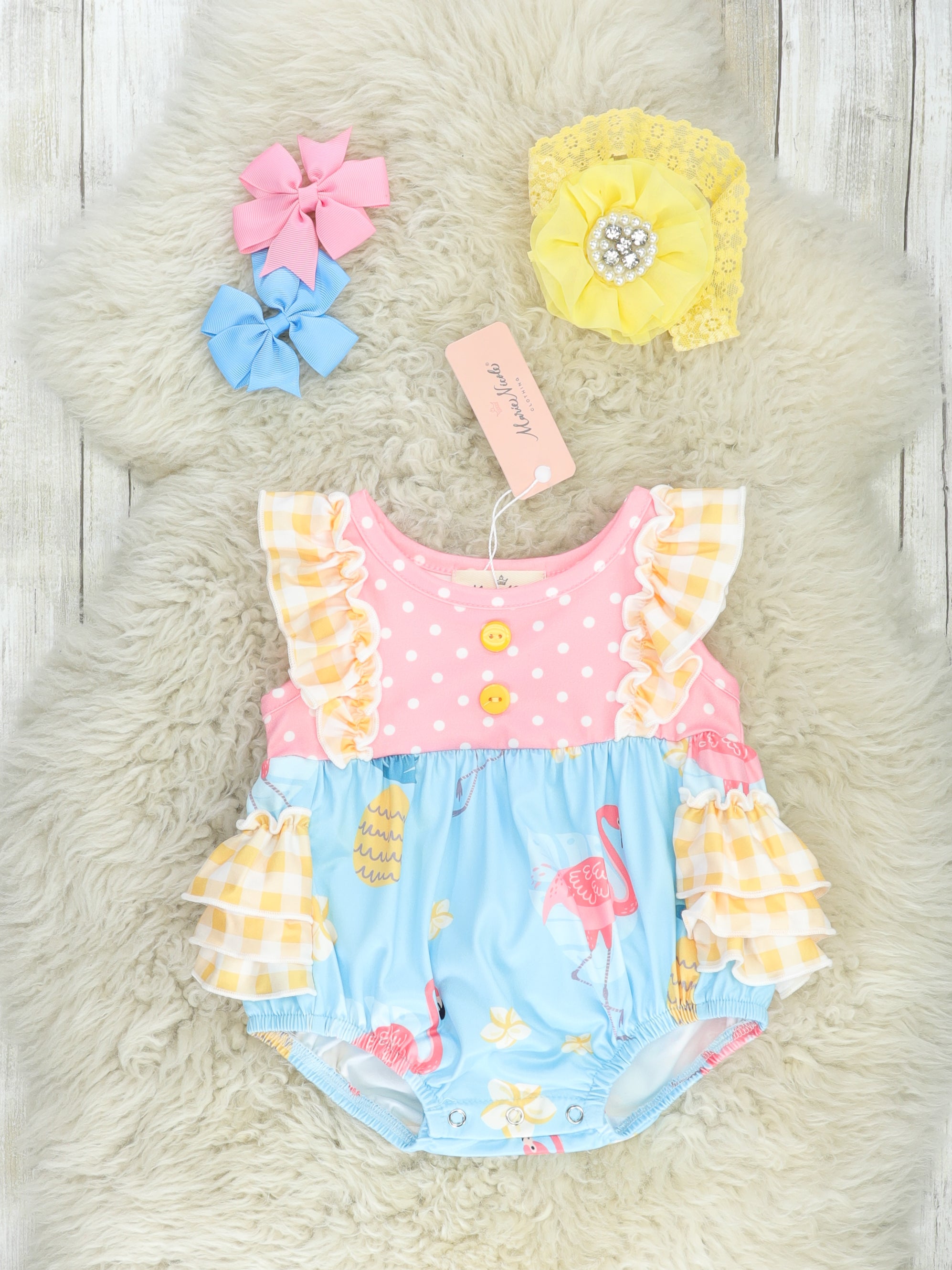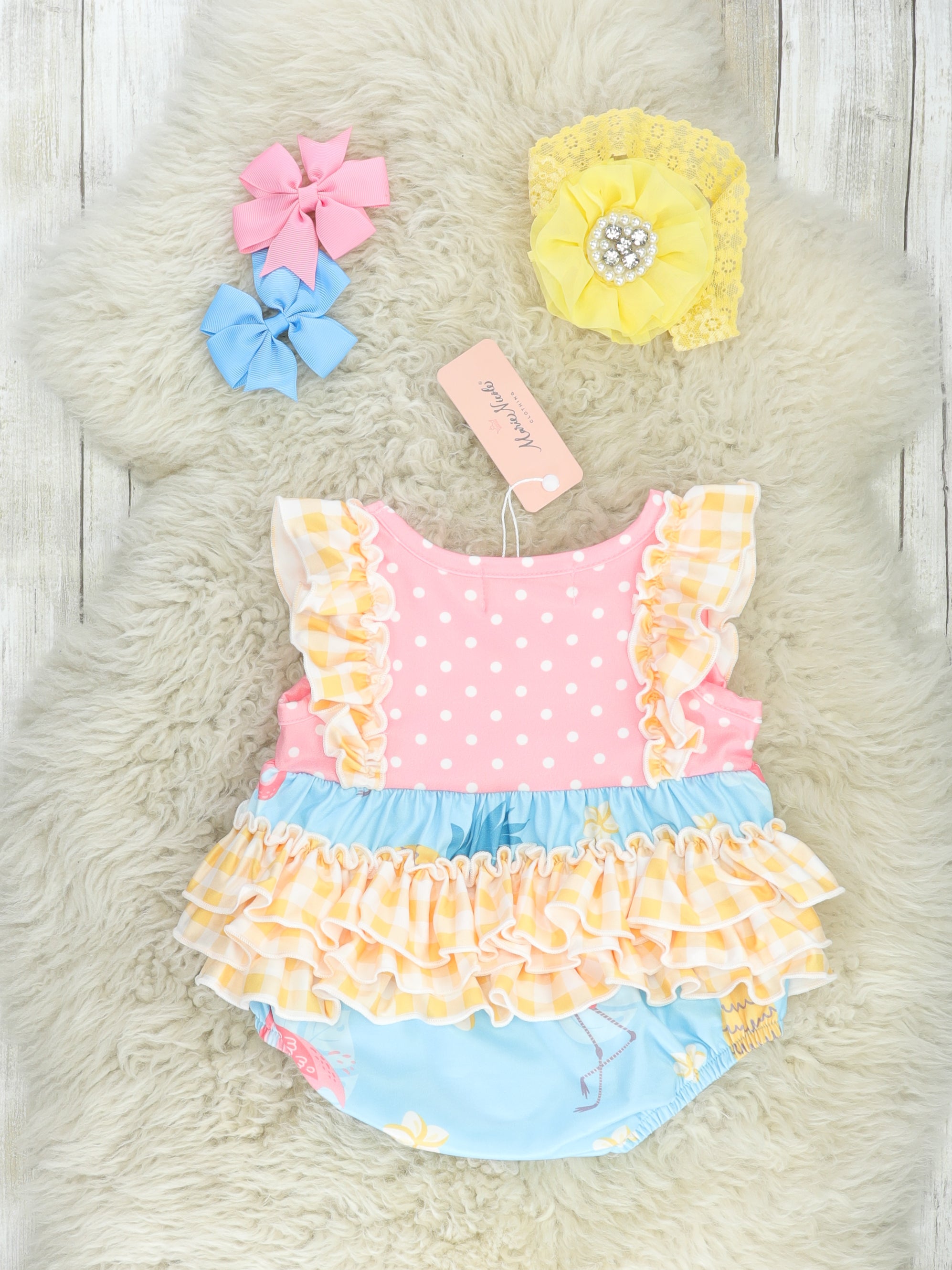 Yellow Gingham Flamingo Ruffle Bubble