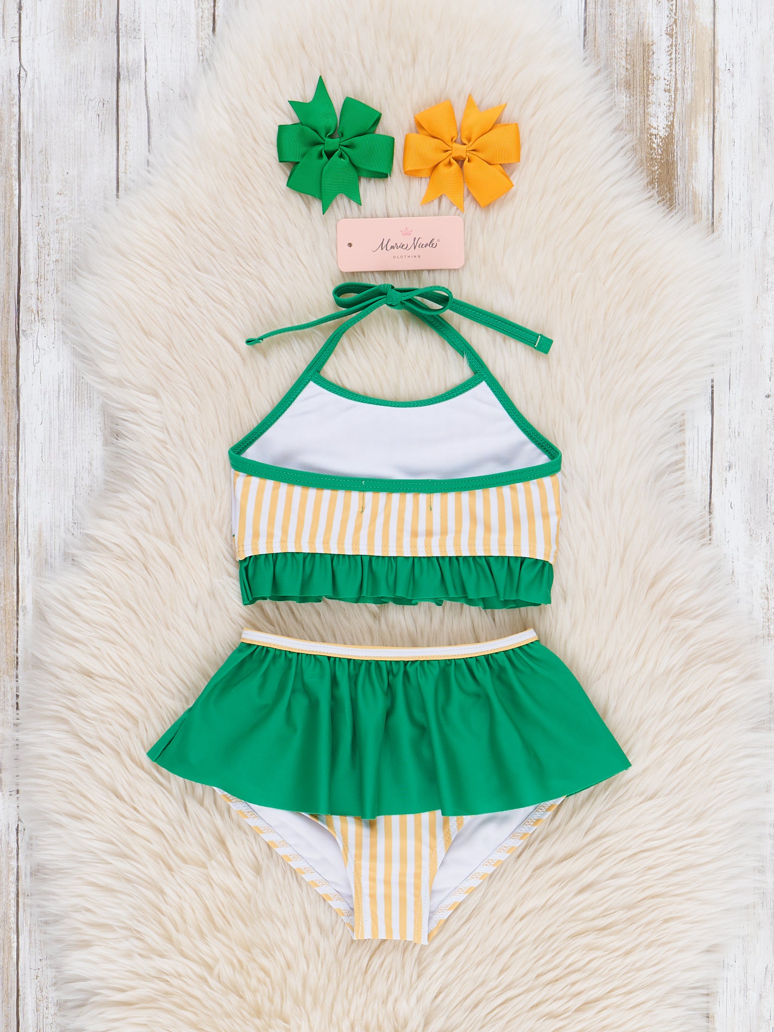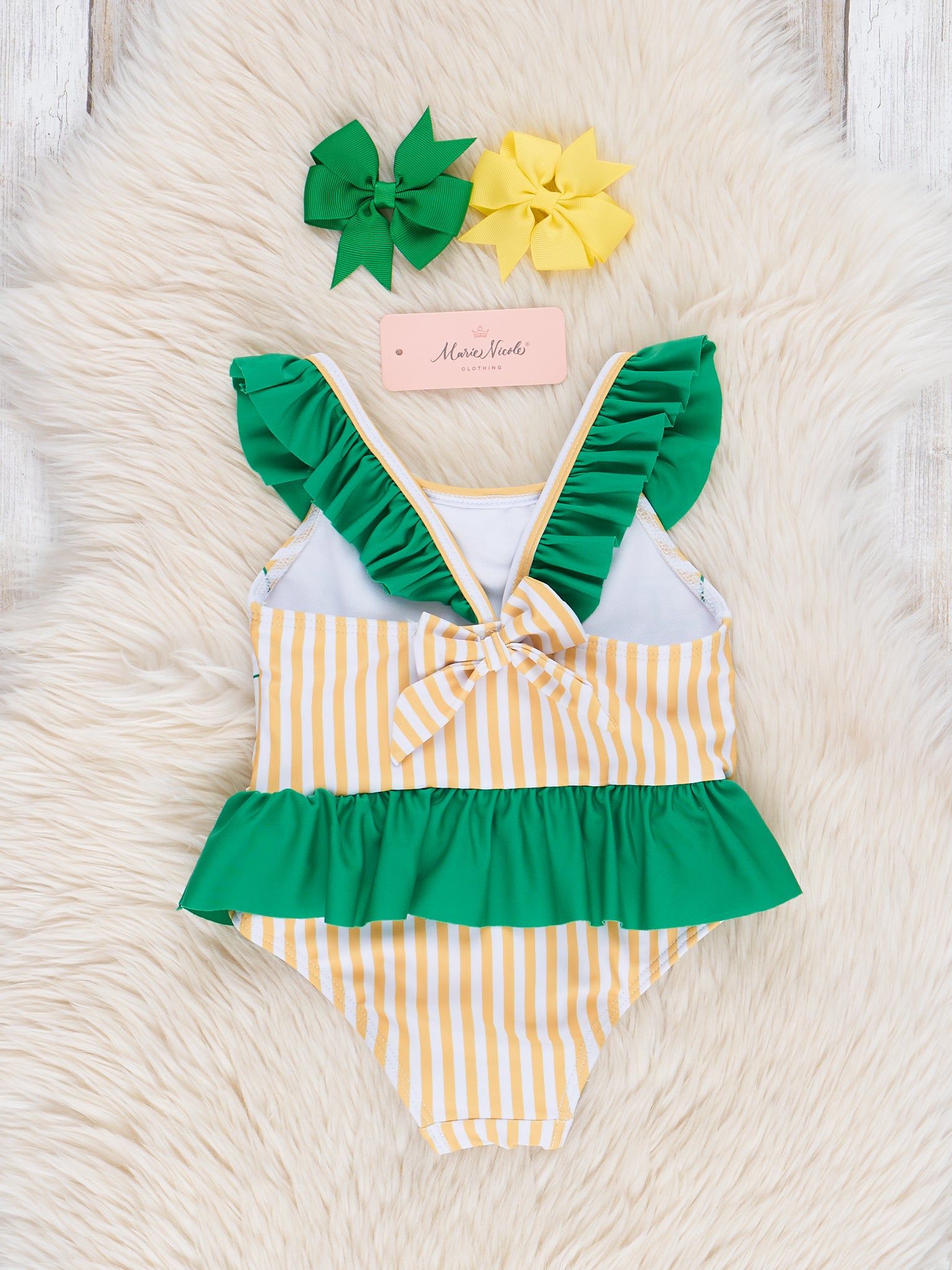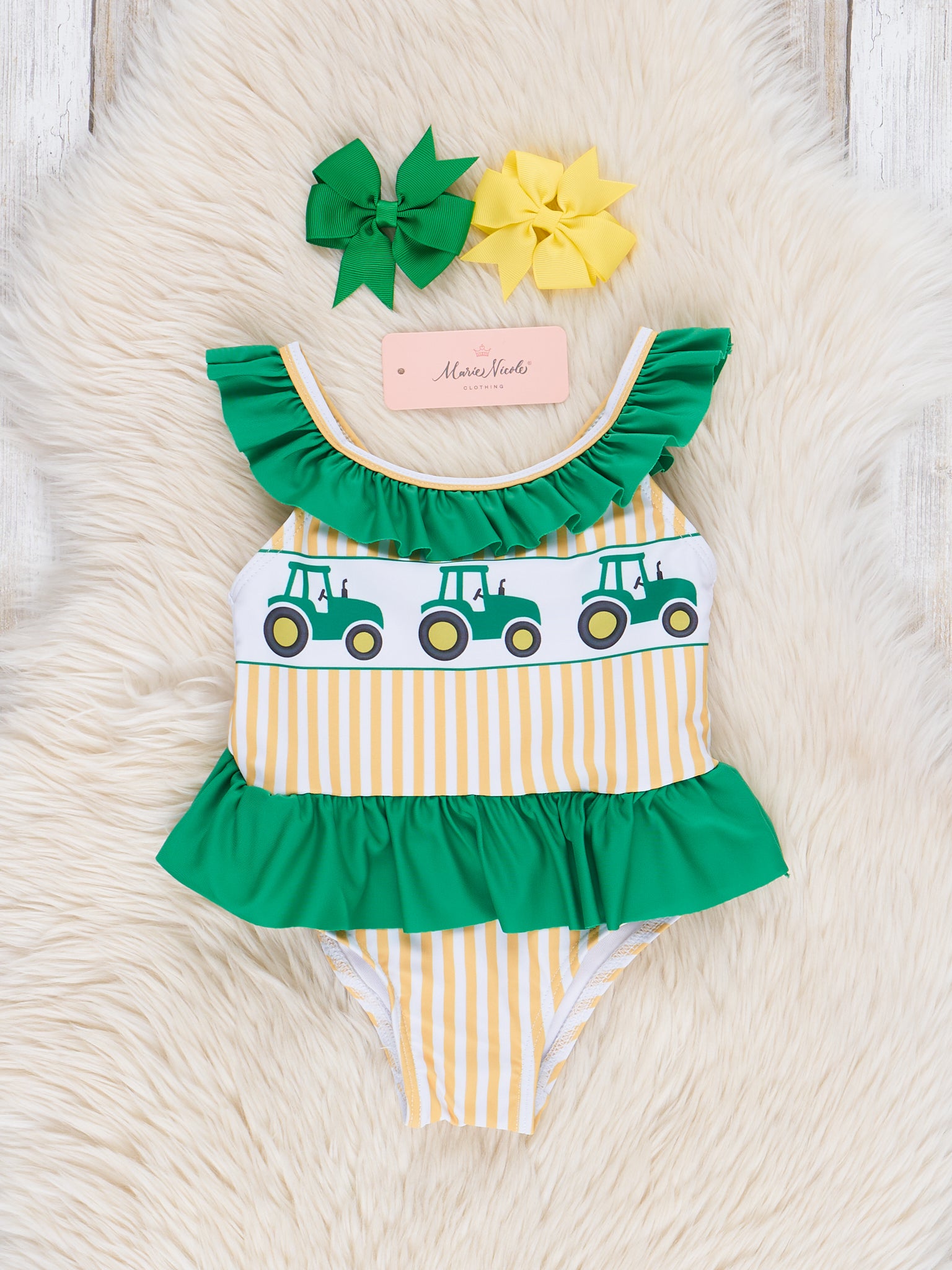 Home › Green & Yellow Striped Tractor Swimsuit Set