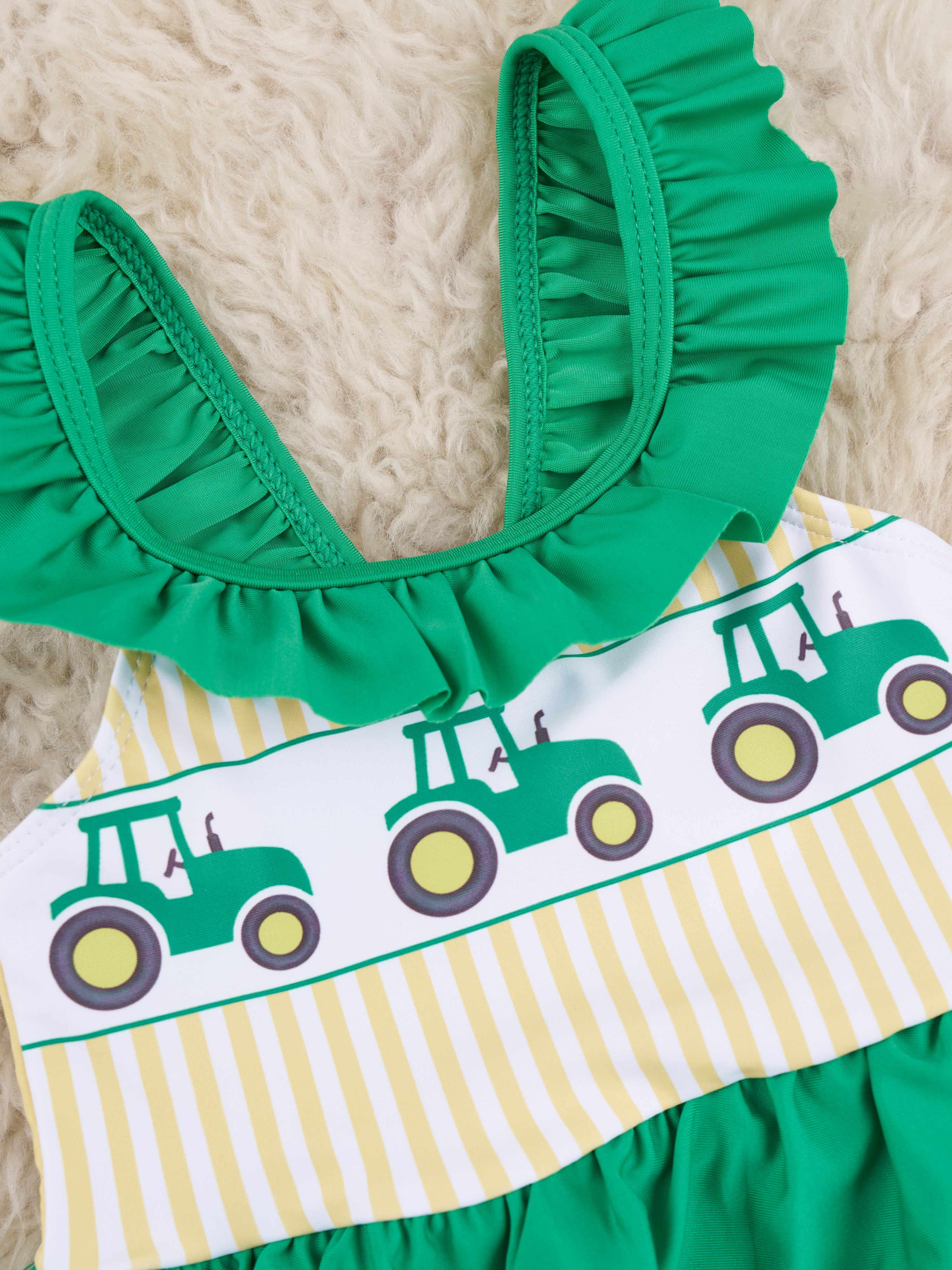 Green & Yellow Striped Tractors Two-Piece Swimsuit