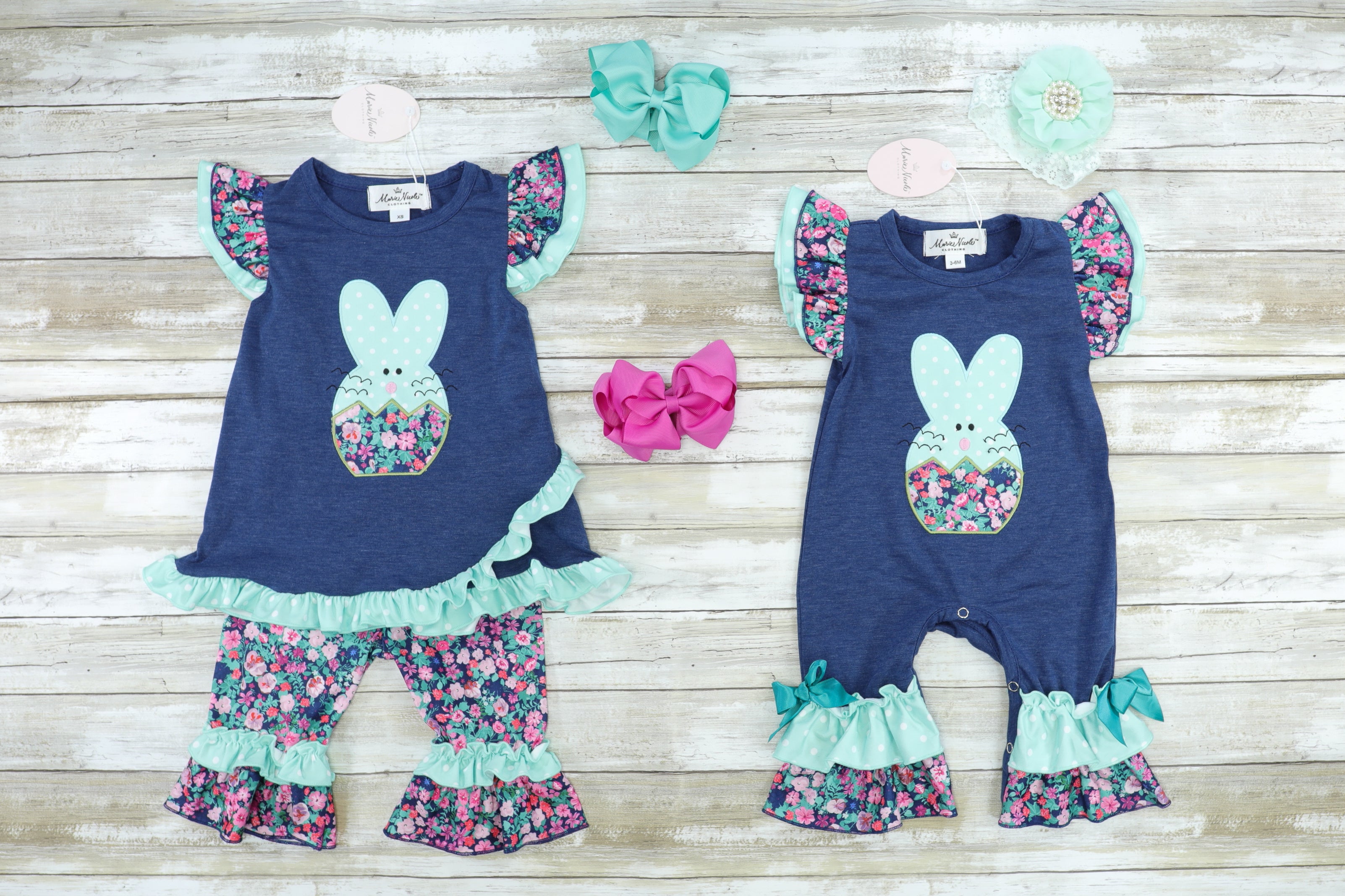 Navy & Mint Floral Bunny Ruffle Romper