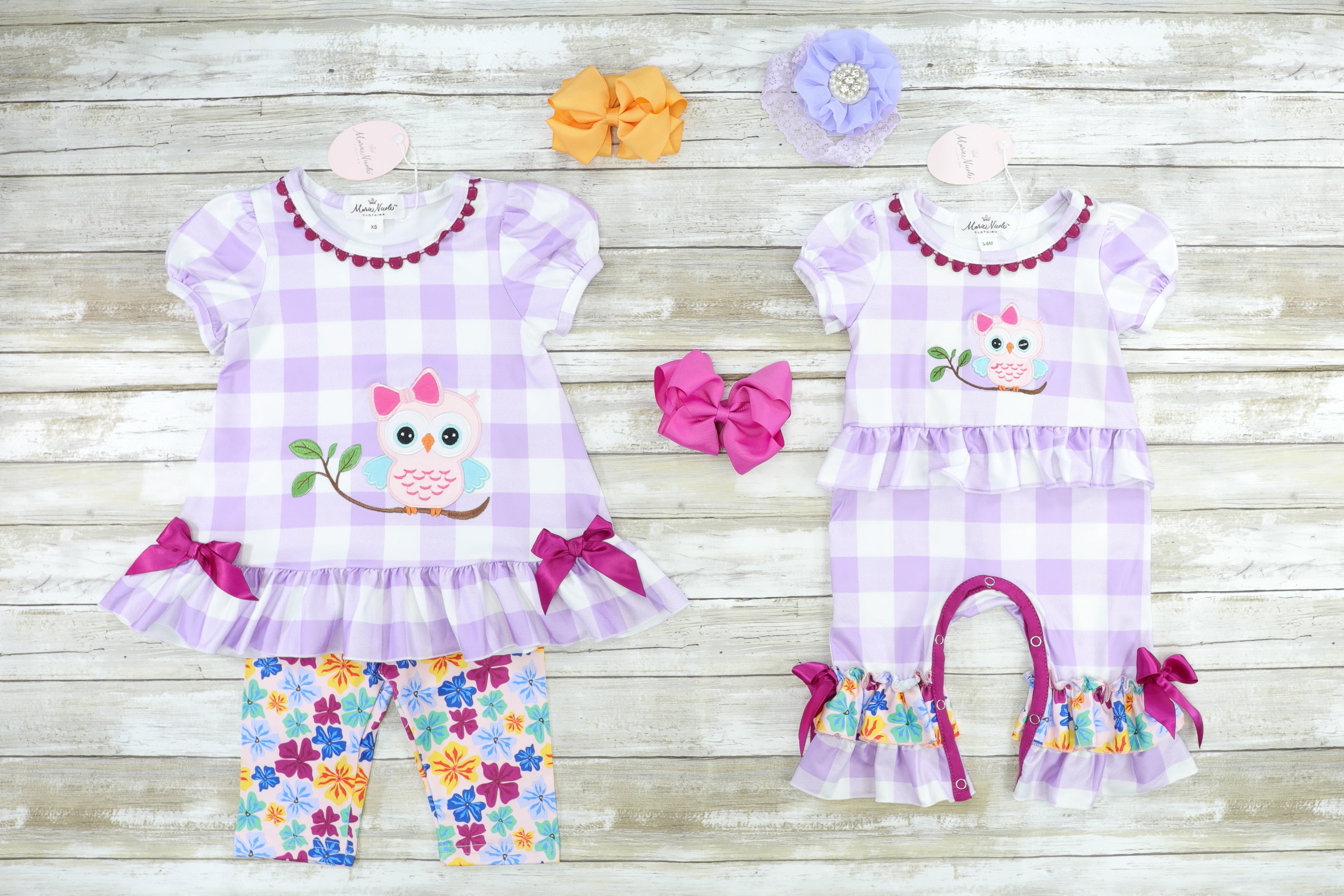 This sister set is tot-OWL-ly adorable! This purple plaid romper features ruffles, a magenta neck trim, an owl appliqué, magenta bows on the outside of both legs, & snap buttons making for easy diaper changes.