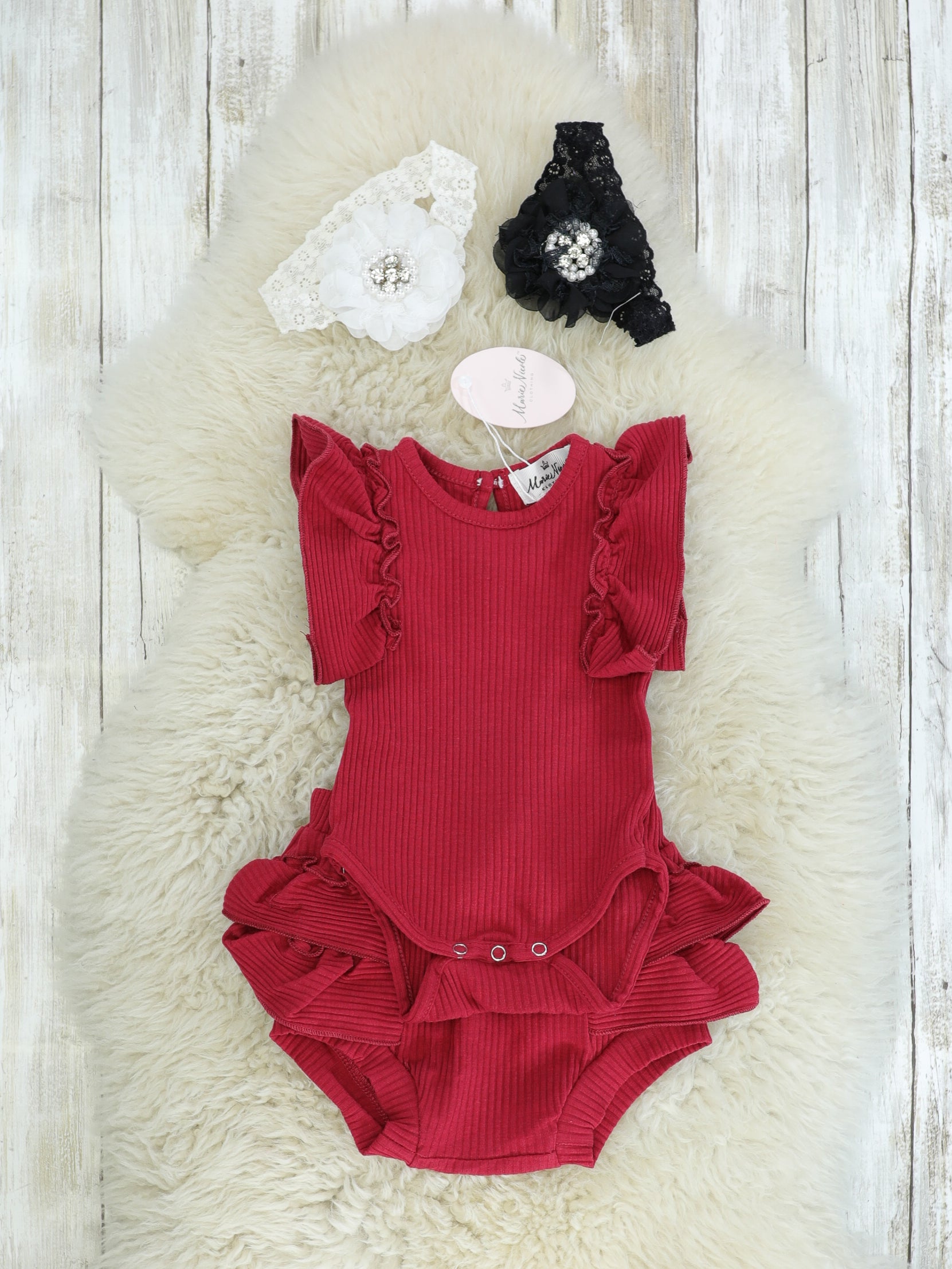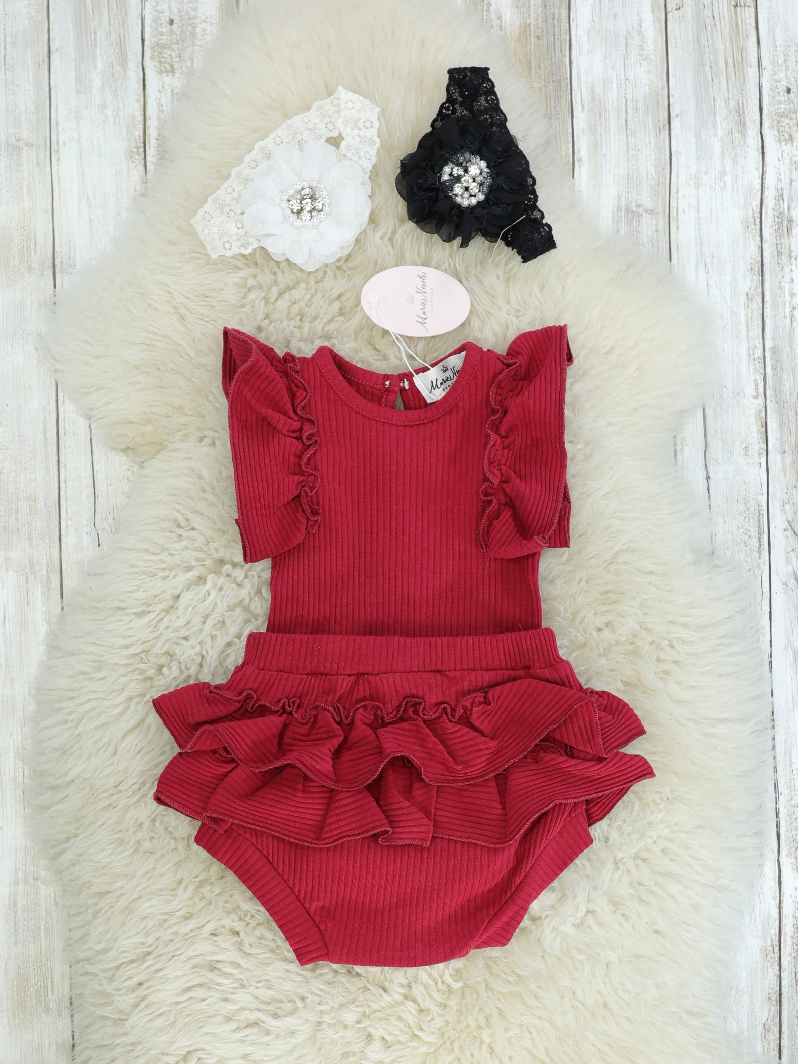 This classic ruffle top and bloomer set is perfect for days on the go. The top features a ruffle sleeve with a back button for easy on and off and matching front tie ruffle bloomers.