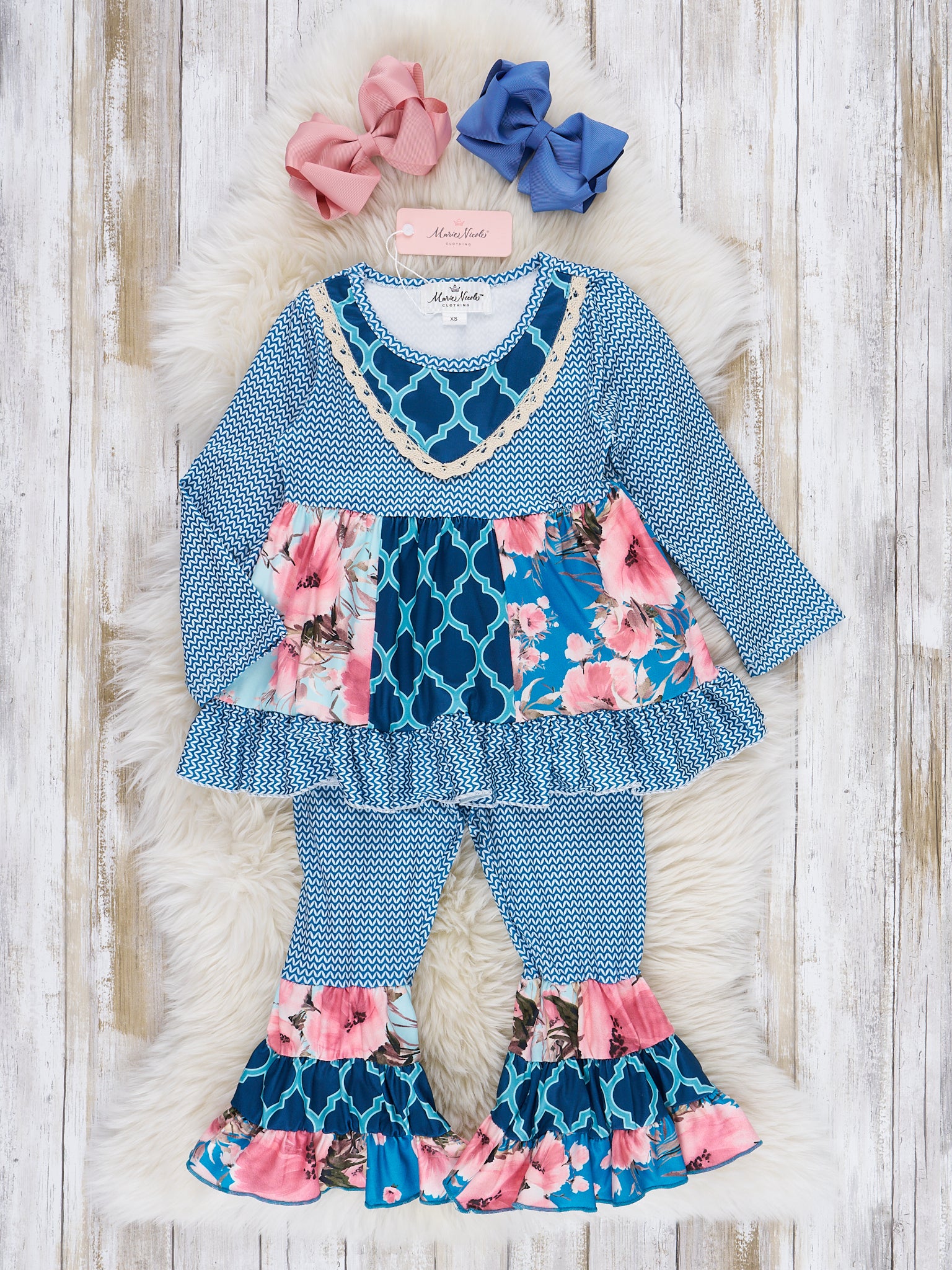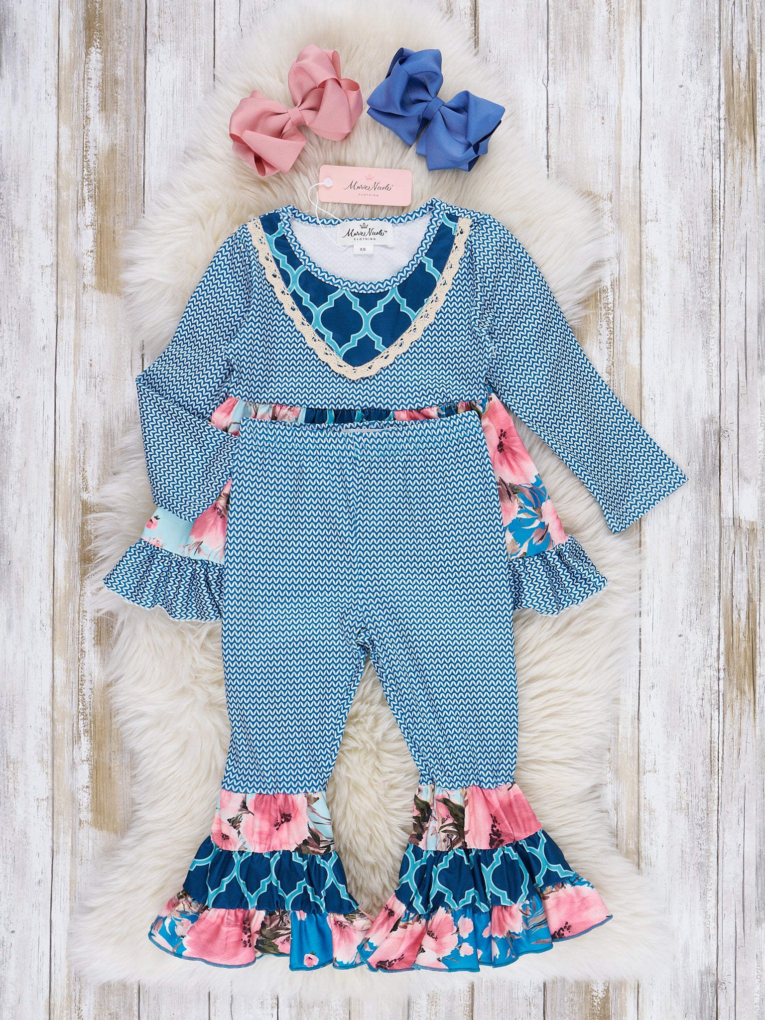 A beautiful outfit for your bold girls! This outfit features a blue top with stunning florals, moroccan details, ruffles, & matching bell bottoms.