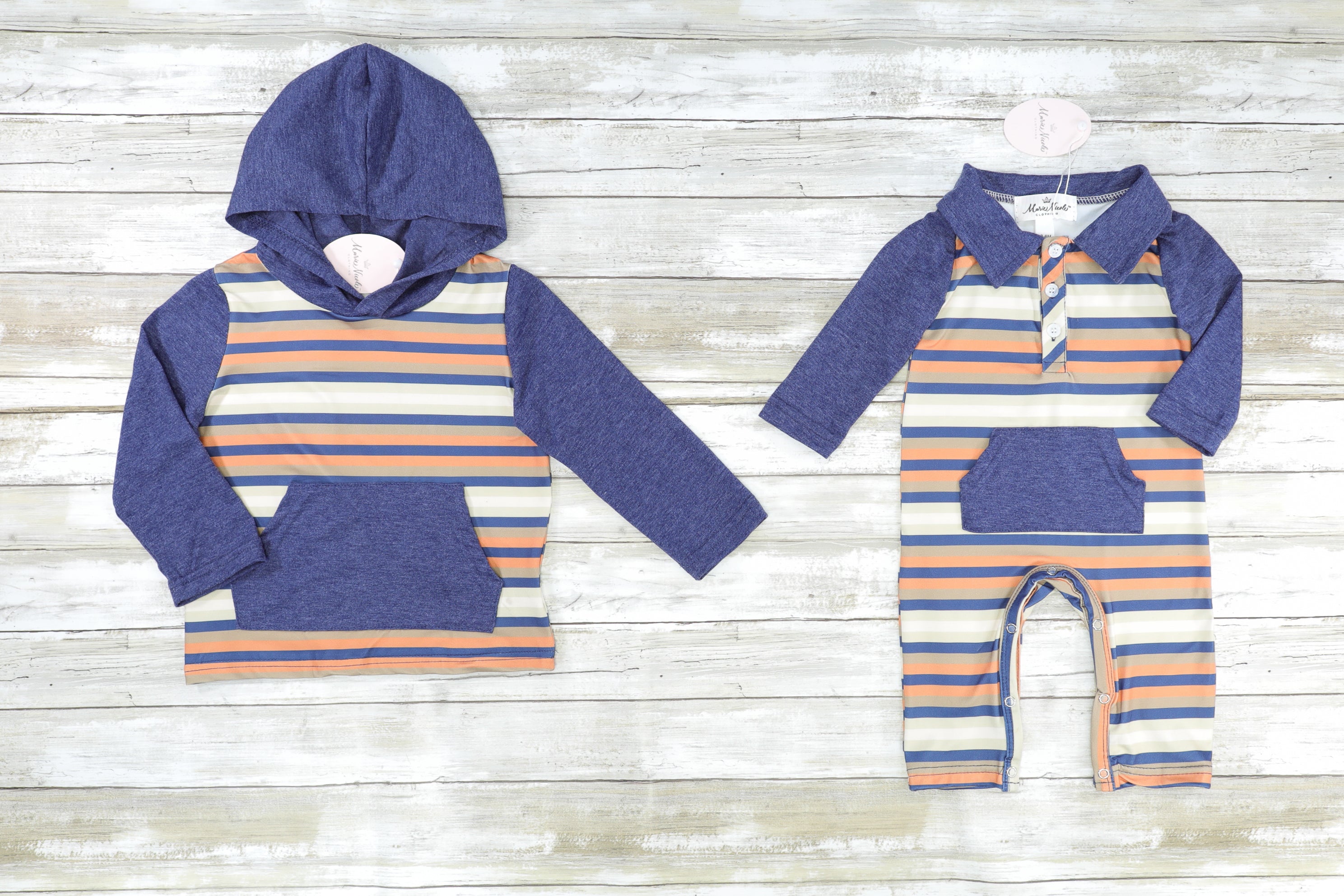 This lovely brother set is perfect for fall! This striped polo romper features navy raglan sleeves, functioning buttons, & a front pocket.