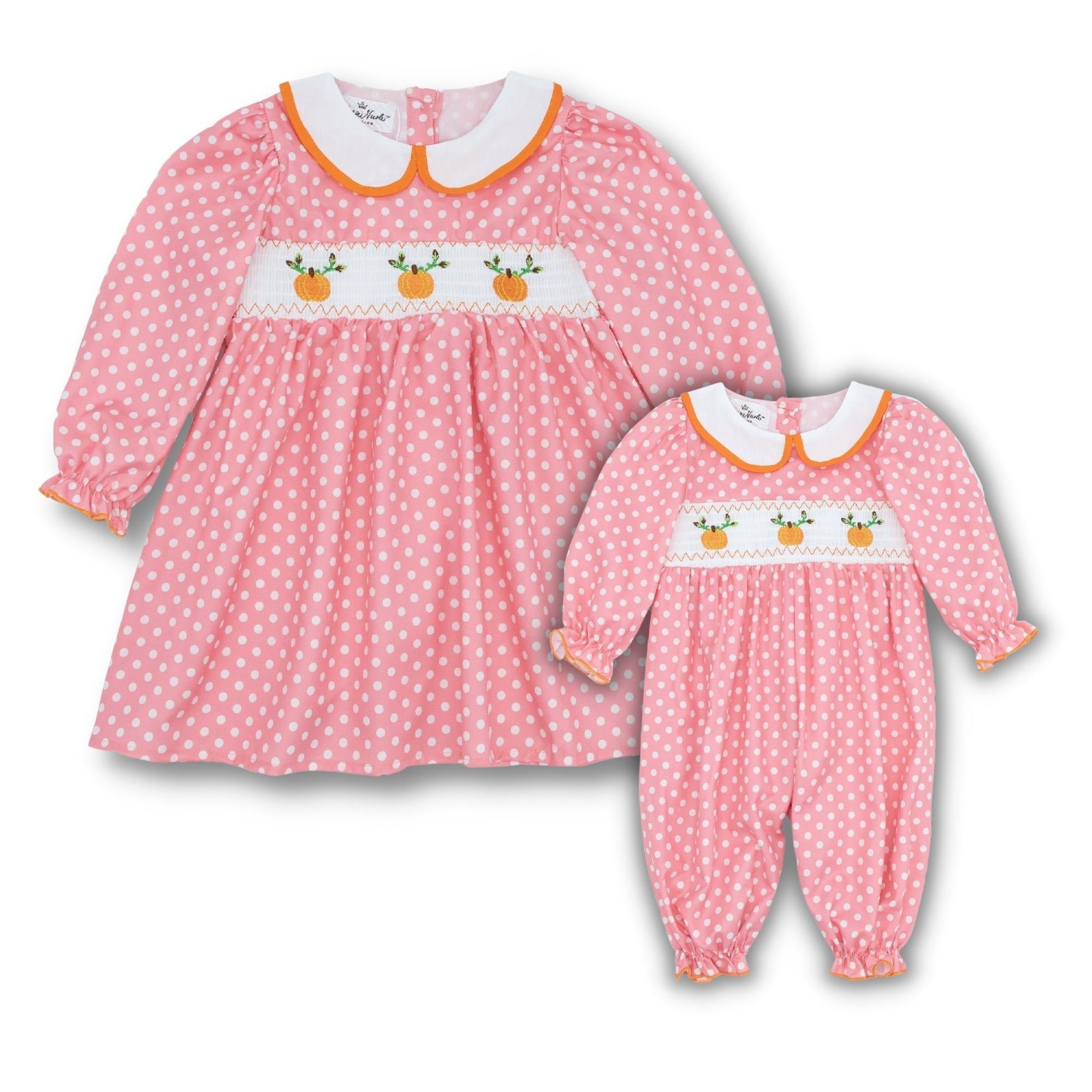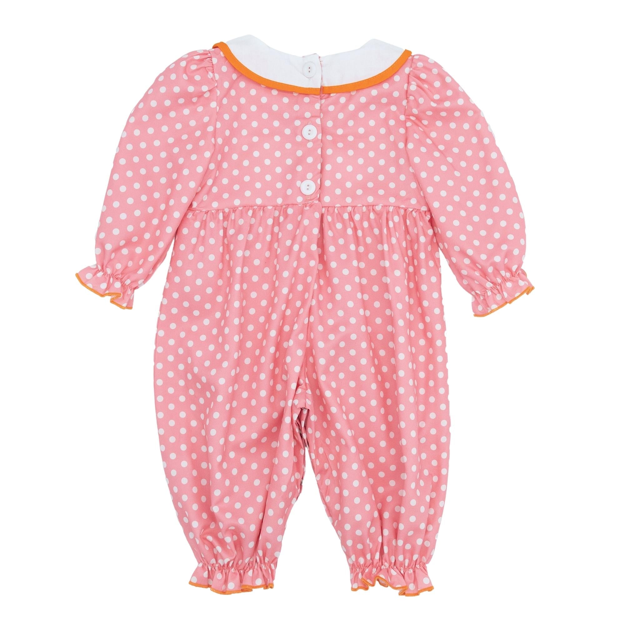 Head to the pumpkin patch with your girls in this charming set! This pink romper features smocking across the chest, embroidered pumpkins, polka dots, a peter pan collar, & cinches at the wrists and ankles.