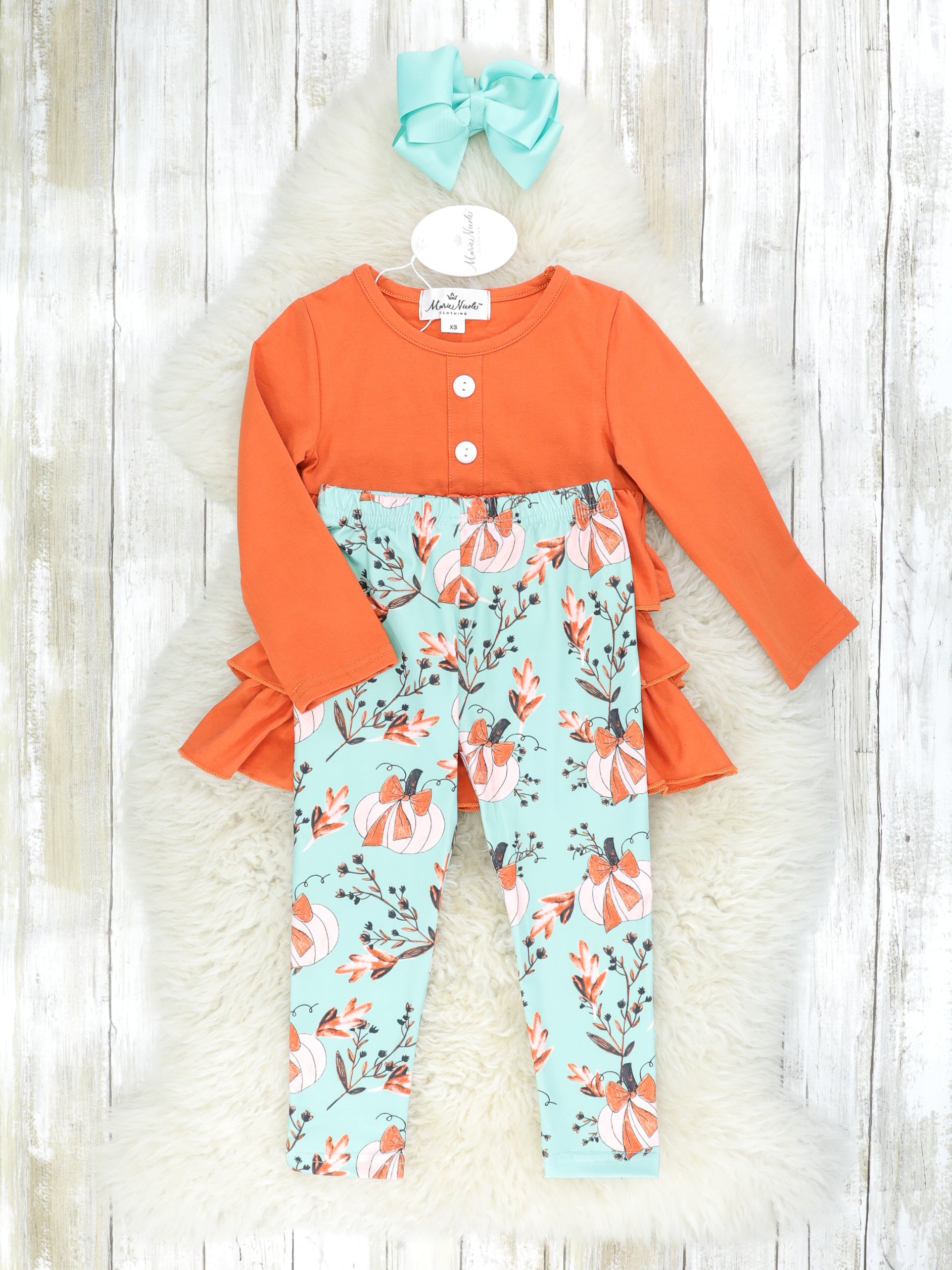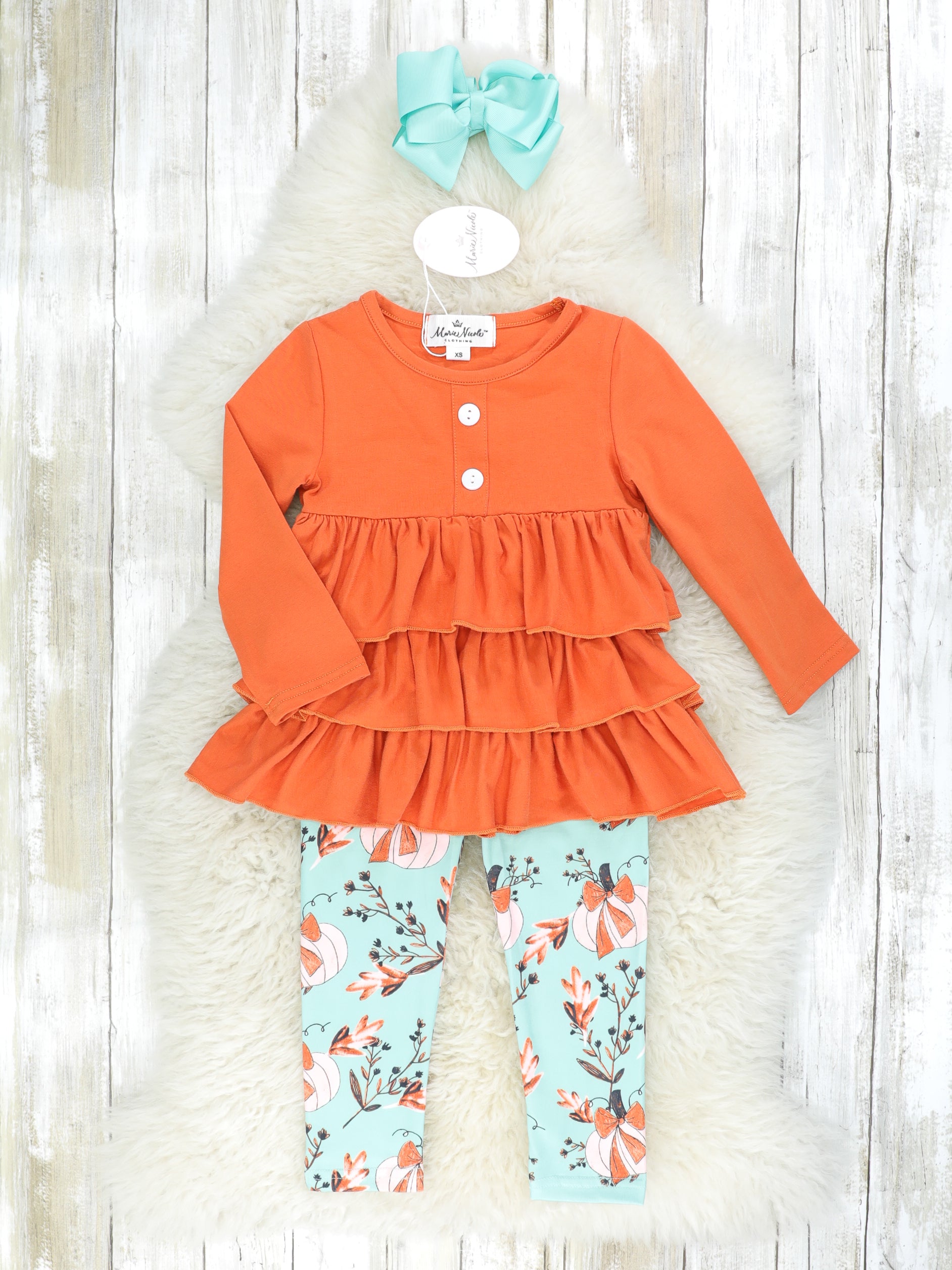A darling outfit for any fall day! This outfit features a burnt orange tunic with tiered ruffles & decorative buttons. The stunning pumpkin leggings have a matching scarf & provide full coverage for fall days!
