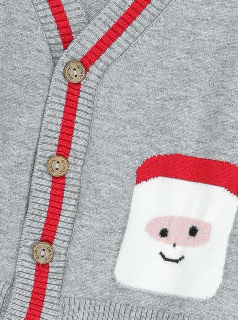 Watch your kiddos Claus a scene in this dashing sweater! This grey sweater features functioning buttons, red trim, & jolly Santa details.