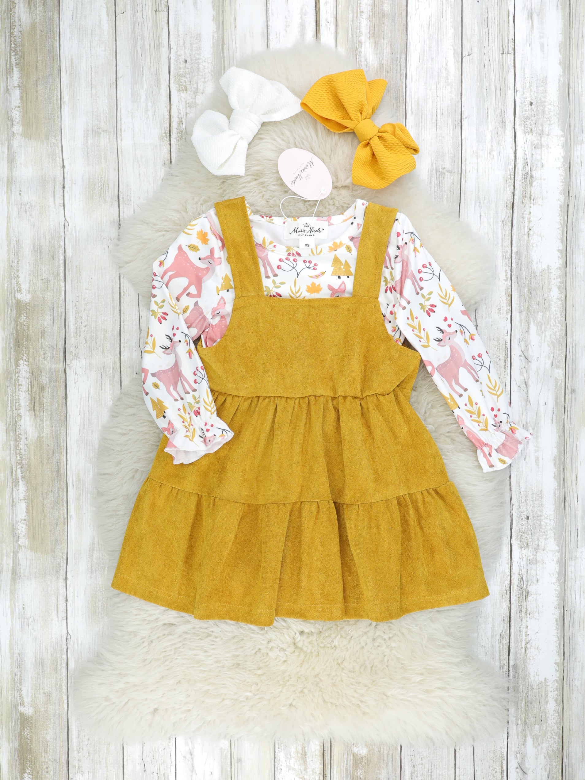 Mustard Suede Dress & Deer Ruffle Top Set