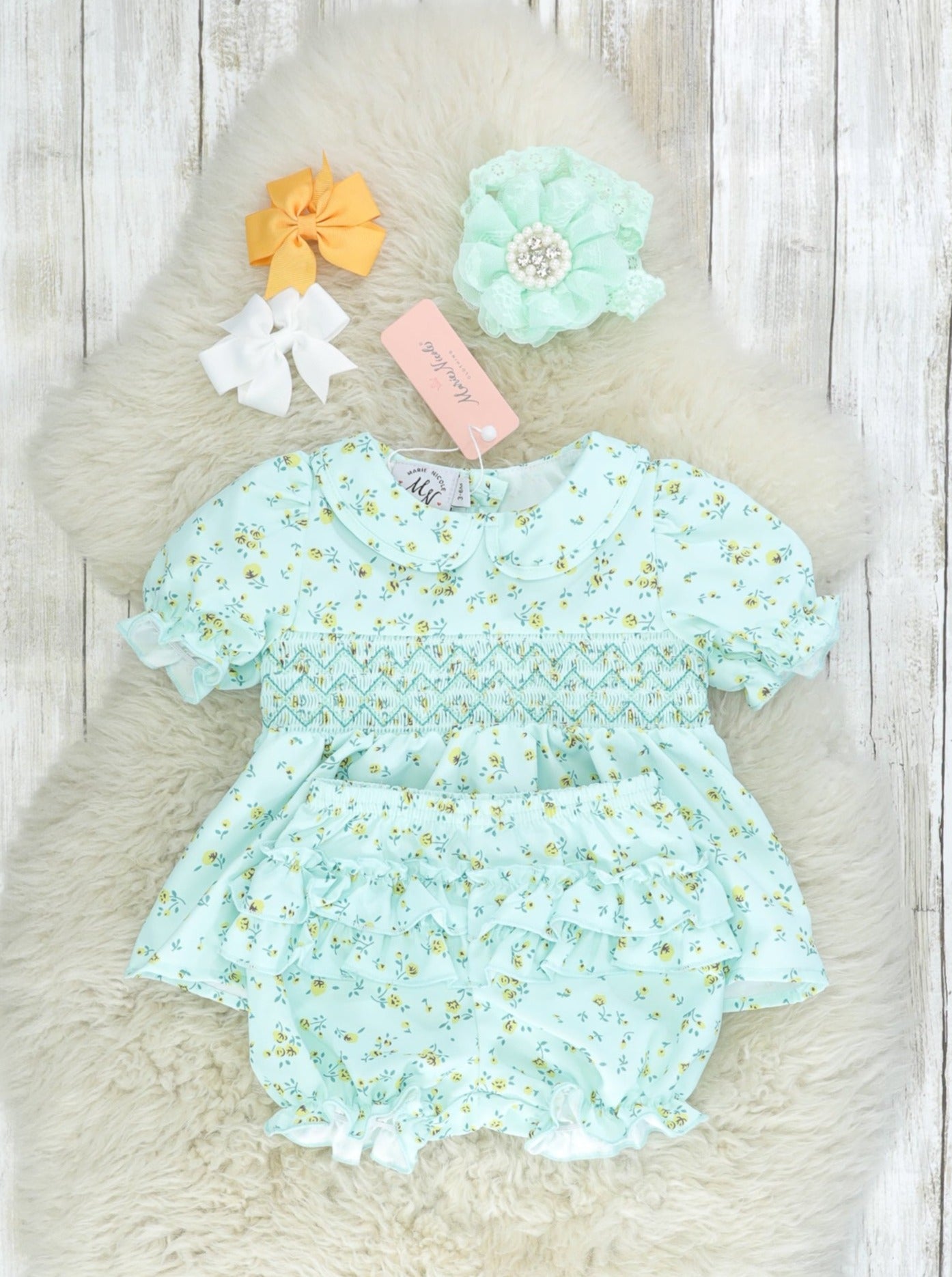 A precious outfit for your dainty girls! This mint outfit features stunning florals, smocking, embroidered details, a peter pan collar, & a ruffle butt on the bloomers.