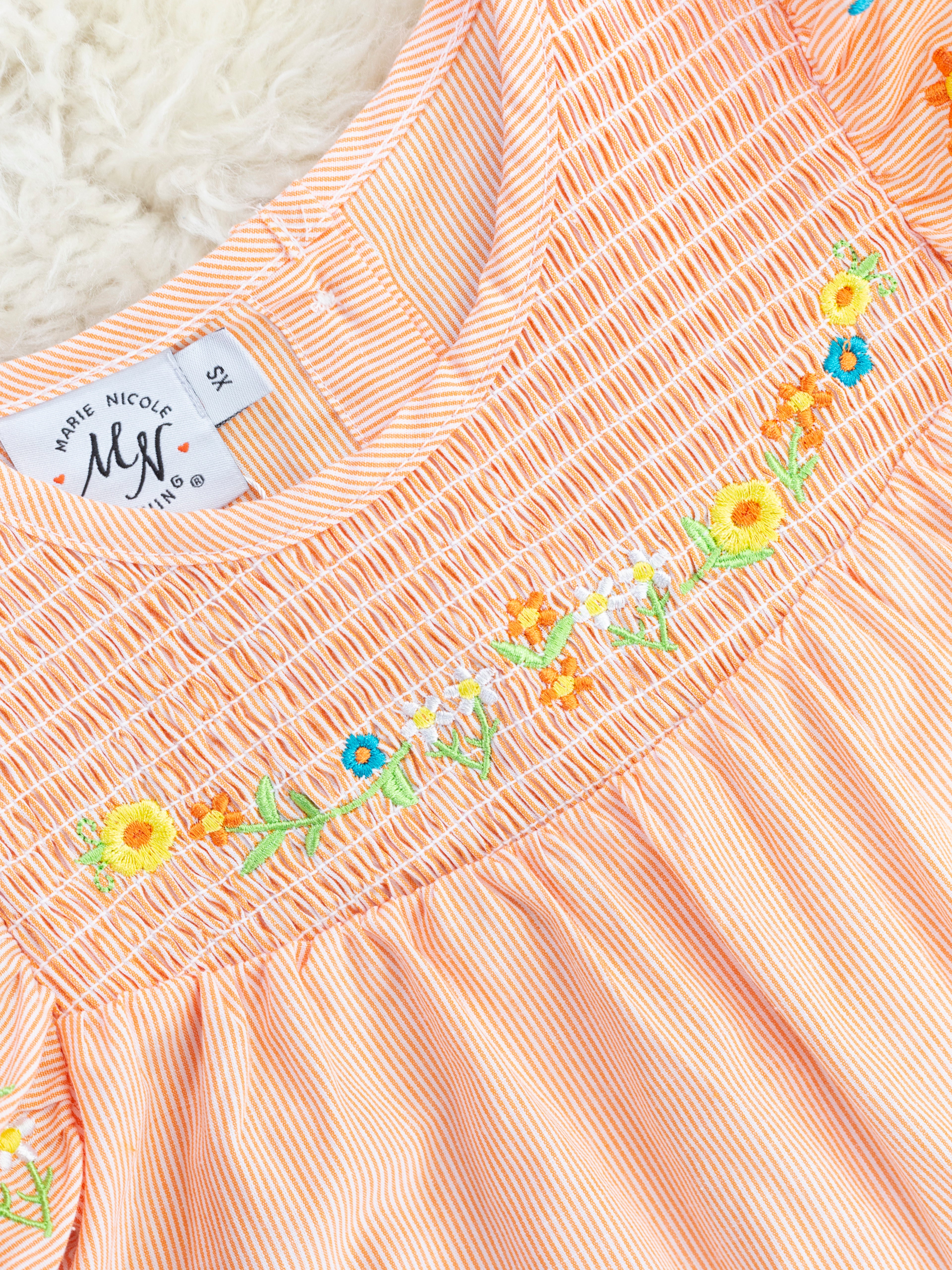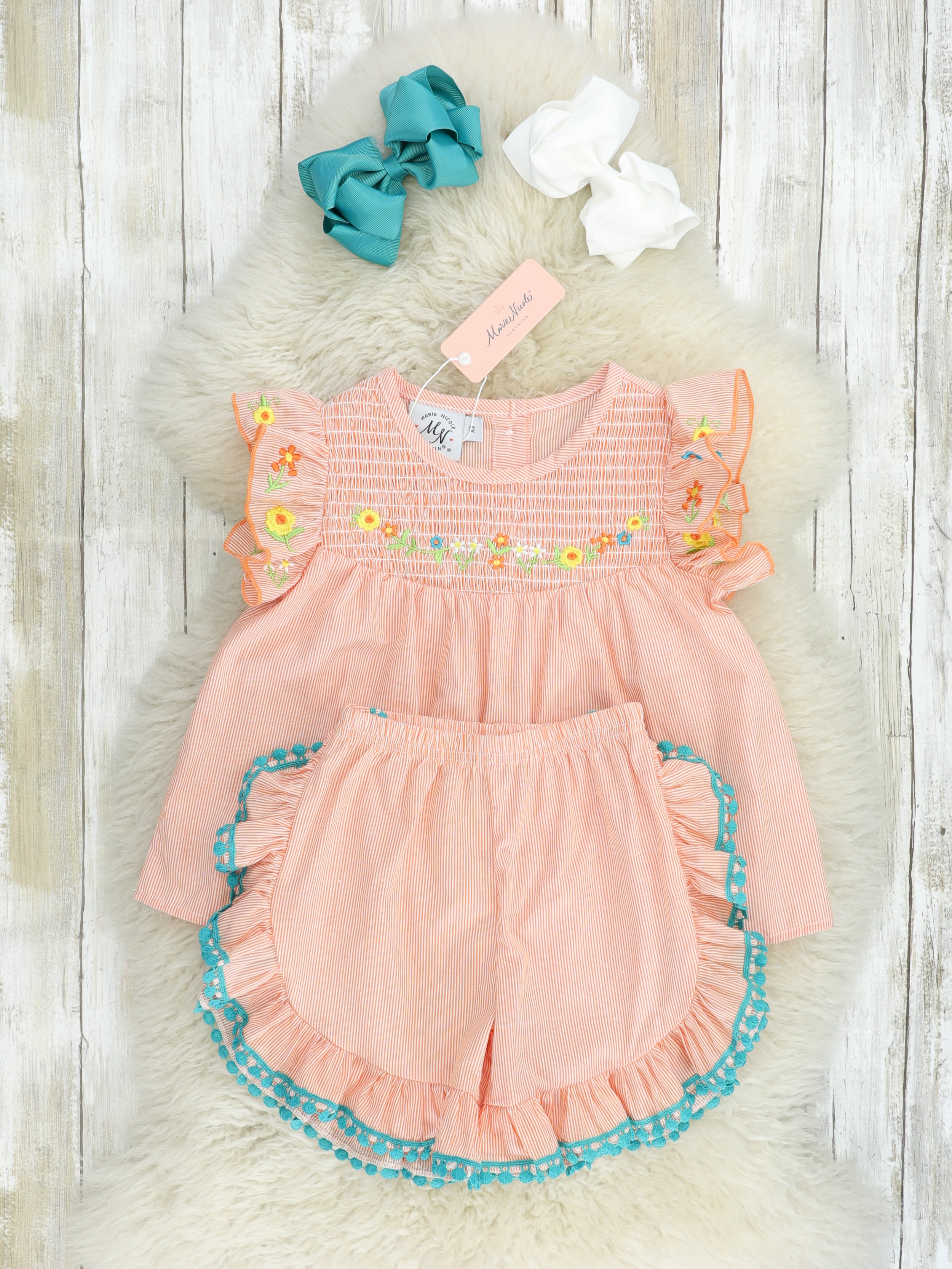 A sweet smocked outfit for your gal pal! This outfit features an orange tunic with smocking, embroidered florals, flutter sleeves, & matching ruffle shorts with pom pom trim.