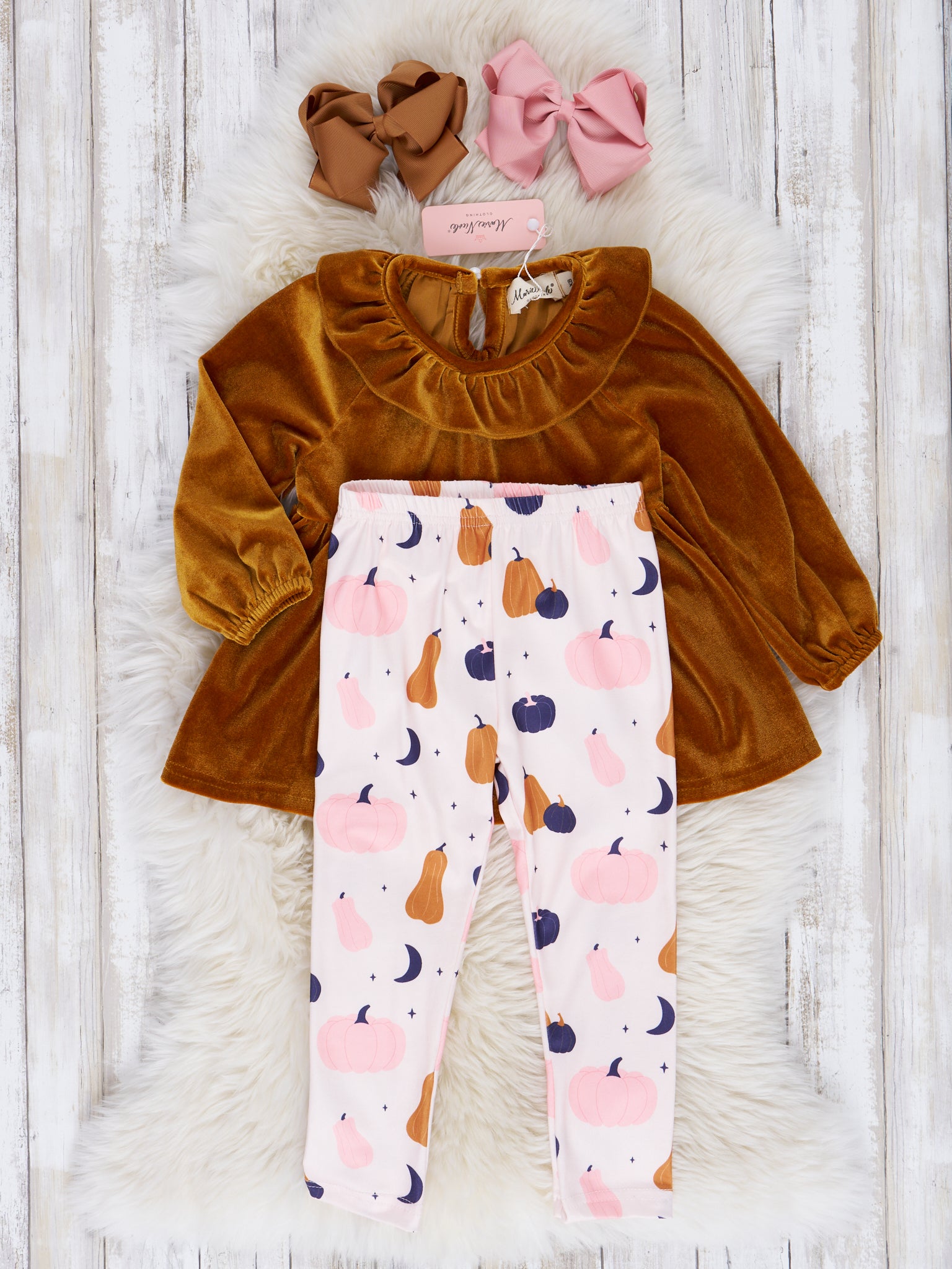 Look chic and seasonally-appropriate in this Bronze Gourds Velvet Outfit! It'll totally up your style game with its luxe velvet fabric and unique pumpkin print leggings that are sure to turn heads. Fancy up the ensemble with a ruffle collar, and prepare to make a statement that is sure to be the 'gourd' of the party!