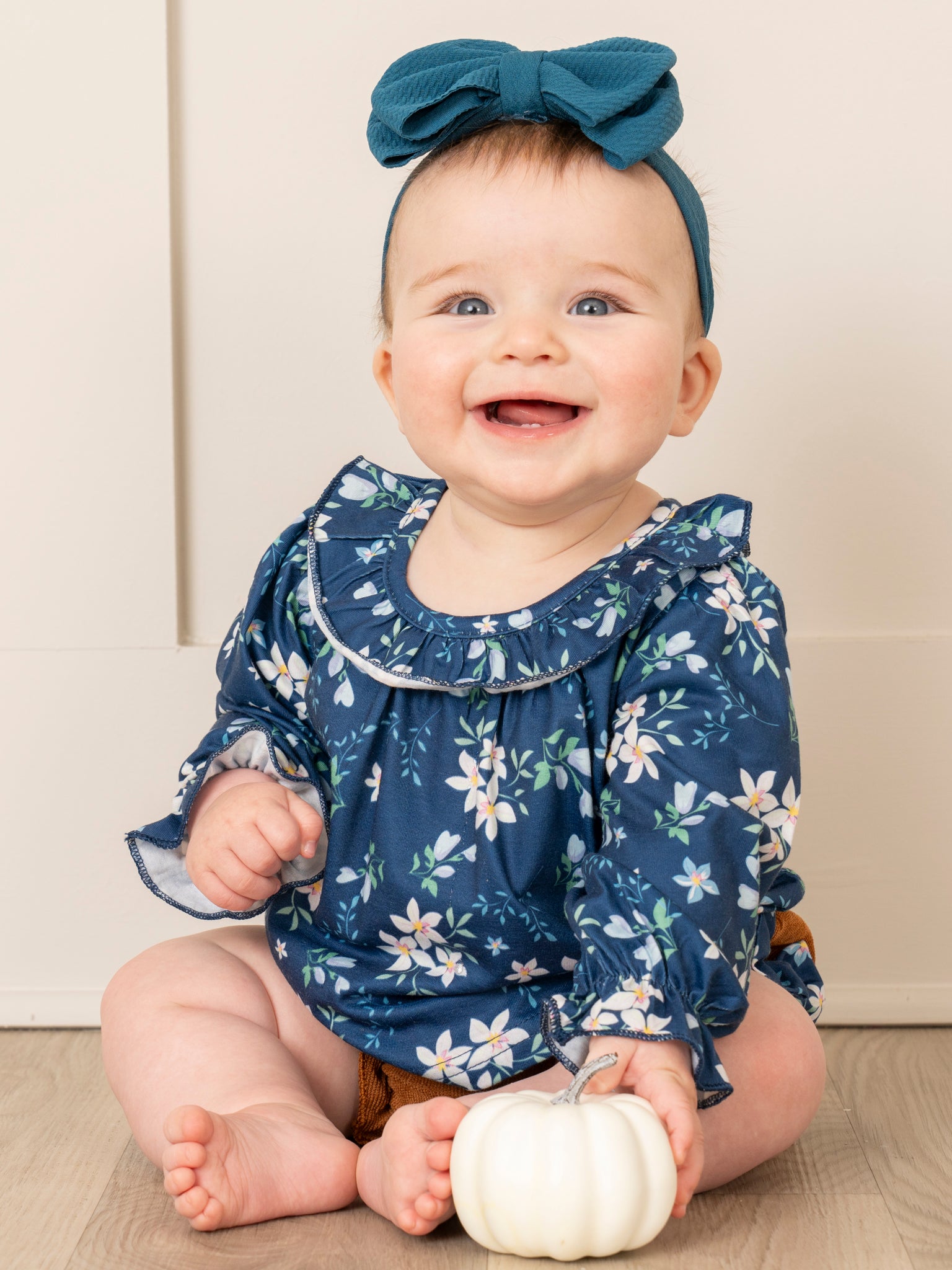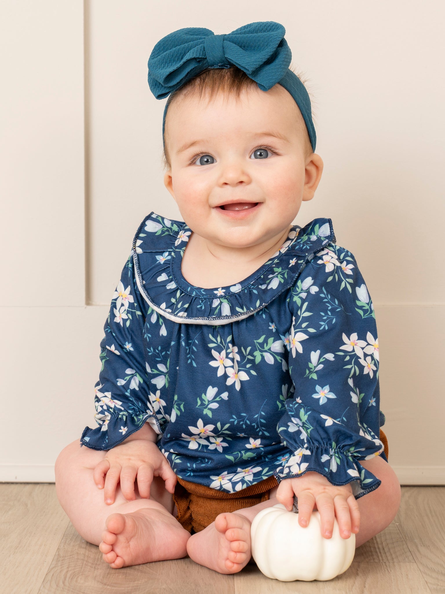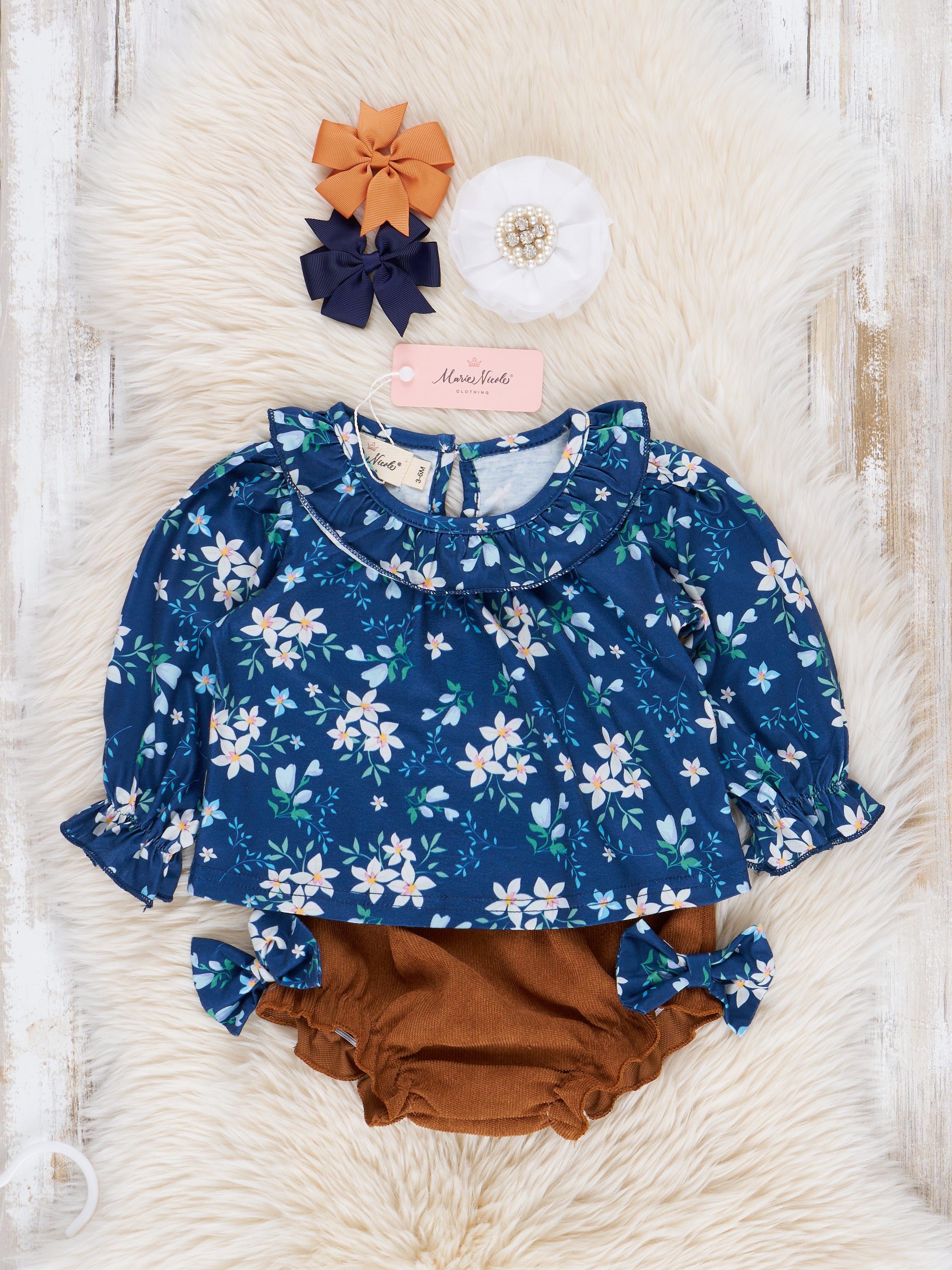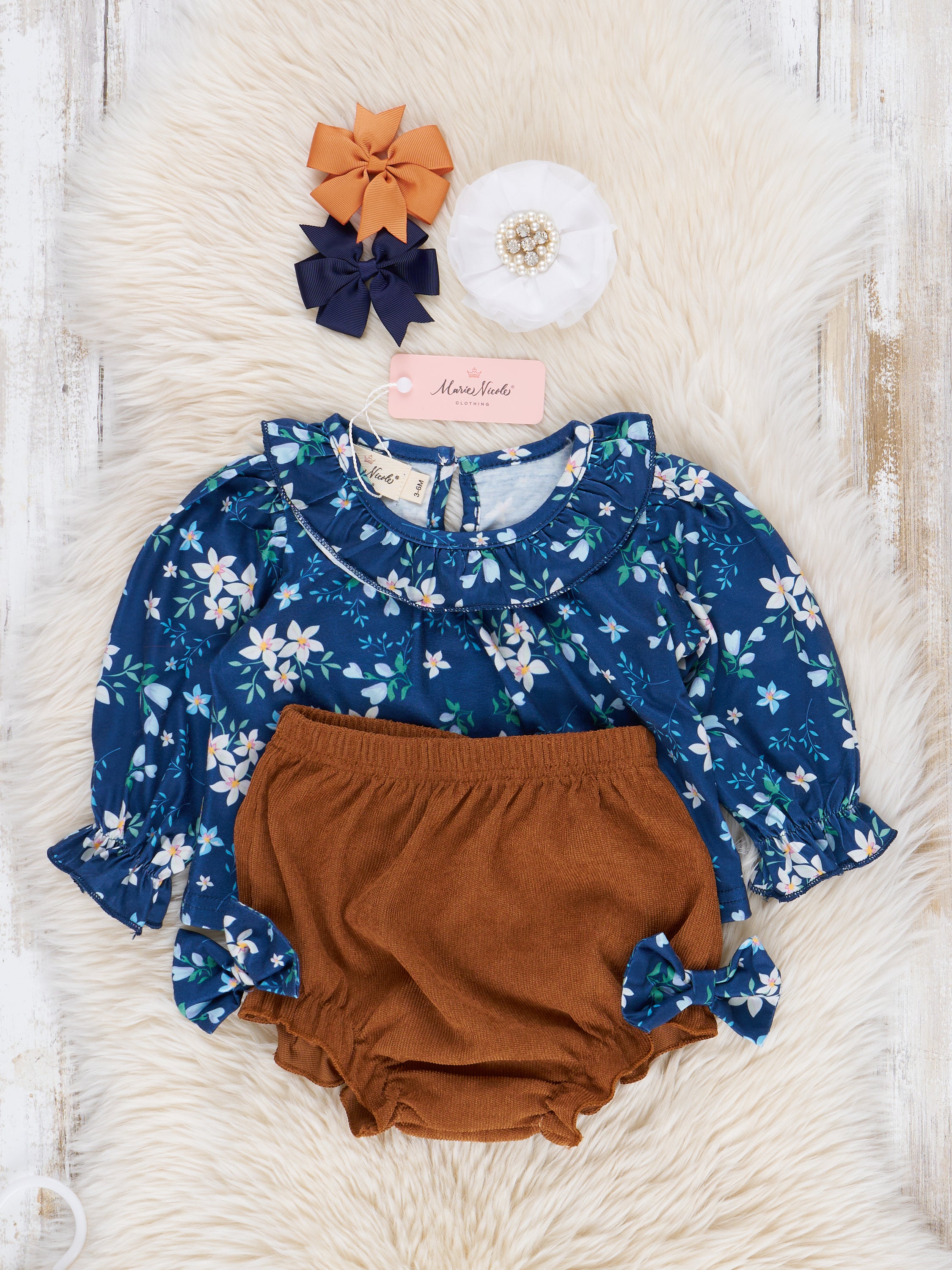 Get ready to bloom in style with our Blue Blooms & Corduroy Bloomers Outfit! This adorable girls outfit features brown bloomers and a blue floral long sleeve shirt - perfect for fall. Let your little one stand out with this playful and quirky outfit! Shop the matching sister set!