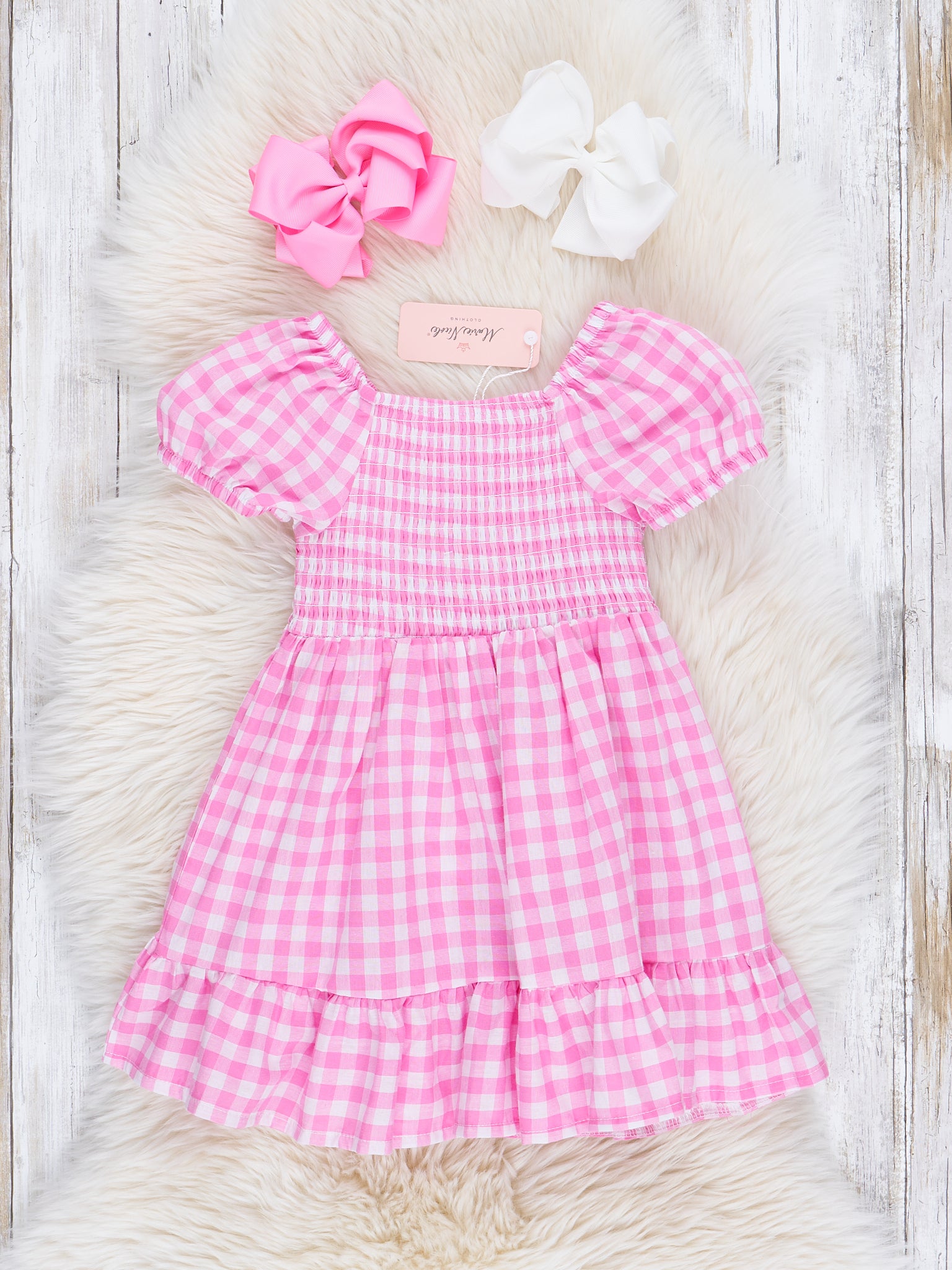 Brighten up your wardrobe with this charming Hot Pink Gingham Smocked Ruffle Dress! Boasting a playful gingham print, a flattering smocked bodice, and cute puff sleeves, this dress is the perfect combination of playful and stylish. Perfect for any event on your spring calendar, add a touch of fun to your look with this dress!