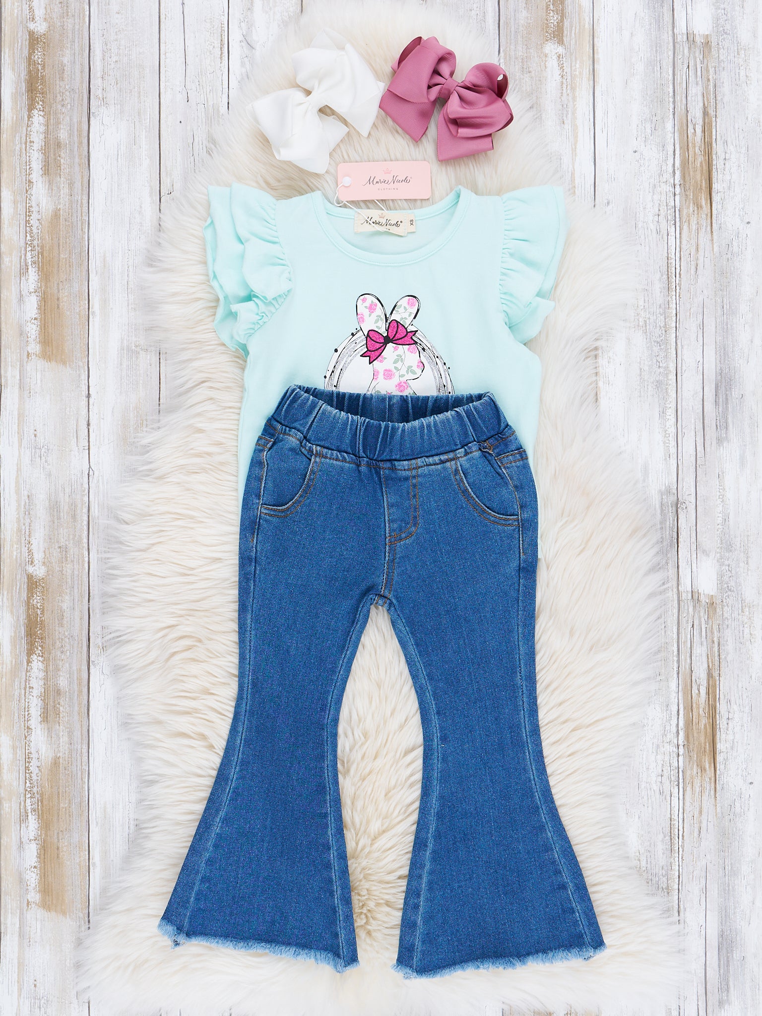 Hop into style with this mint blue bunny outfit featuring a ruffle tee with a charming floral bunny design and flared jeans with a playful frayed hem. Perfect for Easter or any day, this fun and quirky outfit will have your little one looking hoppy and fashionable!