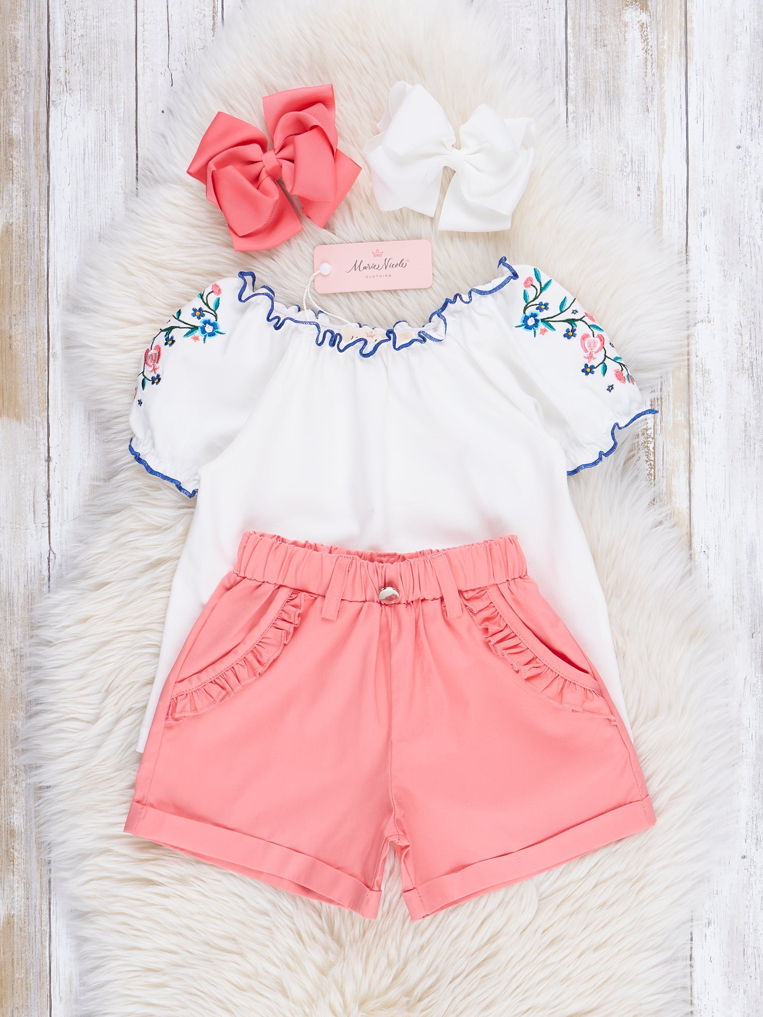 Make a statement with this playful Coral Embroidered Florals Shorts Outfit! Featuring intricately embroidered florals on the top and coral shorts, this outfit is perfect for any occasion. Show off your unique and fun style with this trendy ensemble.