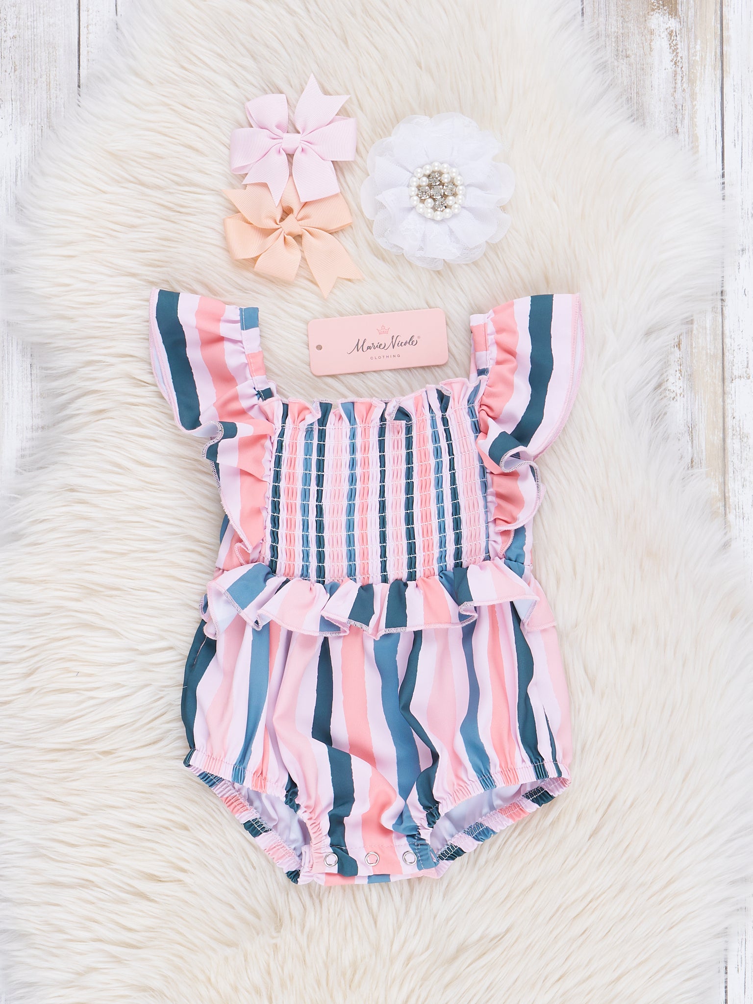 Navy & Rose Stripes Smocked Ruffle Bubble