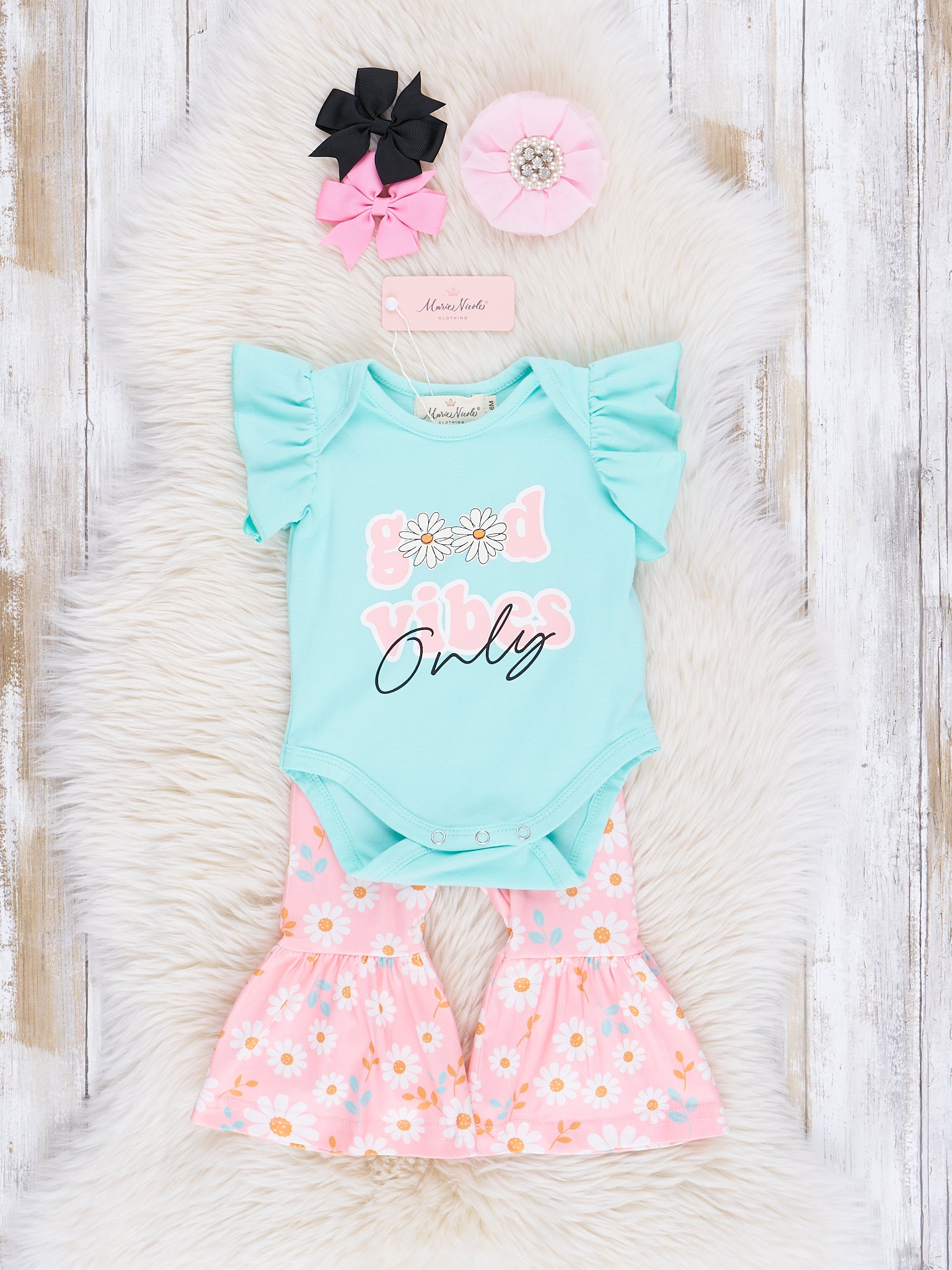 Teal & Pink Floral Good Vibes Bell Bottoms Outfit
