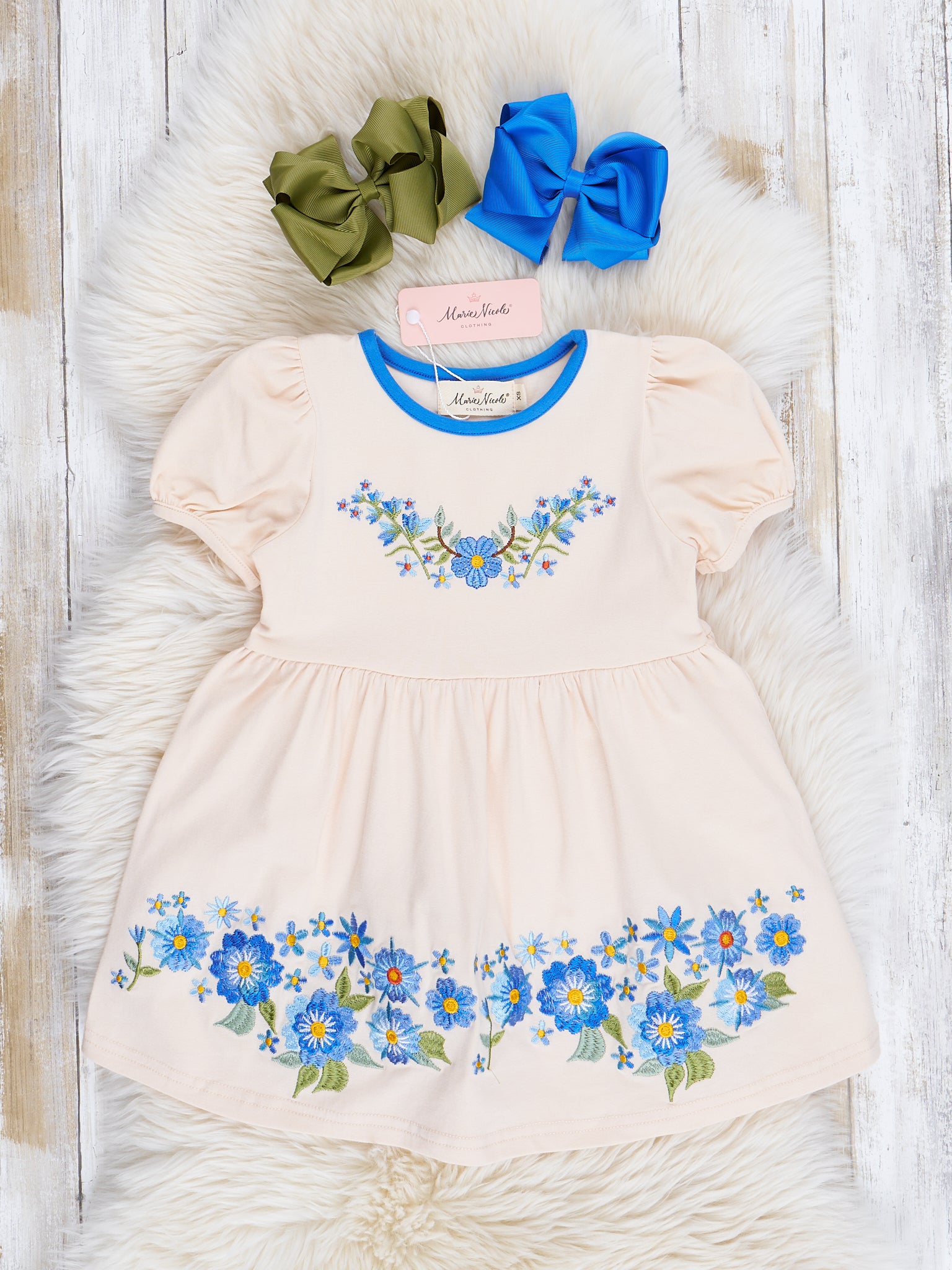 Sweet and charming, this Cream & Blue Embroidered Garden Dress is perfect for any little girl. Made with soft fabric and adorned with dainty bouquets, it features a cinched waist and leg openings for a comfortable fit. Complete the look with the matching sister set for an adorable duo.