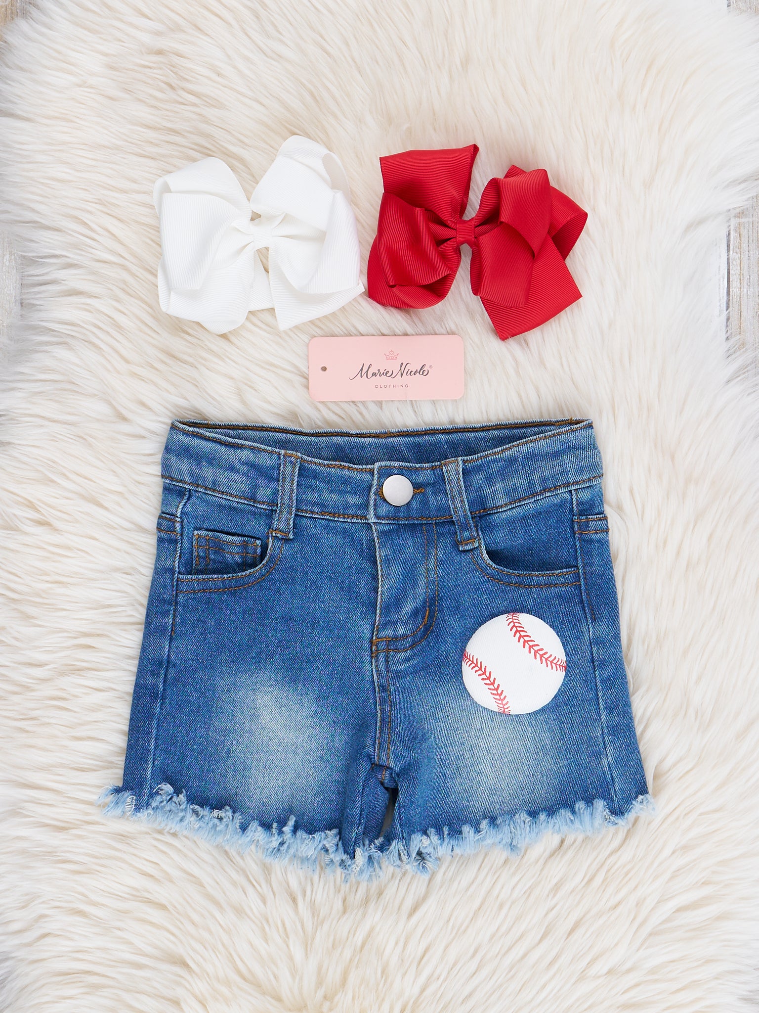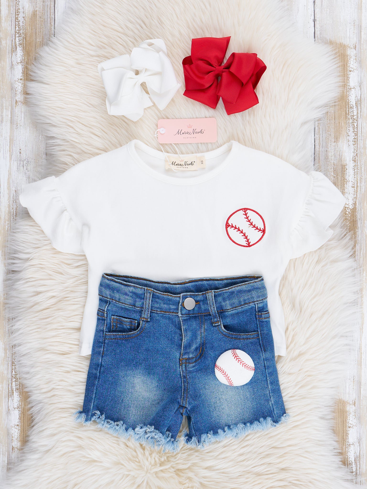 Batter up! ⚾️ This Embroidered Baseball Denim Shorts Outfit is perfect for your little one! It features a white ruffle sleeve top with an adorable embroidered baseball and frayed hem denim shorts. Your little fashionista will surely stand out in this stylish and playful outfit!