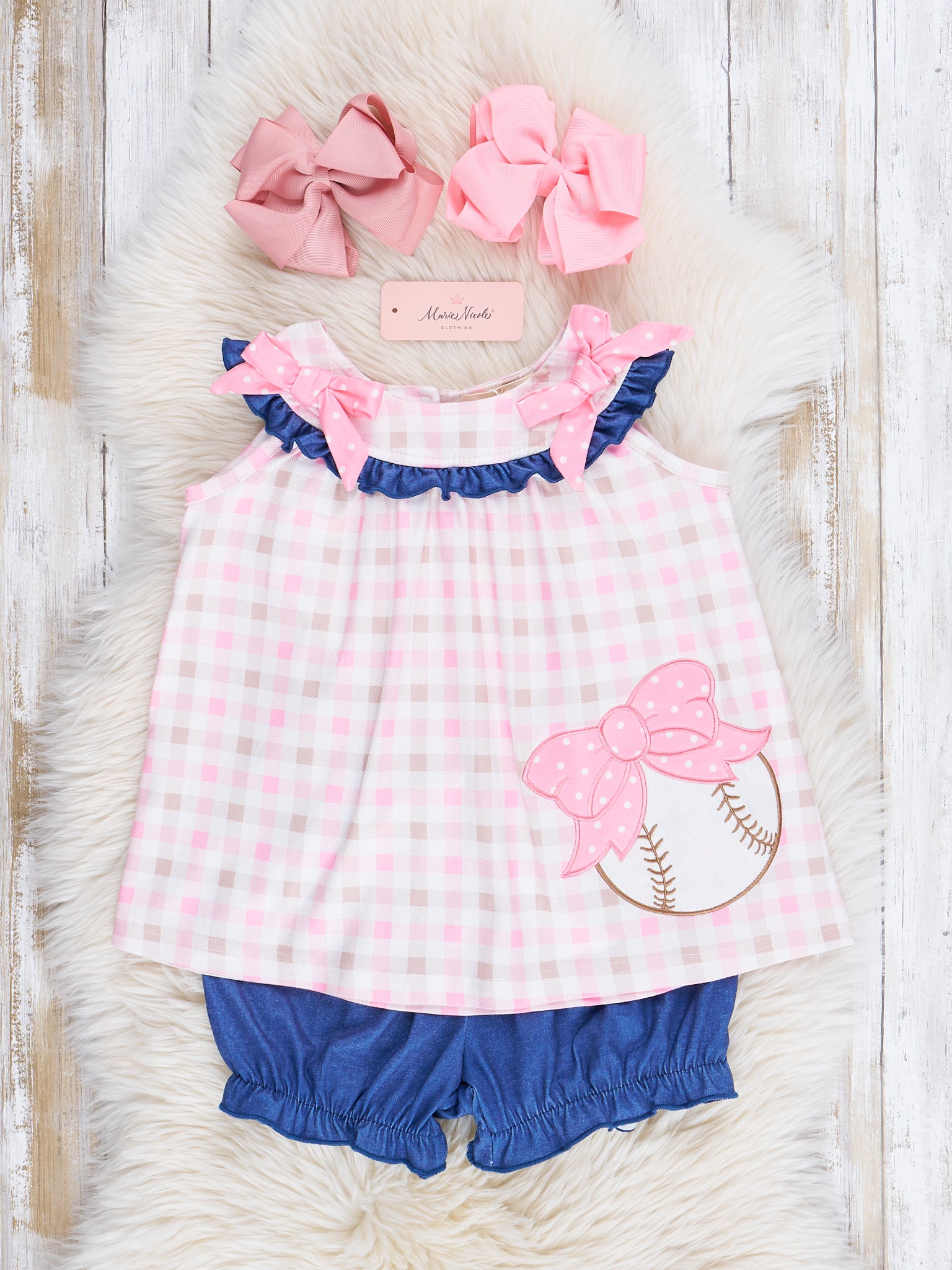 Pink & Navy Gingham Embroidered Baseball Ruffle Outfit