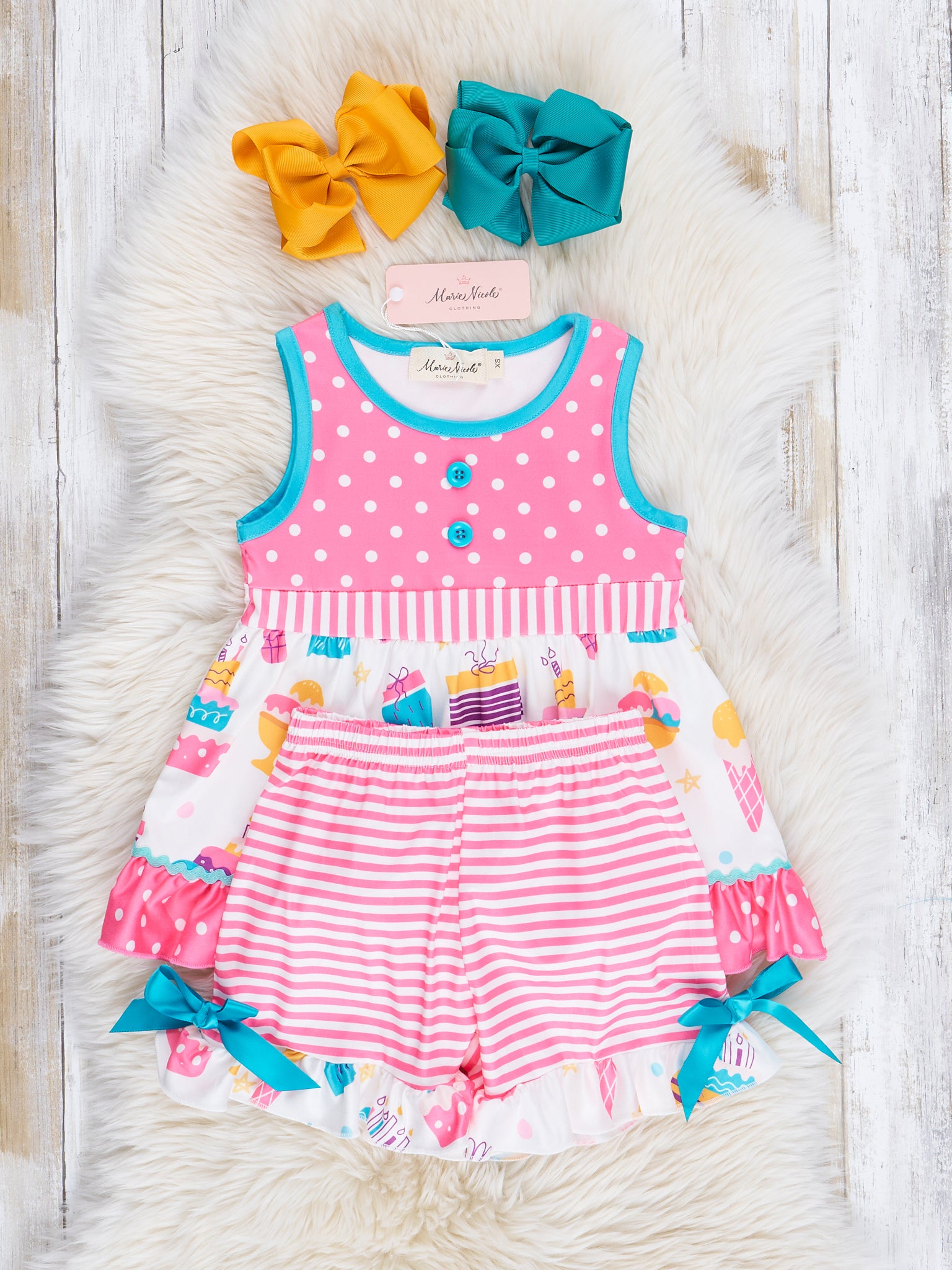 Get ready to party with our Pink Party Treats Outfit! This adorable outfit features playful pink polka dots and ruffles, perfect for any celebration. Don't forget to snag the matching sister set for double the cuteness. Let the party begin! 🎉
