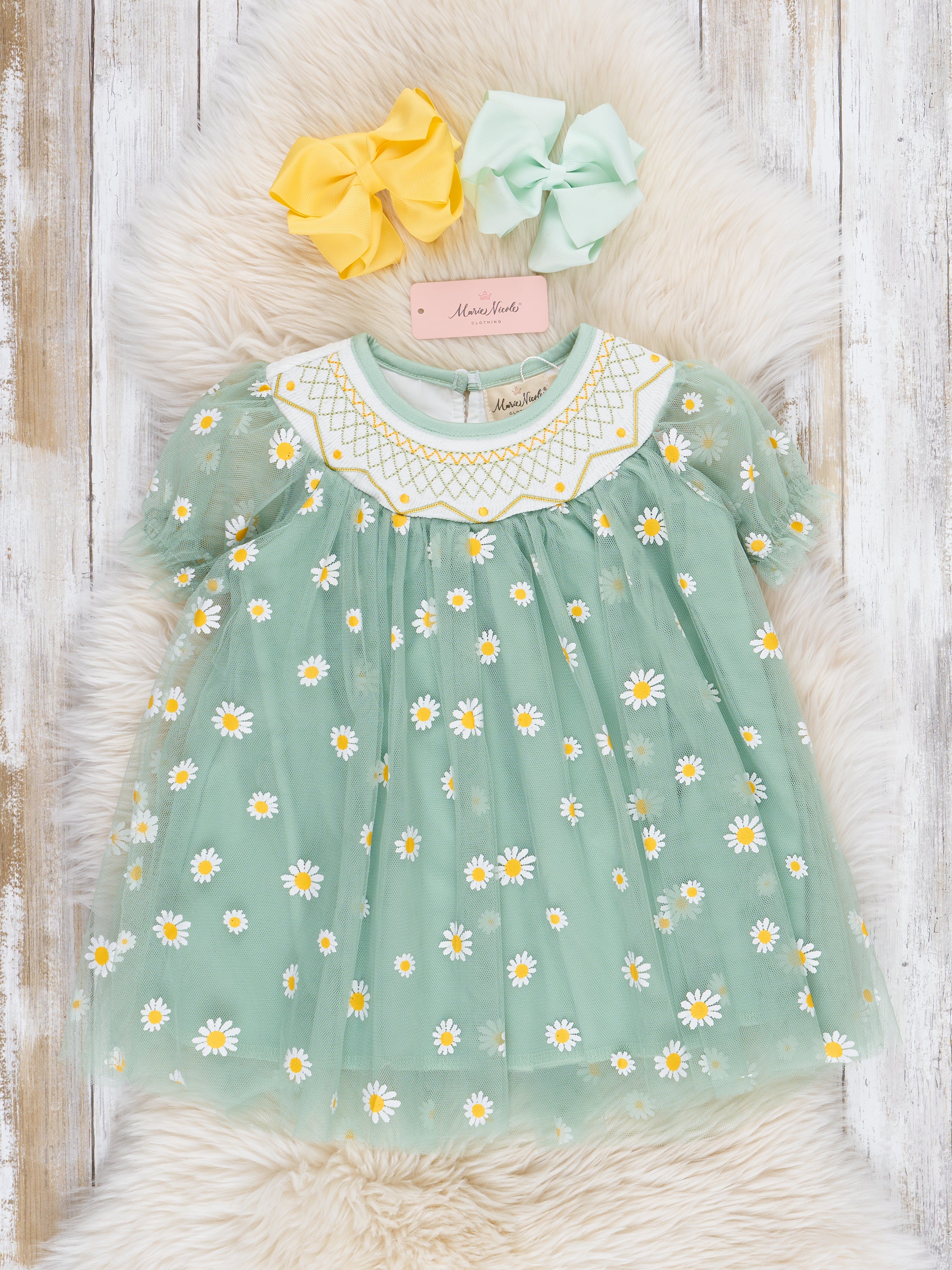 Get ready for garden adventures in our Green Smocked Garden Blooms Tulle Overlay Dress! Designed specially for MNC, this whimsical dress features a smocked collar and puff sleeves, perfectly complemented by a delicate tulle overlay with tiny embroidered flowers. Perfect for your little flower child. 🌼