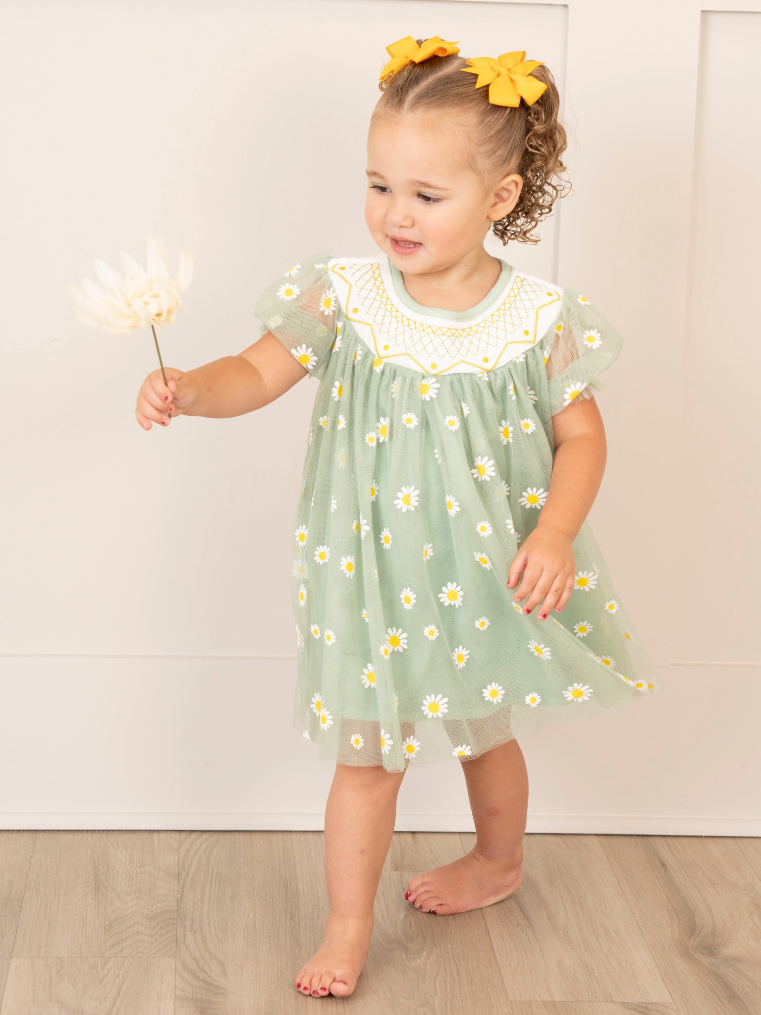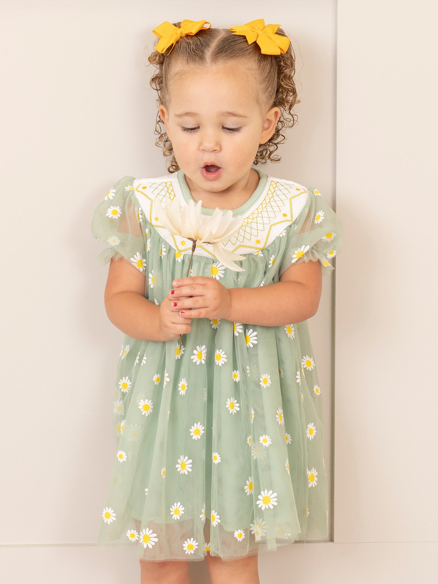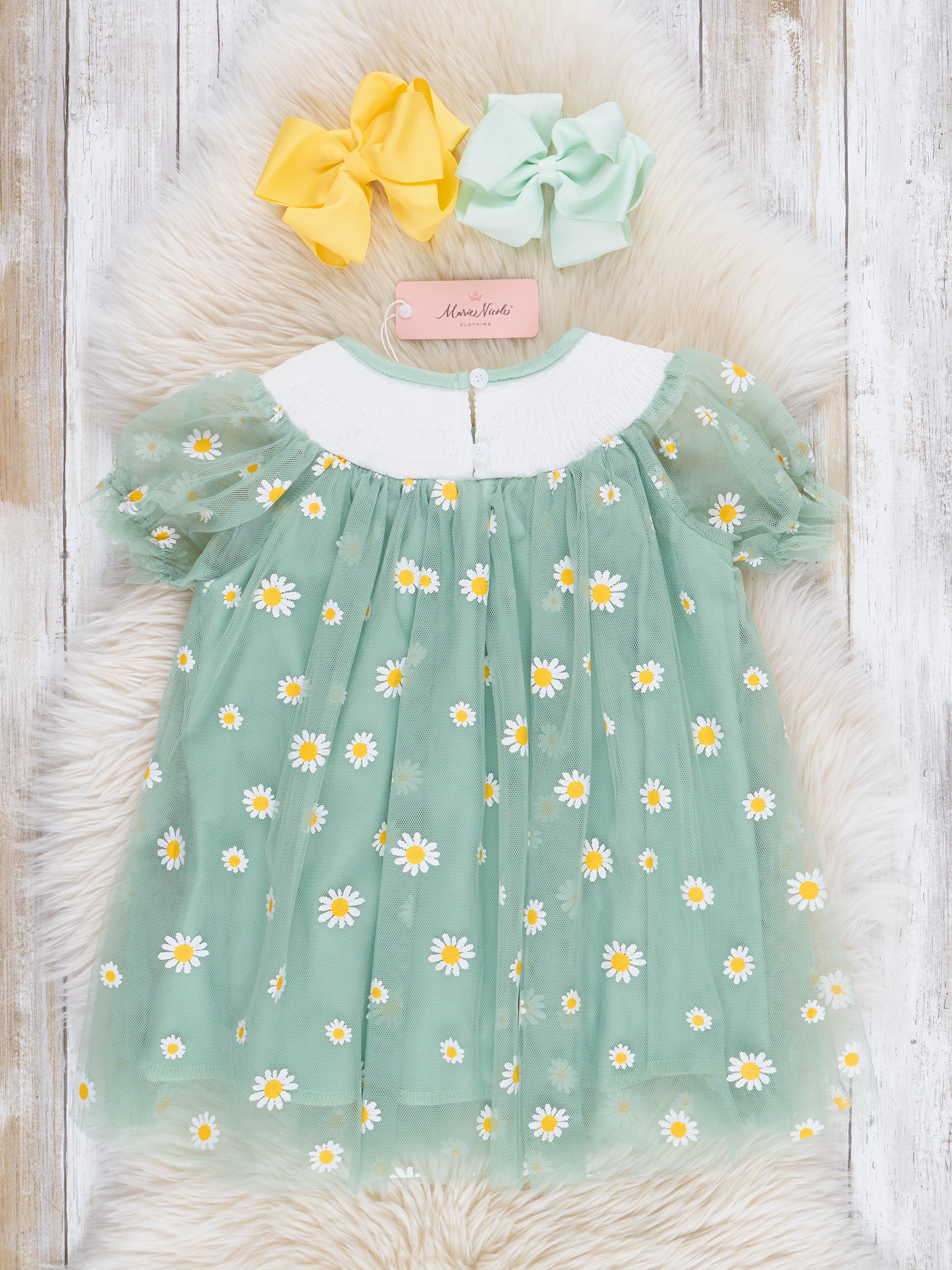 Green Smocked Garden Blooms Tulle Overlay Dress