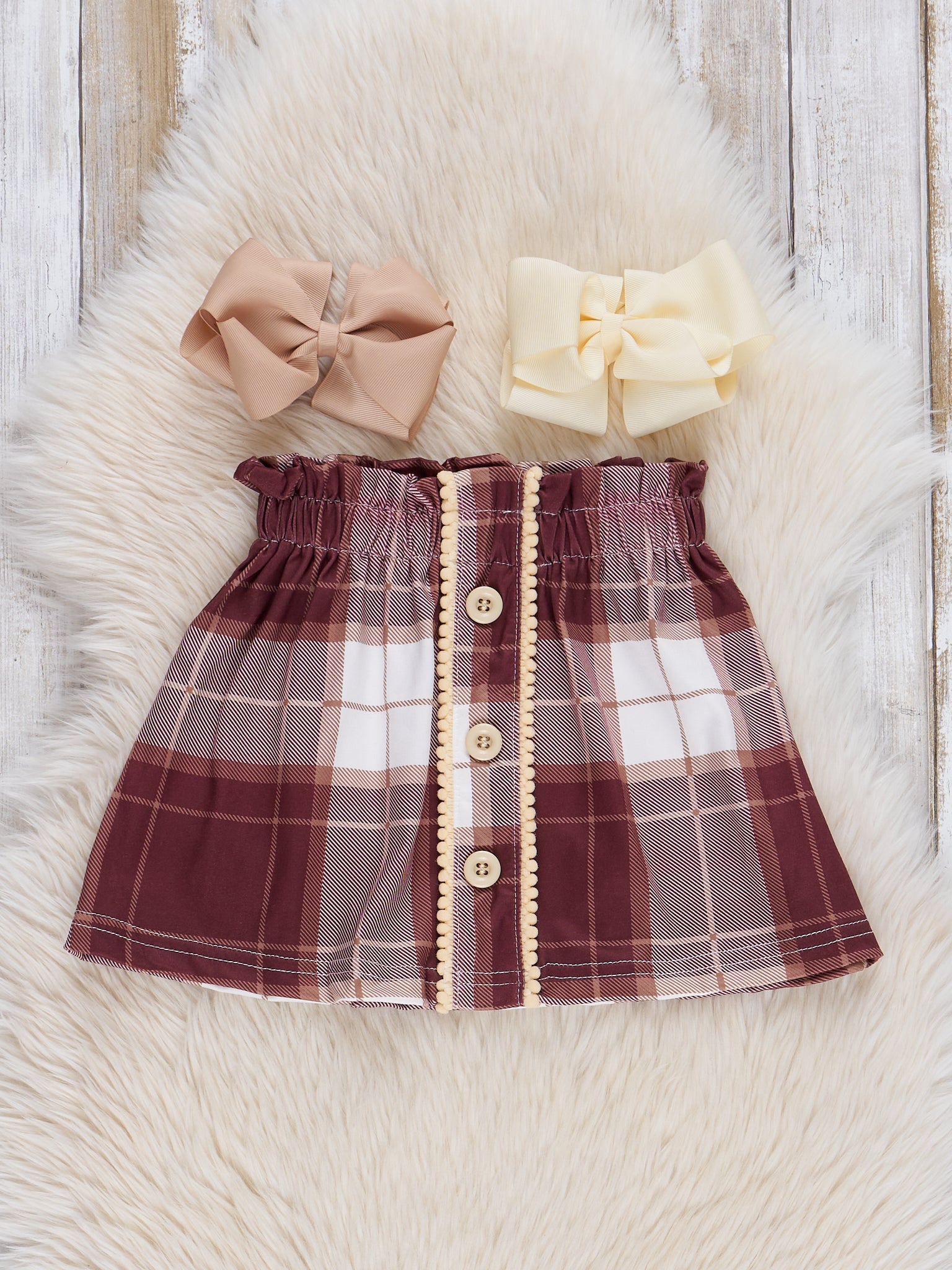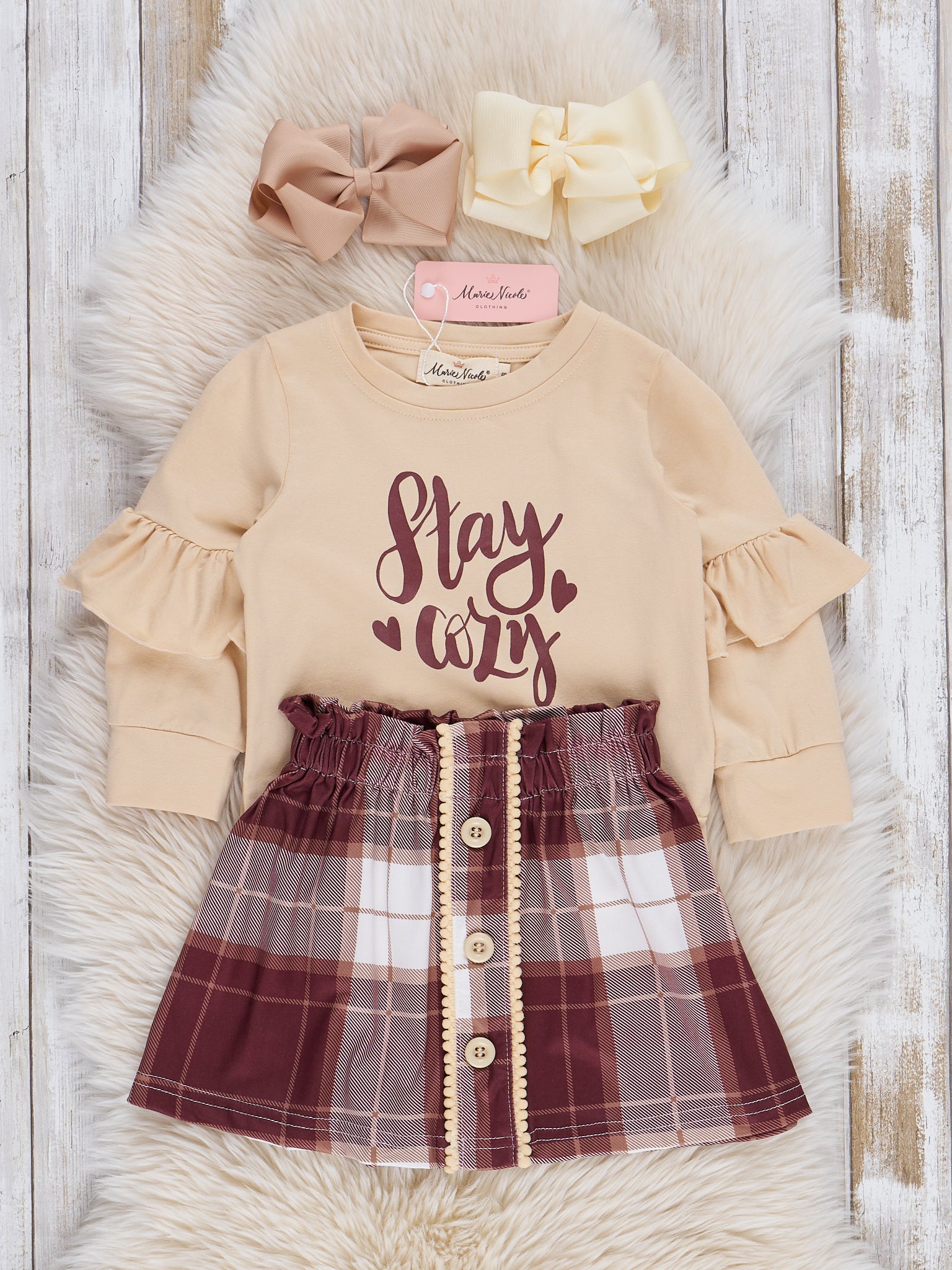 Get ready for cozy days ahead with our Brown Cozy Plaid Skirt Set! This adorable girls outfit includes a tan ruffle sleeve top with the playful phrase "Stay Cozy" and a brown plaid button front skirt. Stay stylish and warm all season long.