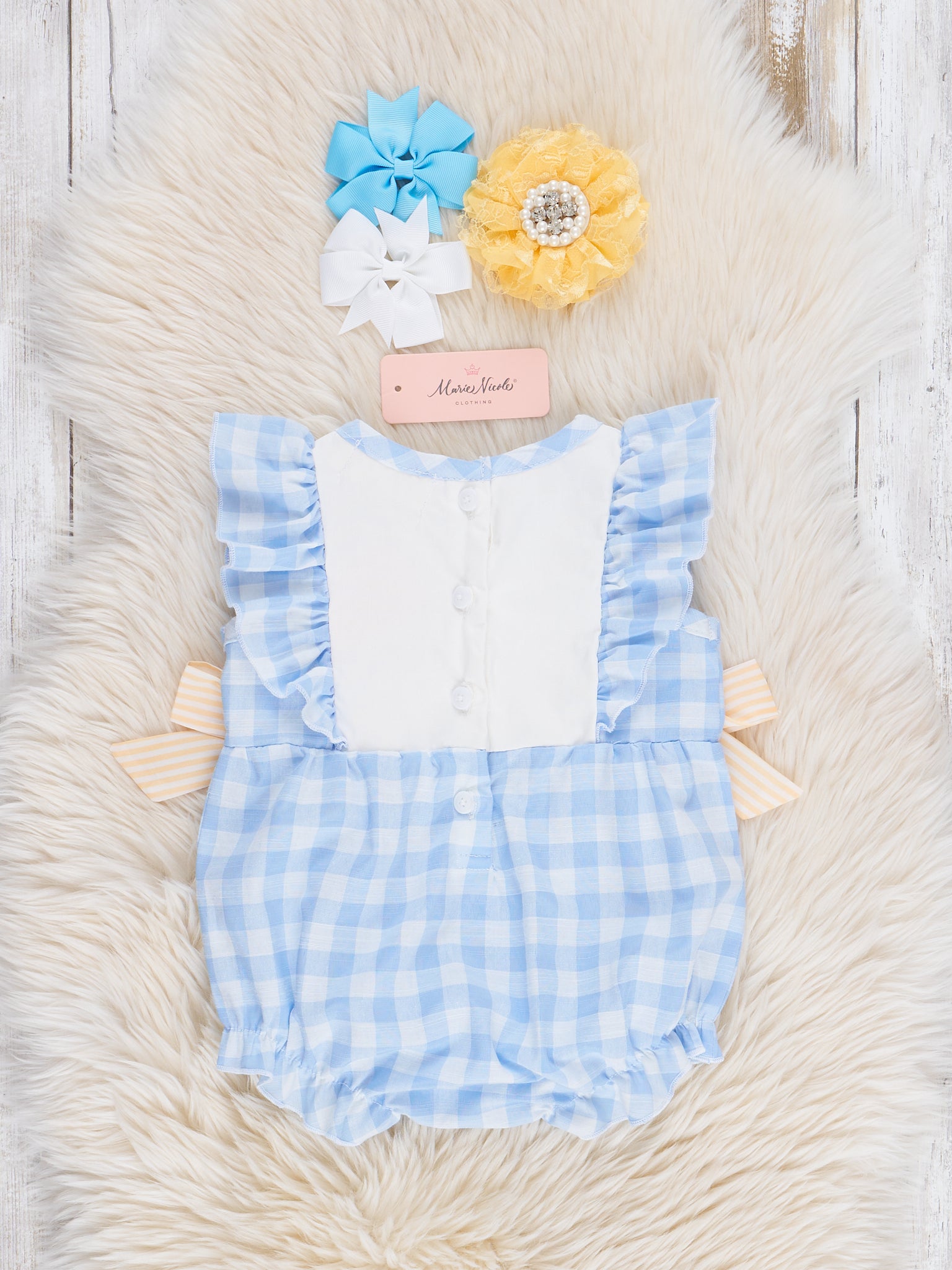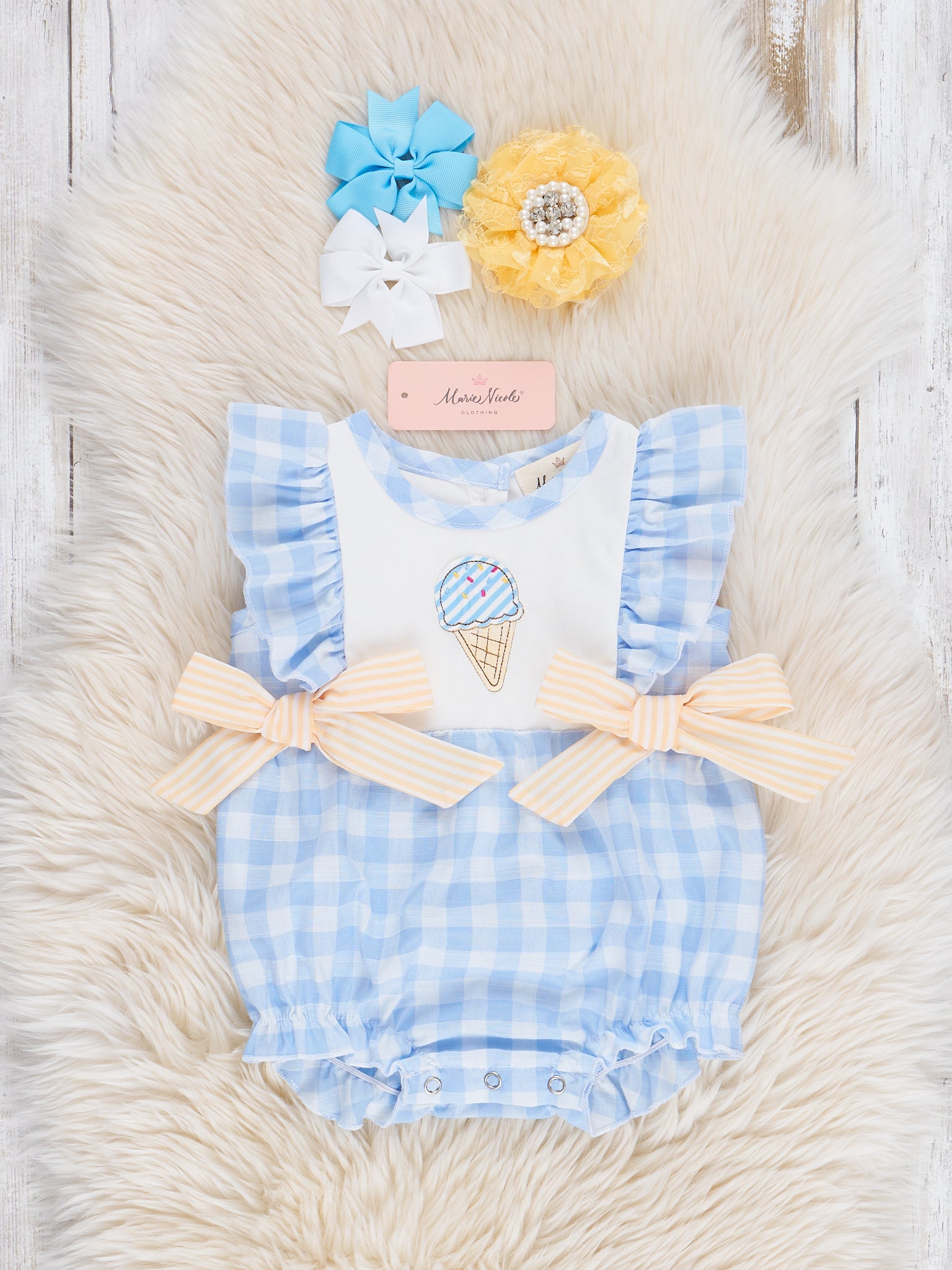Scoop up some sweet summer style with our Embroidered Ice Cream Gingham Ruffle Bubble! Your little one will love the embroidered ice cream cone and soft blue gingham print, while you'll love the easy button back and adorable yellow bow detail. It's part of a must-have sister set from Marie Nicole Clothing!