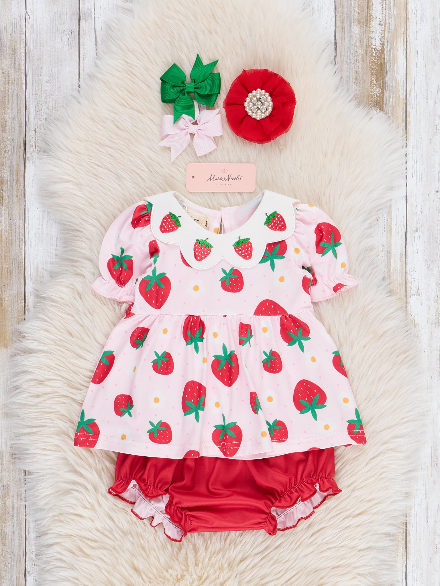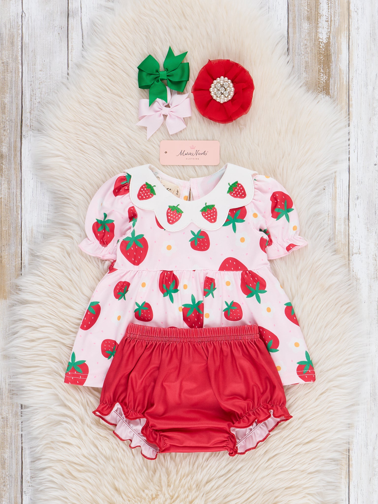 Get your little one festival-ready with our Strawberry Festival Puff Sleeve Bloomers Outfit! This adorable sister set features a playful strawberry print pink top with embroidered strawberries on a petal collar. The strawberry red bloomers add the perfect touch of summer charm. Designed by Marie Nicole Clothing.