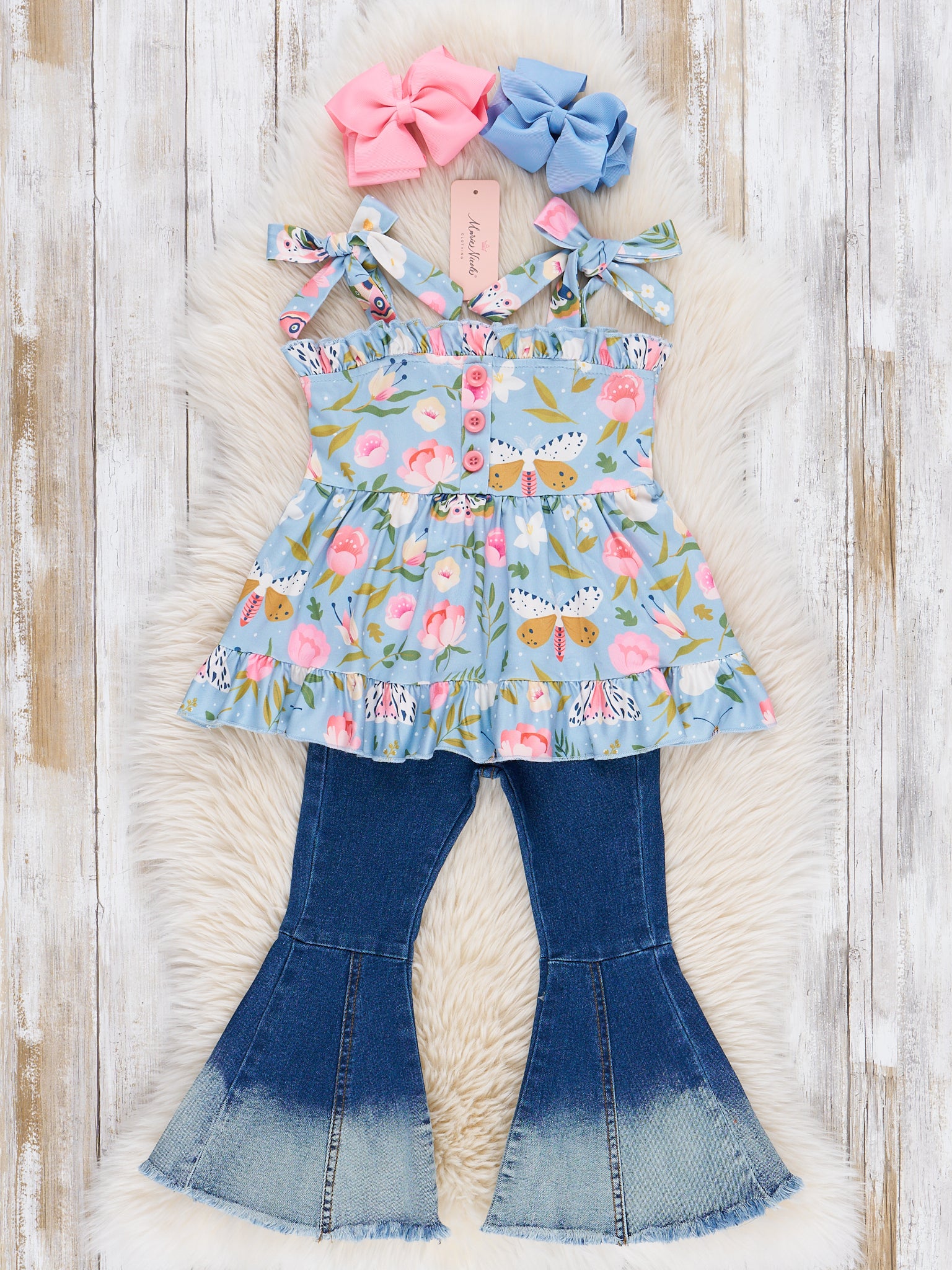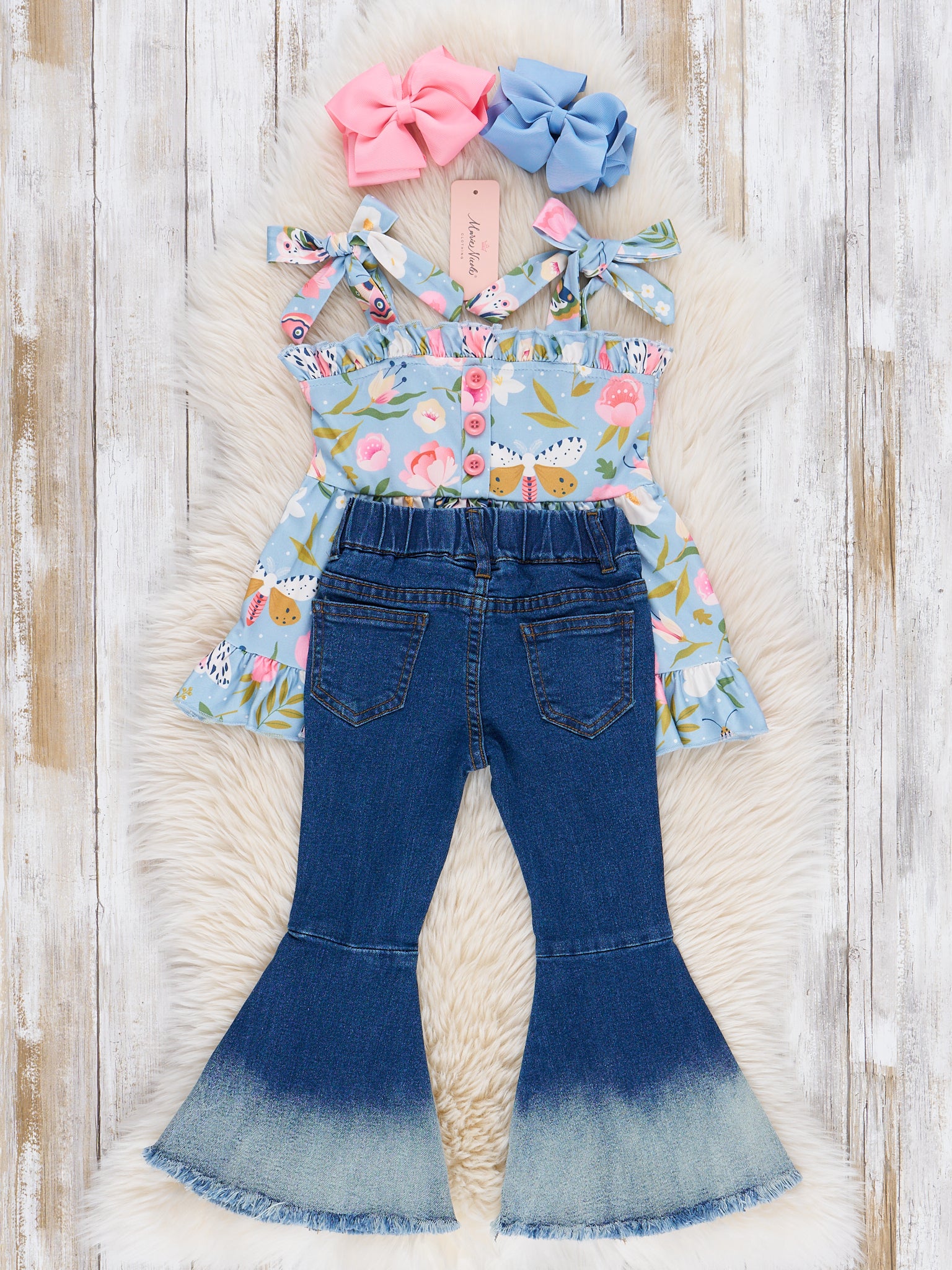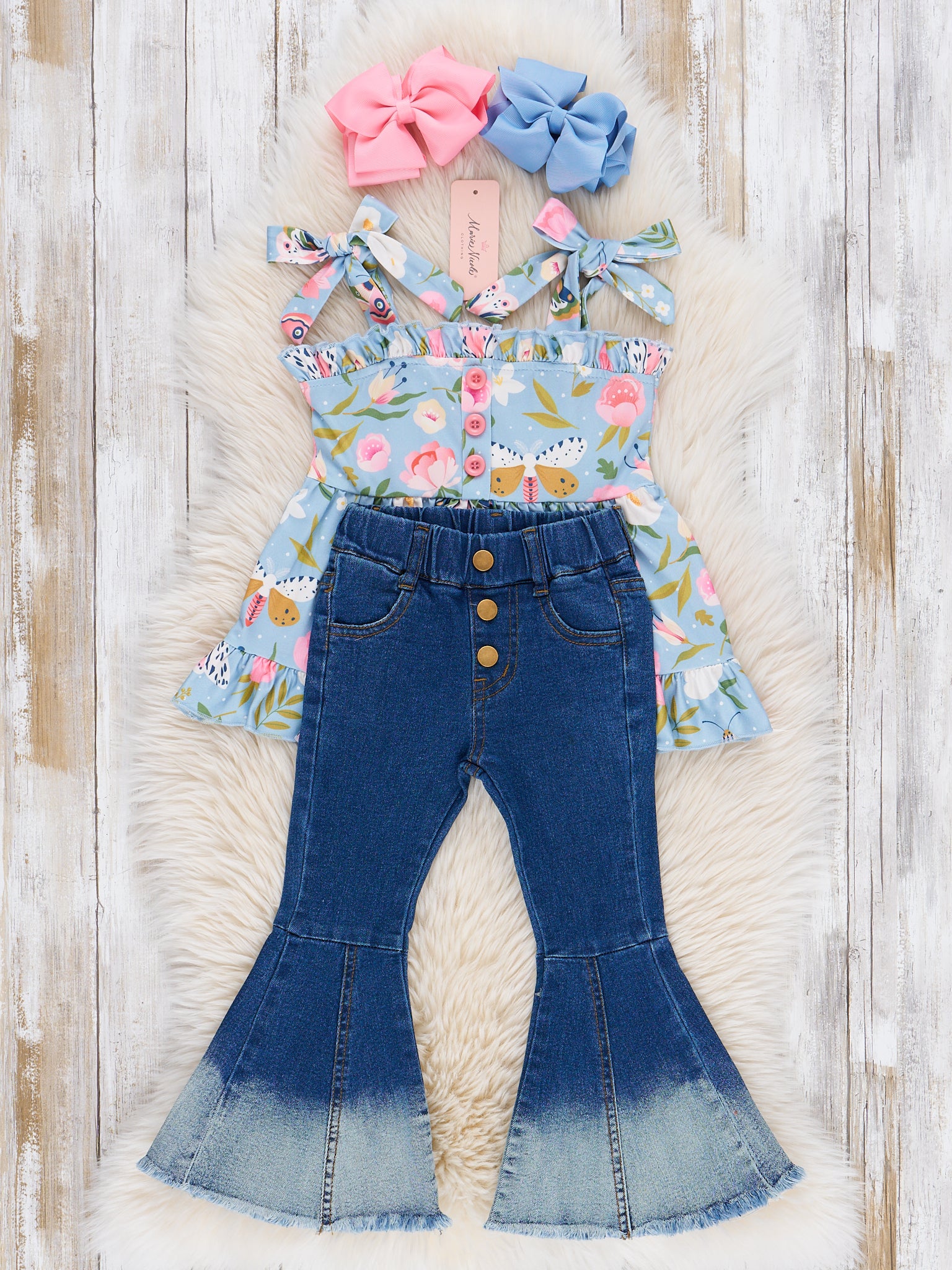 Flutter & Bloom Tie Tank & Denim Bell Bottoms Outfit