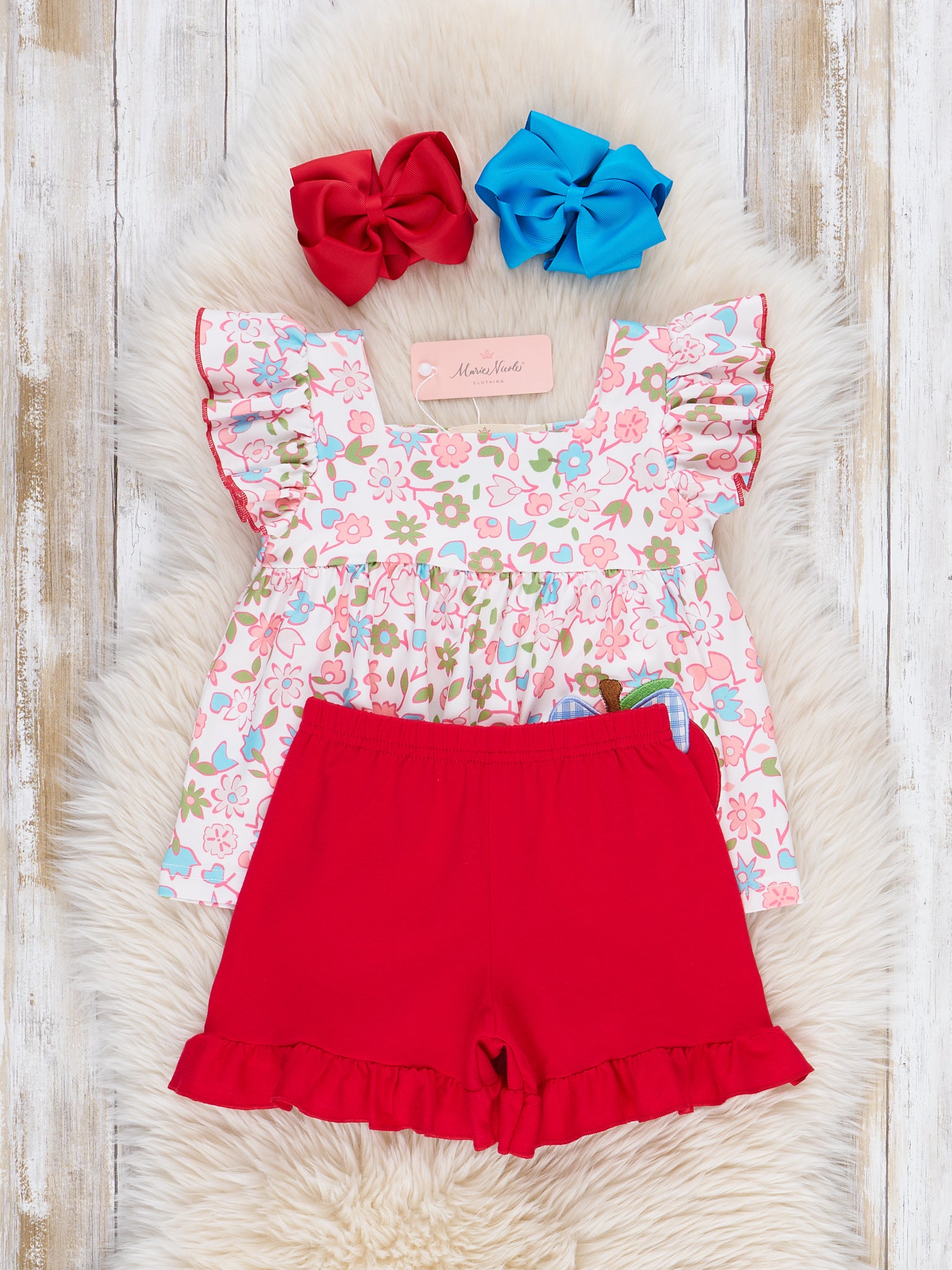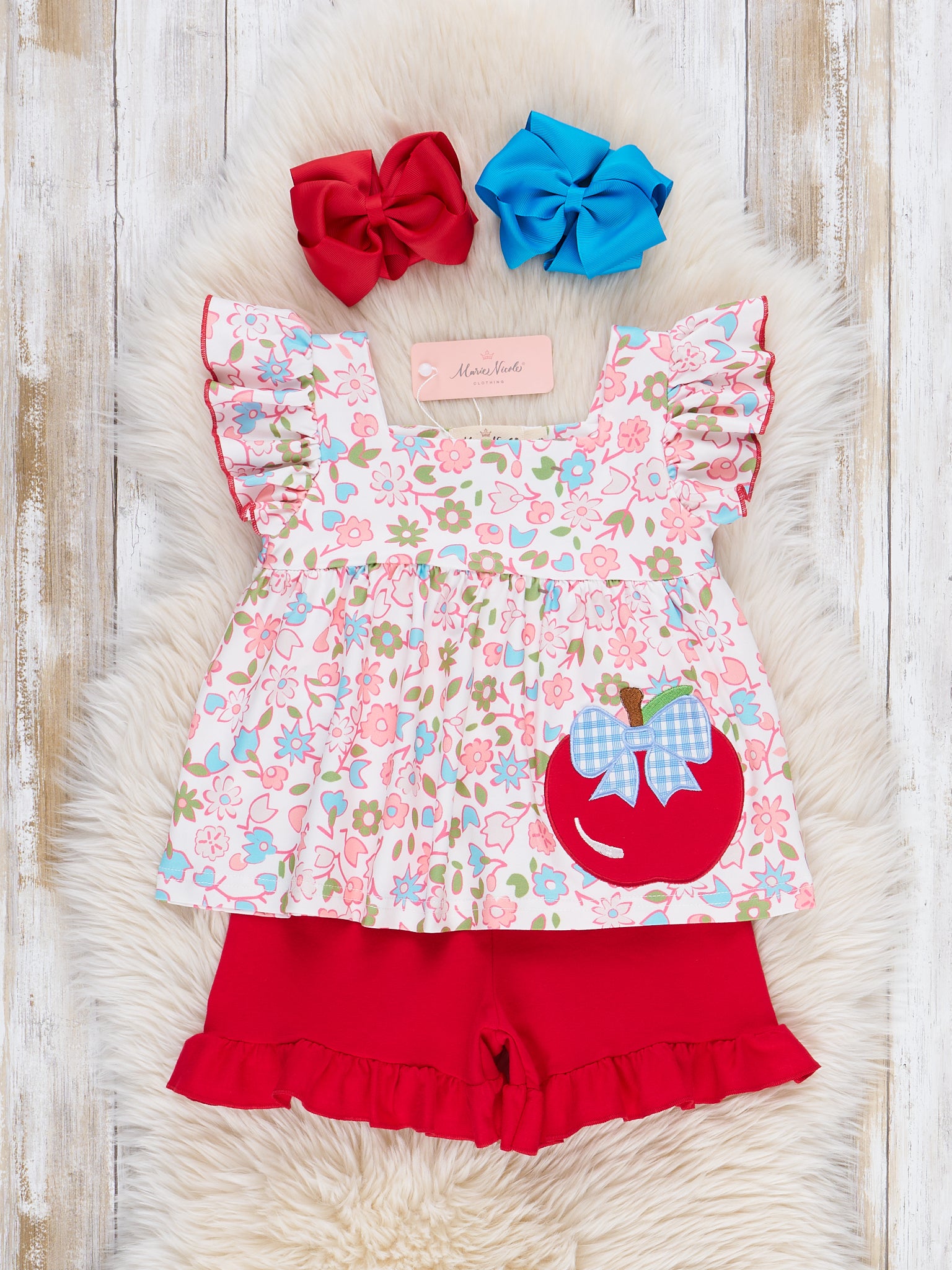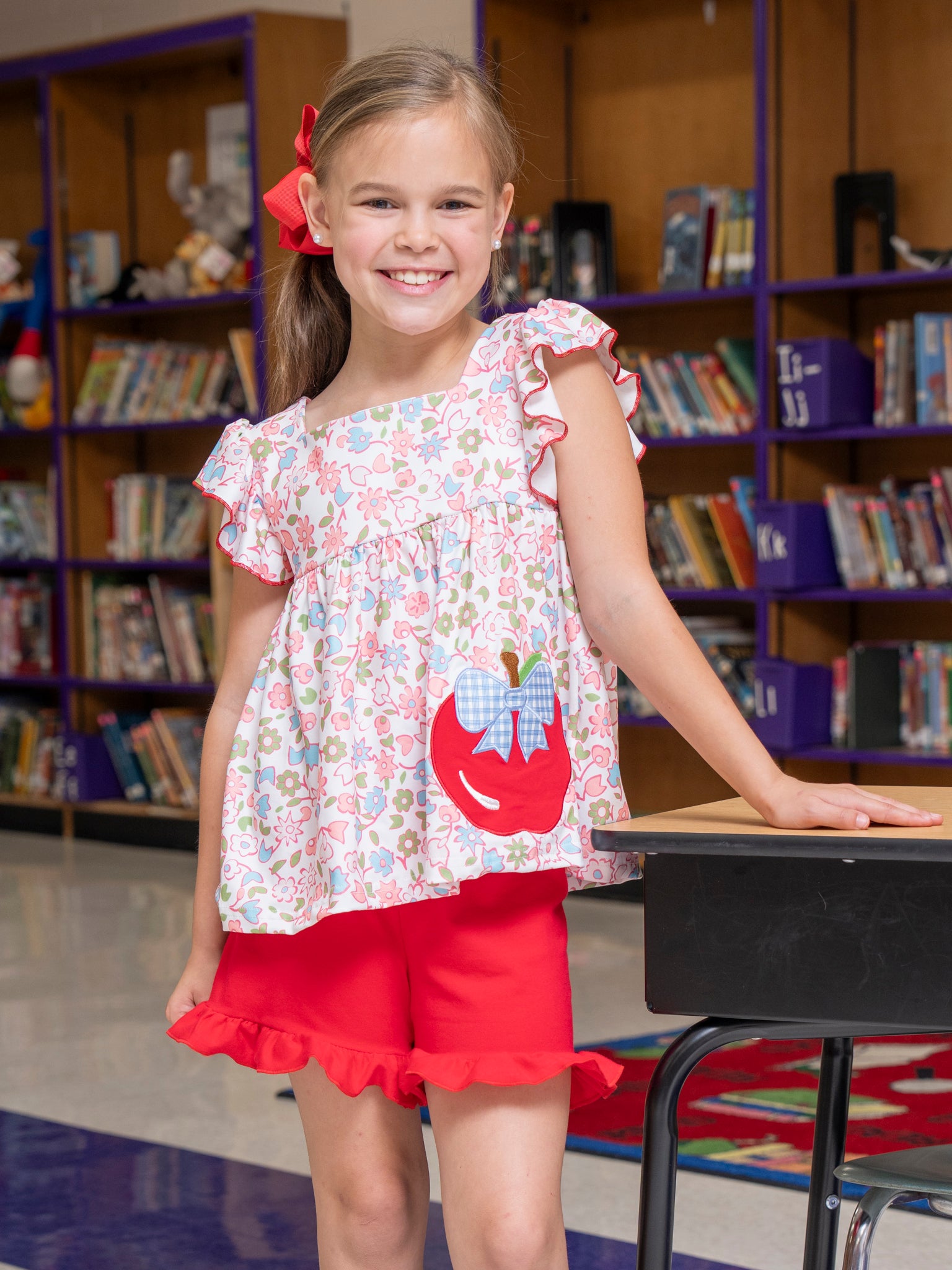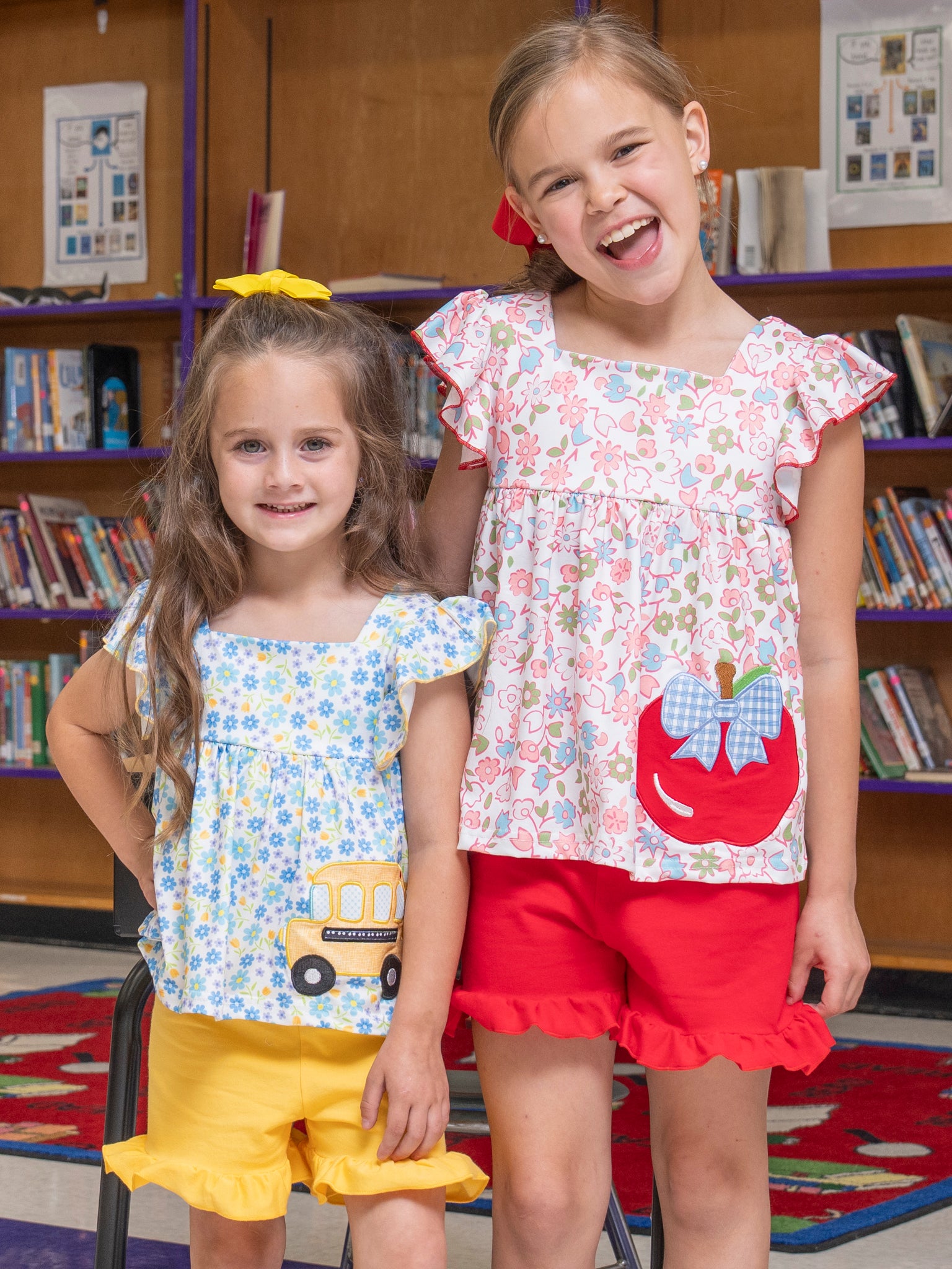 Hop on the style bus with the Floral Embroidered Red Delicious Ruffle Outfit! Featuring a whimsical apple embroidery paired with beautiful floral accents, this two-piece set from Marie Nicole Clothing is as cute as it is comfy. Perfect for school days, playdates, or a fun trip around town, this outfit brings a fun, adventurous vibe to any wardrobe.