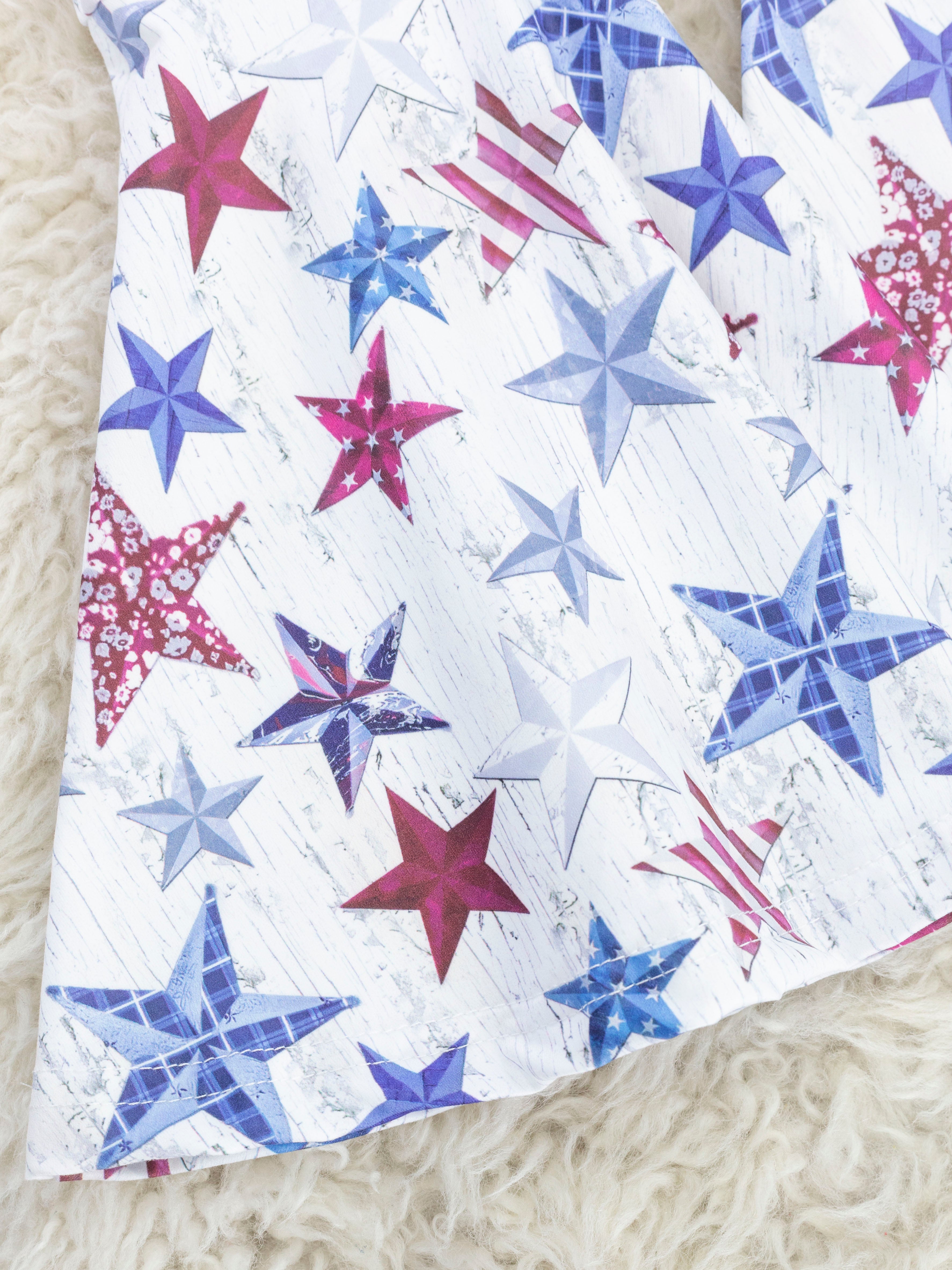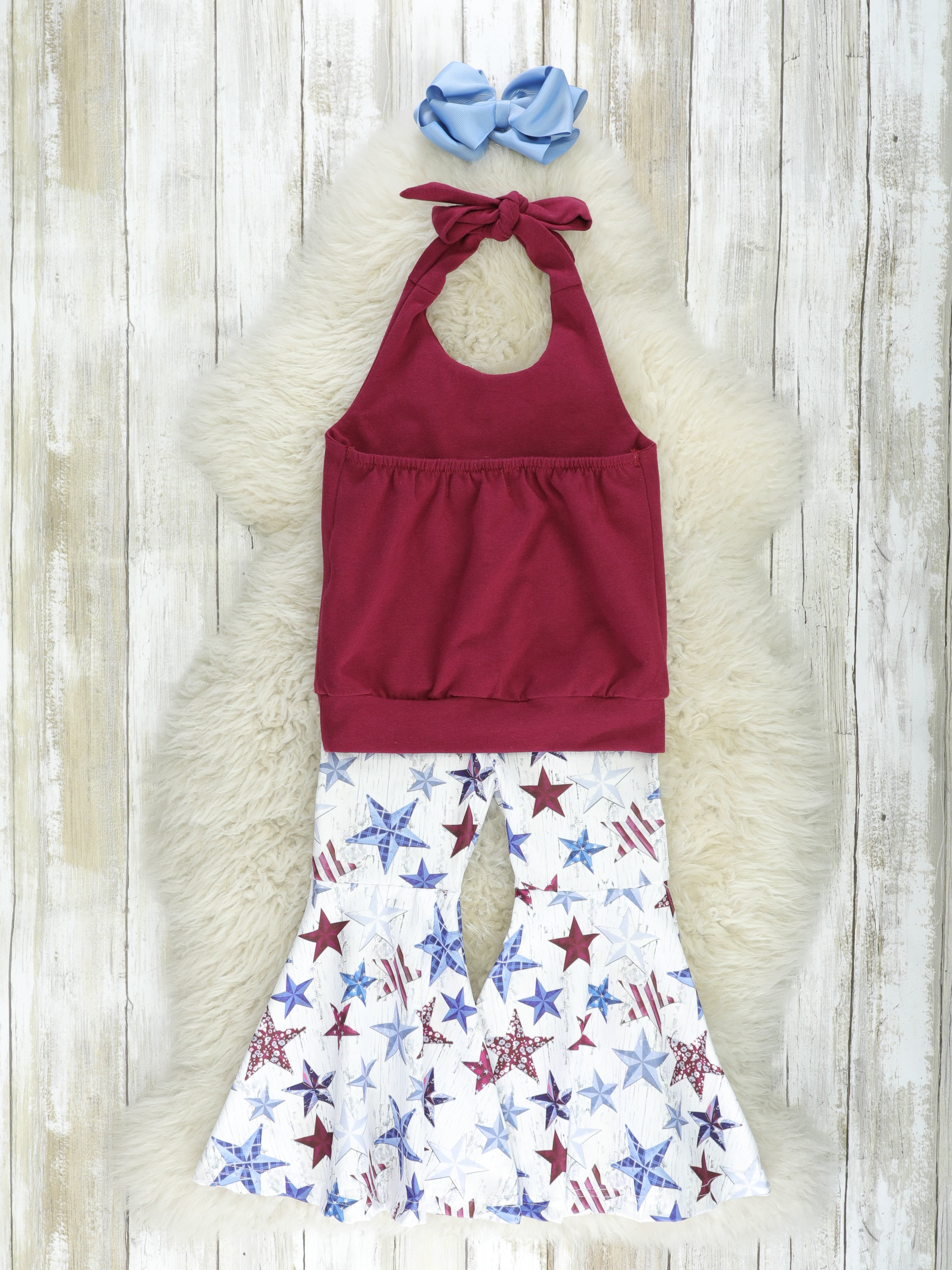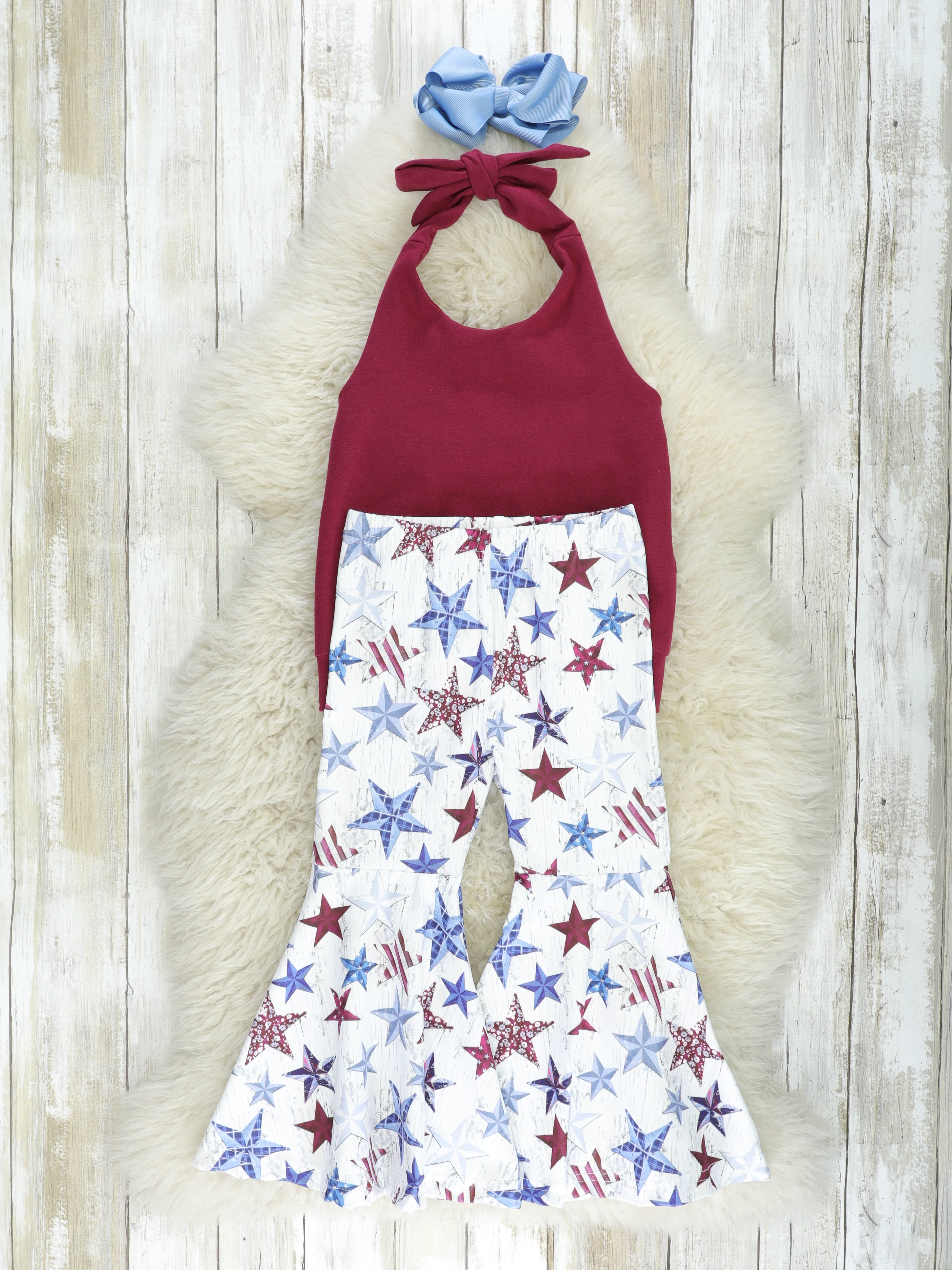 Let your little patriot show off their red, white, and blue with our Red Tie Top & Star Bell Bottoms. The halter tank has tie straps that give it an extra ‘pow-factor’ while the star bell bottoms are sure to become a showstopper! The elastic waistband adds just the right amount of comfort - so you can be sure they’ll be the most stylish and cozy at the parade.