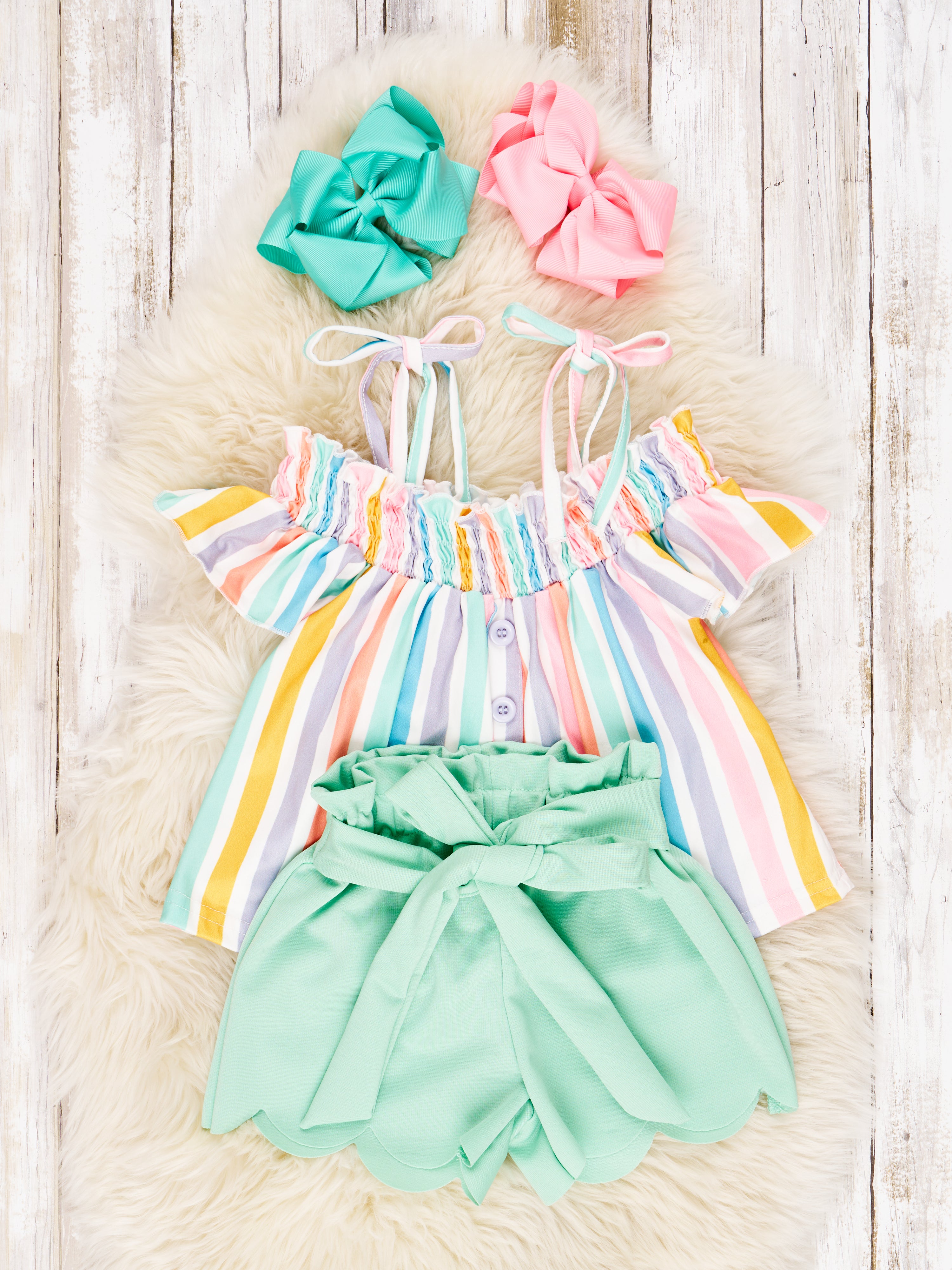 Make a stylish statement with this fun outfit! The Stripe Tie Top & Scalloped Shorts are perfect for your little trendsetter. With its unique striped top, scalloped shorts, and elastic waistband with tie detail, your kiddo will be lookin' fly and feeling comfy!