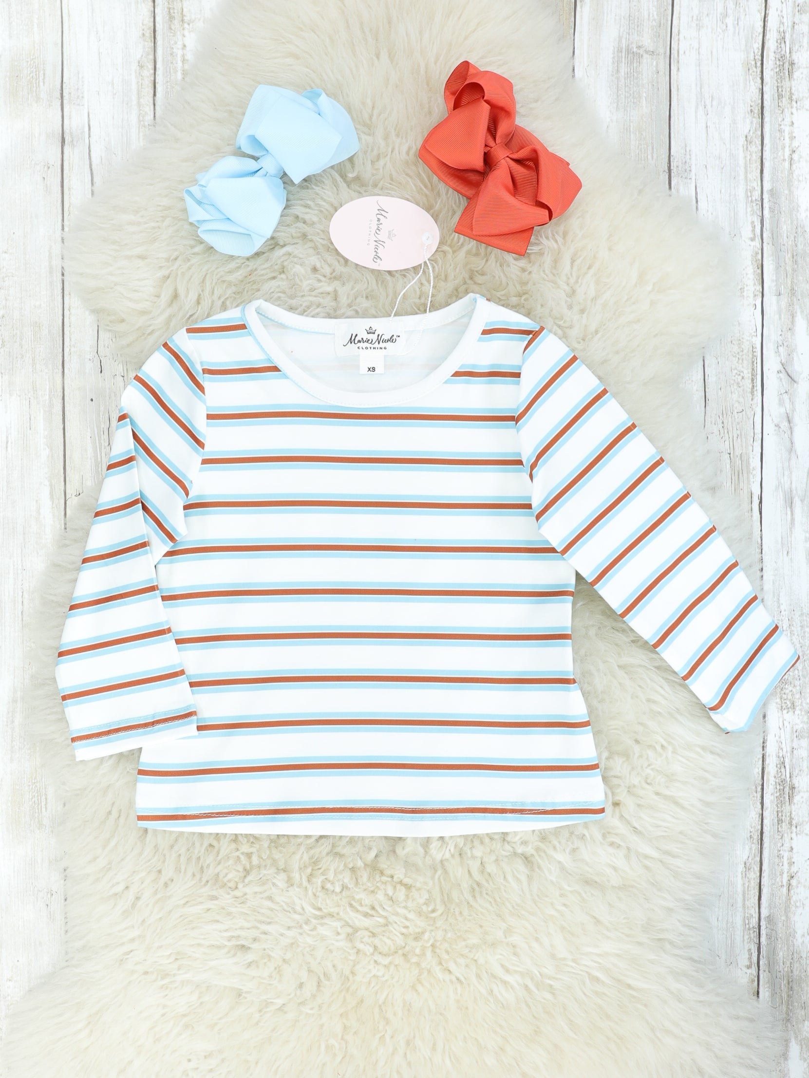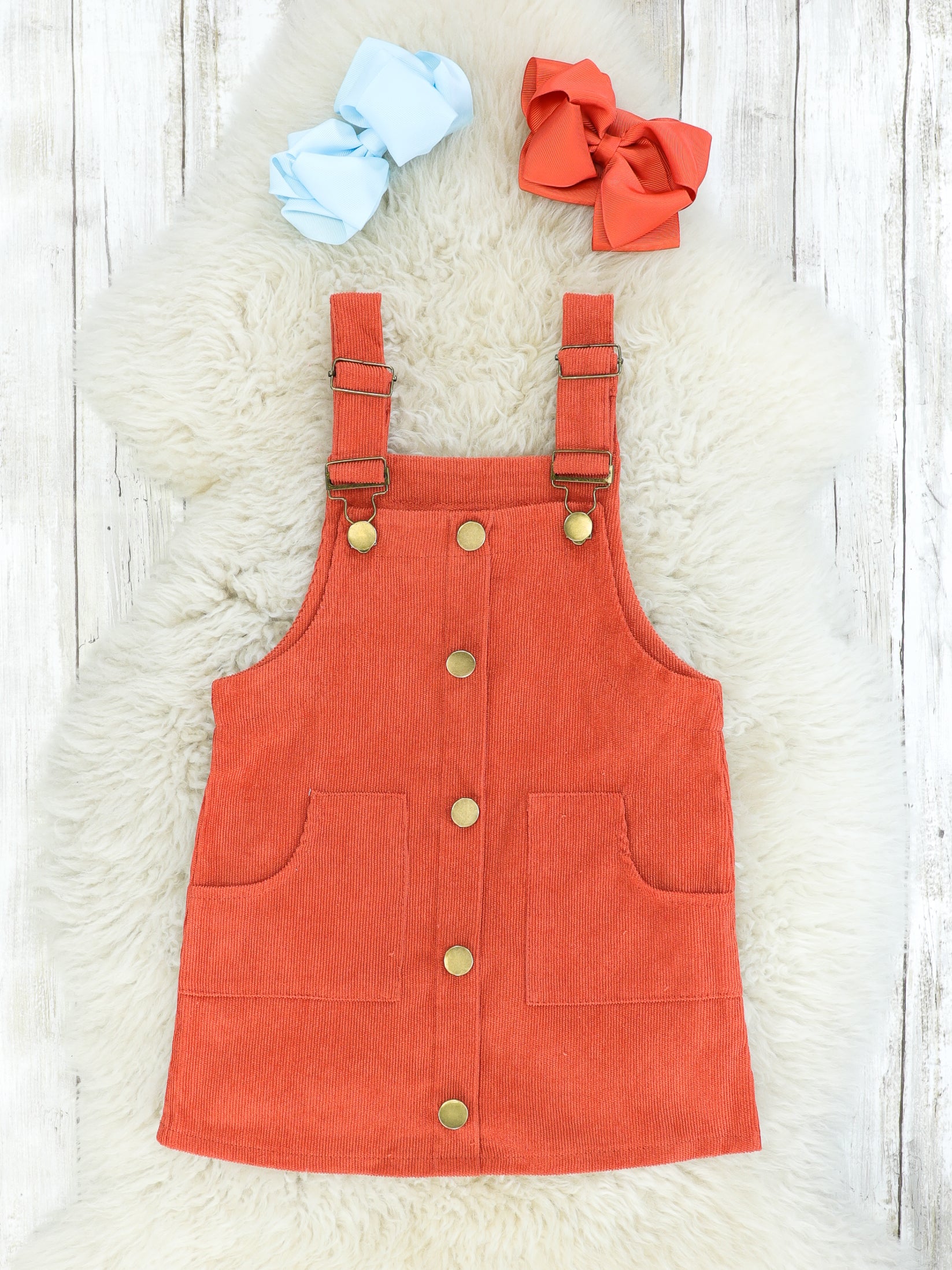 Looking for that perfect denim dress? Here it is! This outfit features a brown & blue striped long sleeve with a burnt orange overall dress. The dress has decorative buttons, adjustable straps, & pockets.
