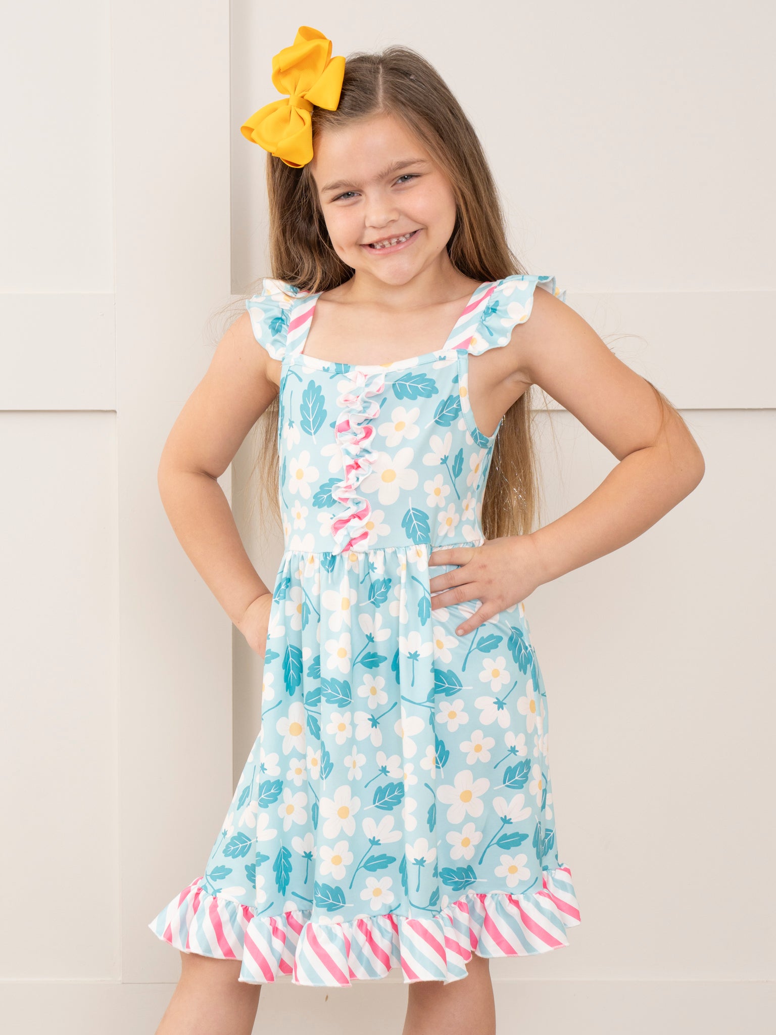 This Teal Daisies & Candy Stripes Ruffle Dress will have your little fashionista blooming with joy! Featuring a playful mix of florals and candy stripes, this sister set puts the fun in functional. With its ruffle detailing and trendy teal color, your little one will be the talk of the playground.