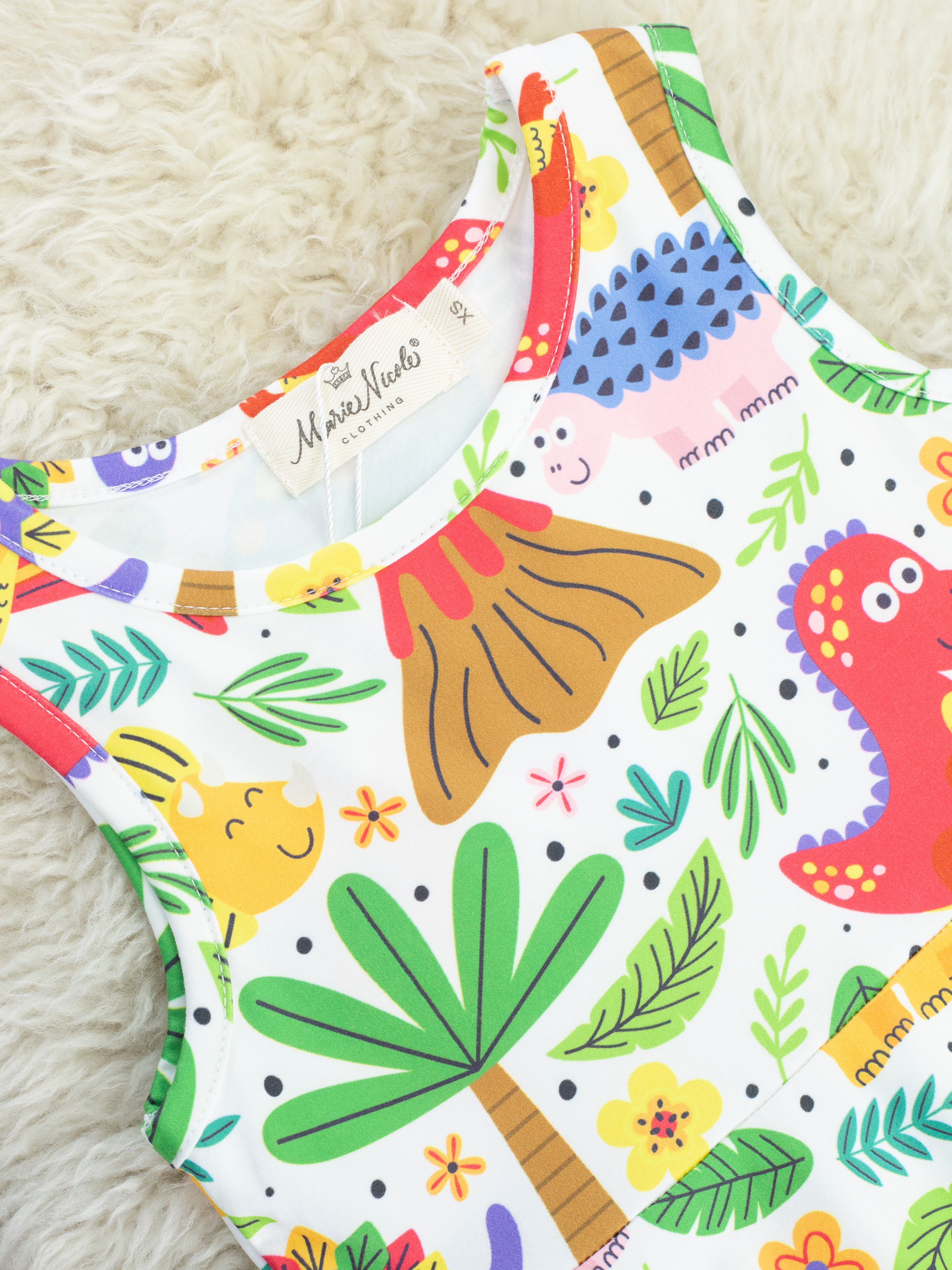 Watch your girls twirl & SAUR in this stunning dress! This swing dress features a darling tropical dinosaur print.