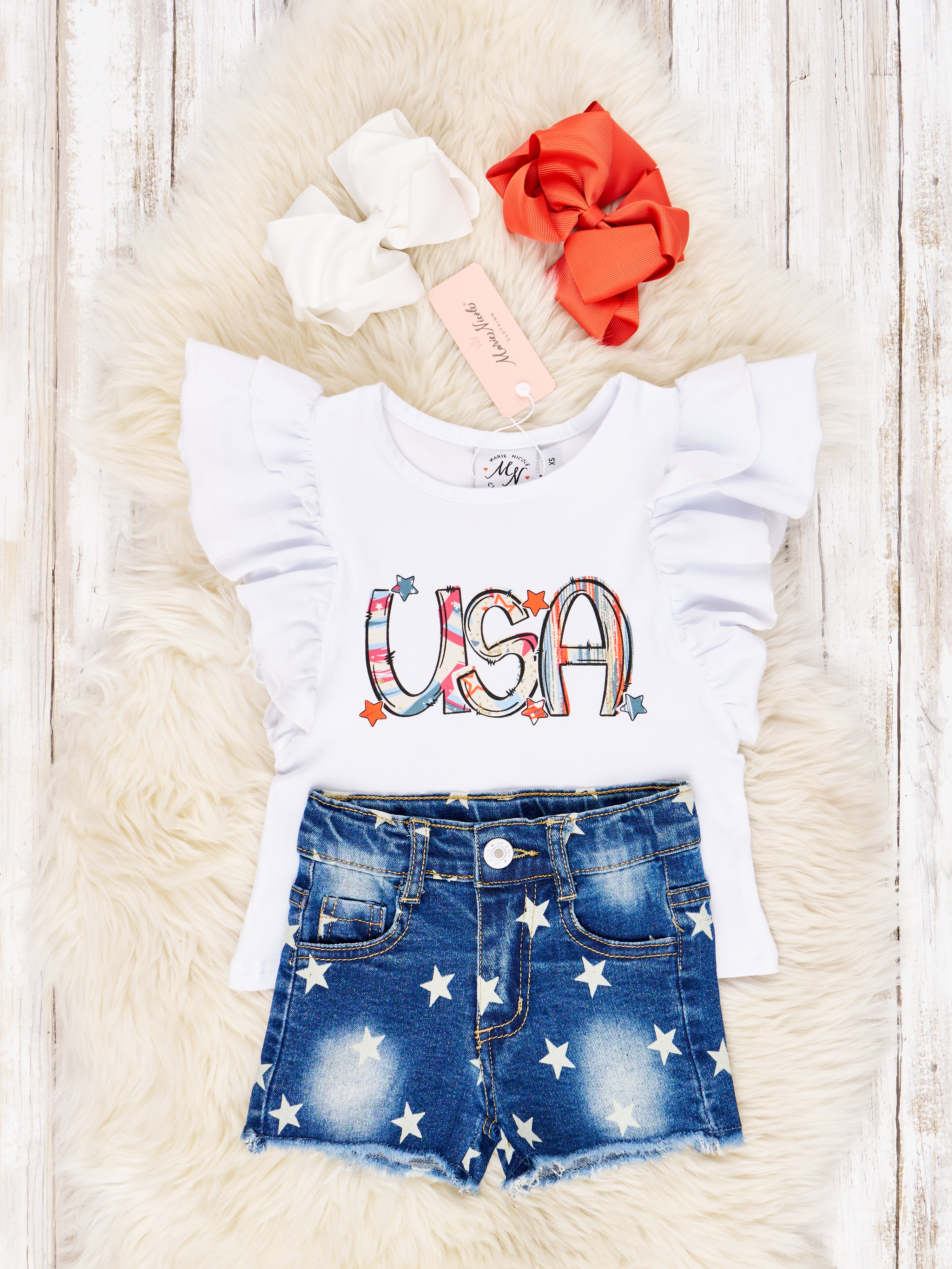 Make sure your little patriot looks their best in this Ruffle Denim Outfit! Featuring a white top with ruffles and a "USA" detail, plus denim shorts with stars, they'll be ready to make the country proud. Go USA! 🇺🇸