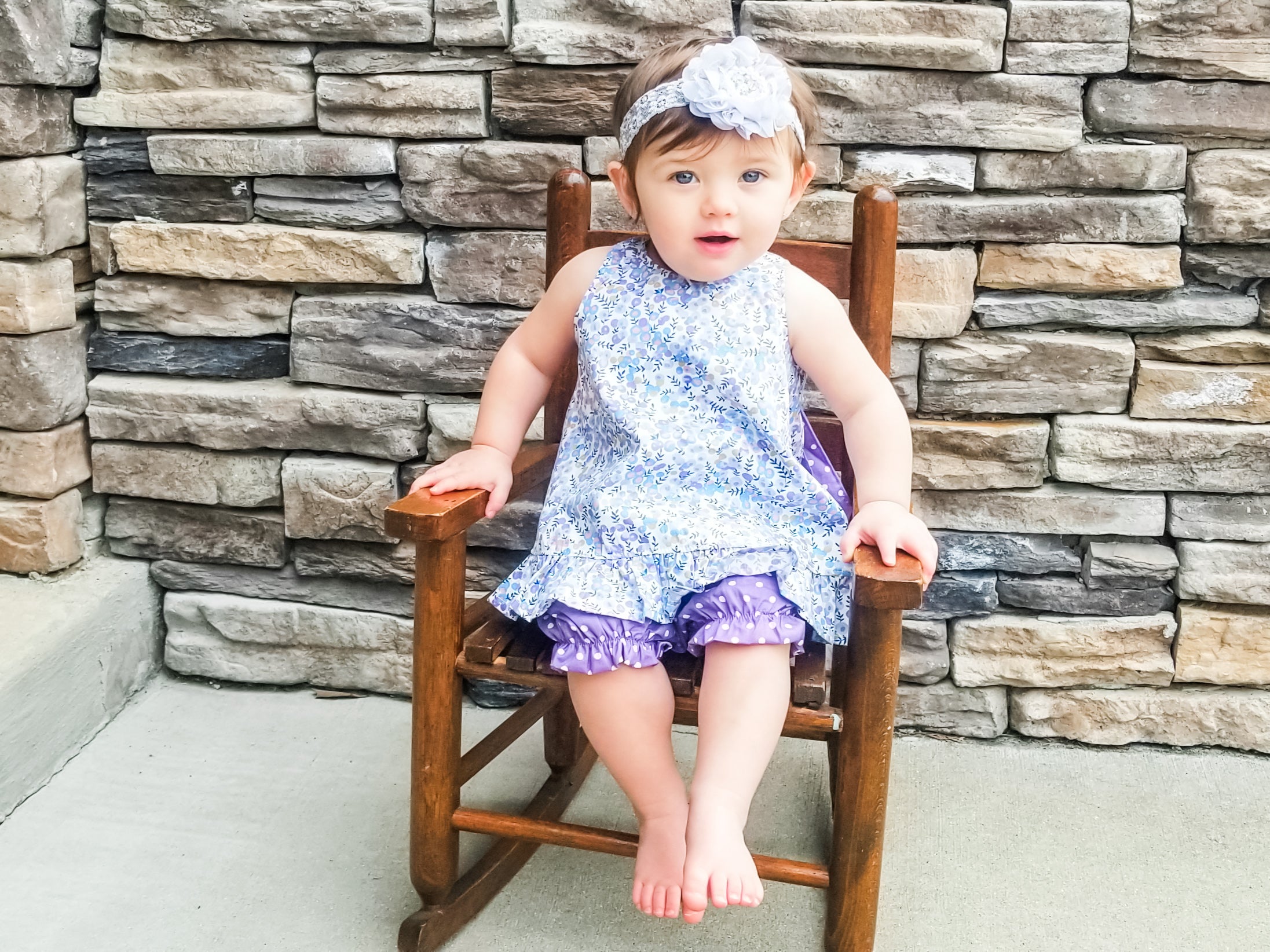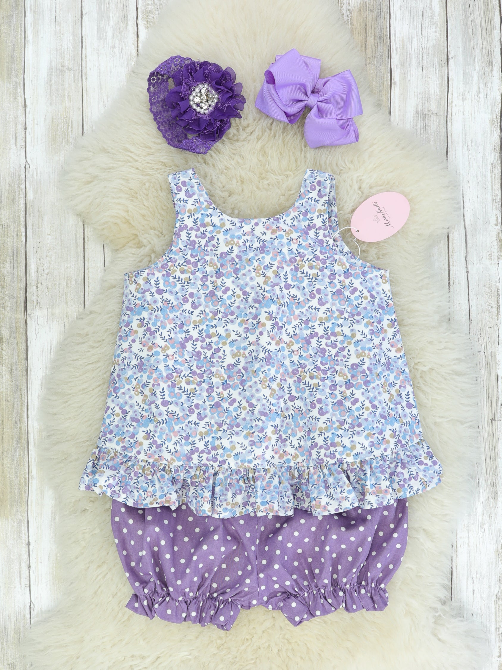The prettiest purple outfit for your little babe! The top features a beautiful magical berry pattern, ruffle trim, and an open-back with an adjustable purple bow with white polka dots. The purple balloon shorts feature matching white polka dots and cinched legs.
