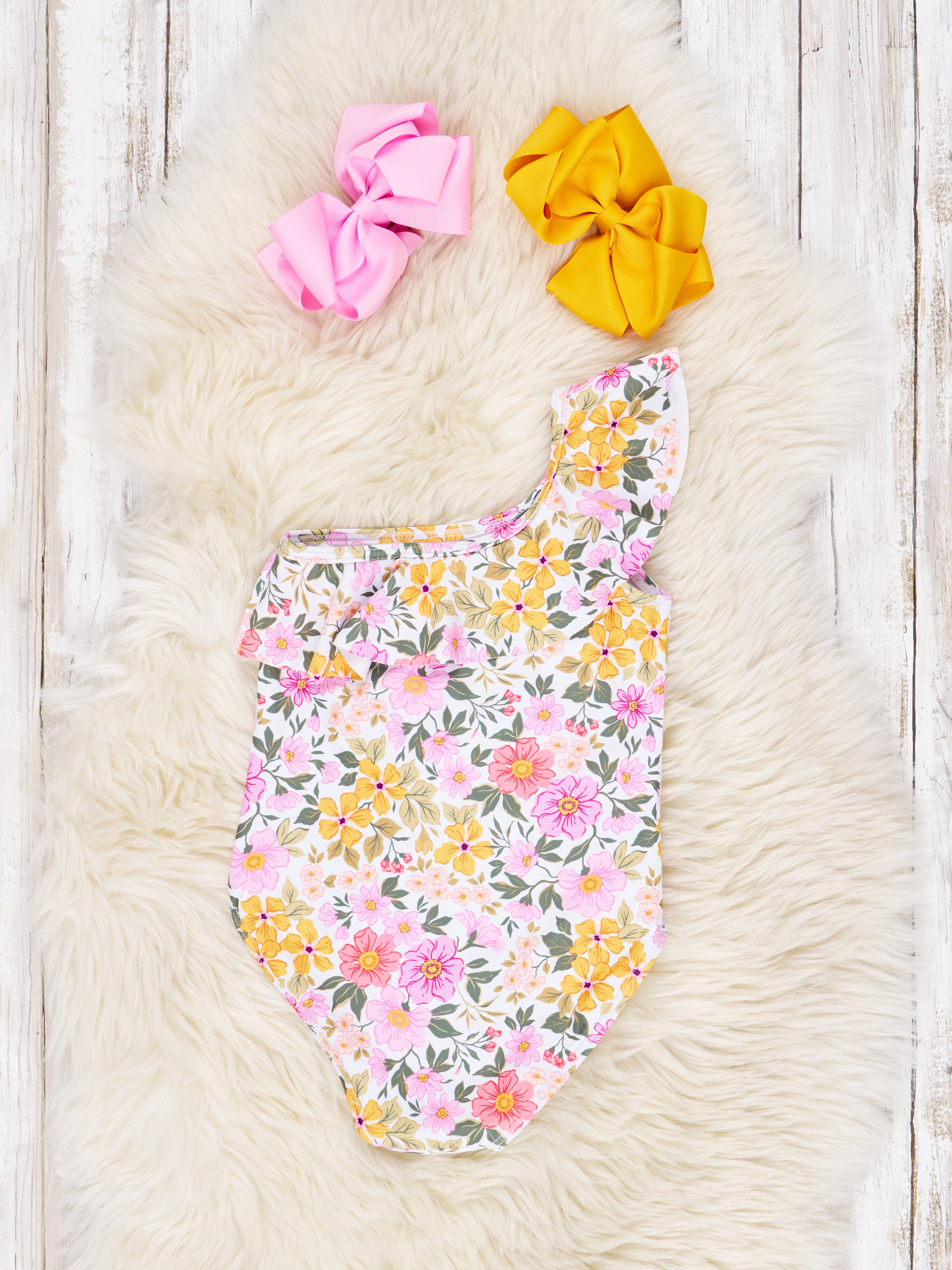 Dip into summertime style with this adorable Asymmetrical Floral Ruffle One-Piece Swimsuit! Showcasing a bright floral print and a playful asymmetrical cut, this adorable piece is the perfect way for the kiddos to make a splash! Ruffles for days!