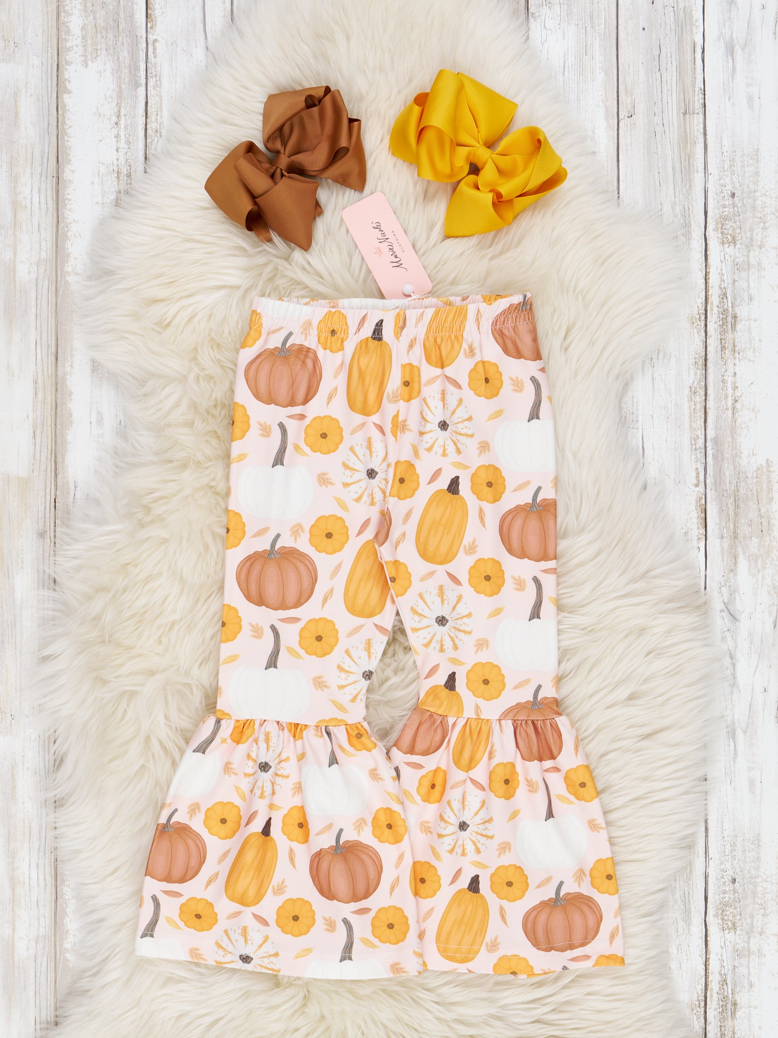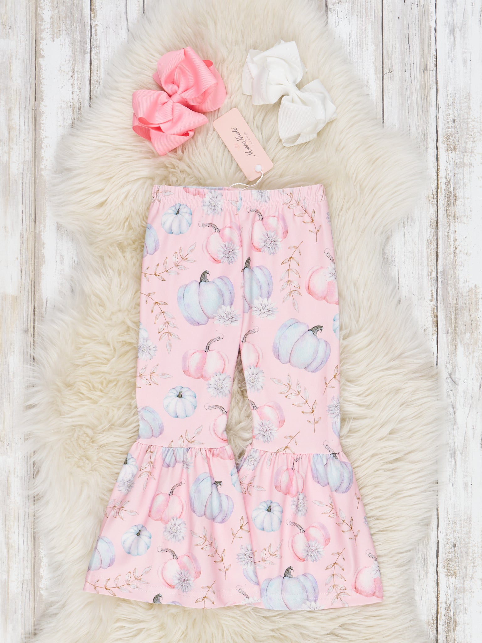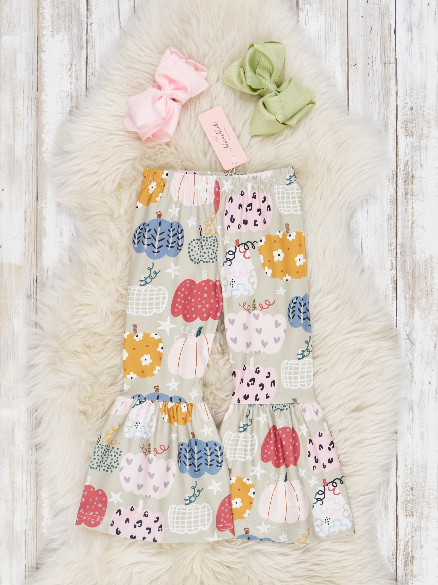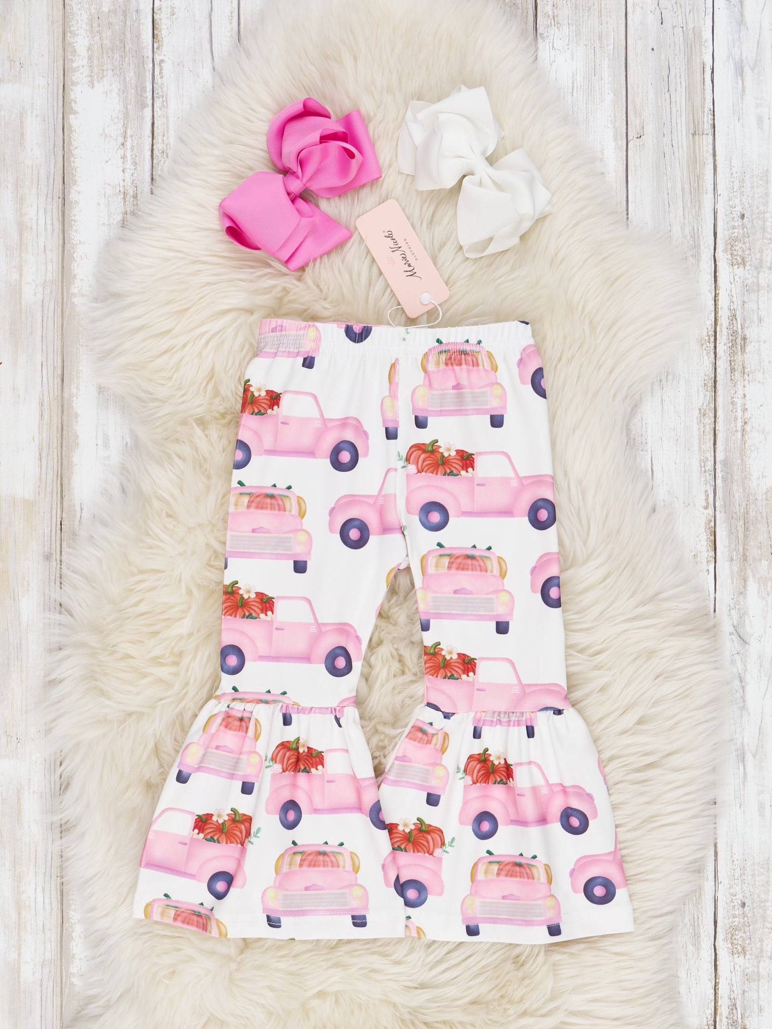 The perfect everyday bottoms for the autumn season featuring a comfy elastic waistband, sassy bell bottoms, and adorable pumpkin patterns. Available in four different patterns: Pink Trucks, Sage Doodles, Rosy Pumpkins, and Orange Gourds.