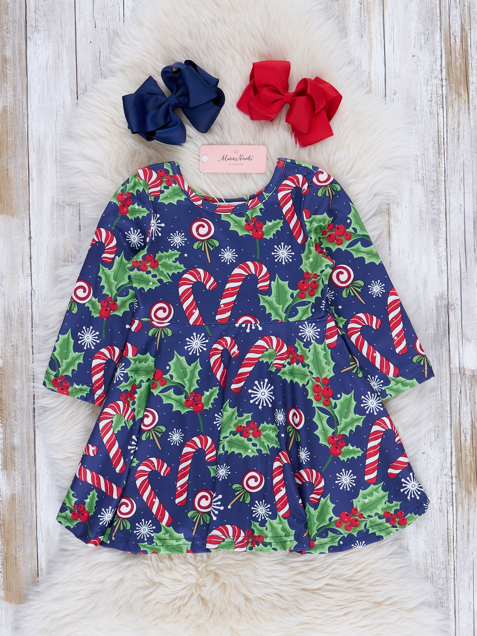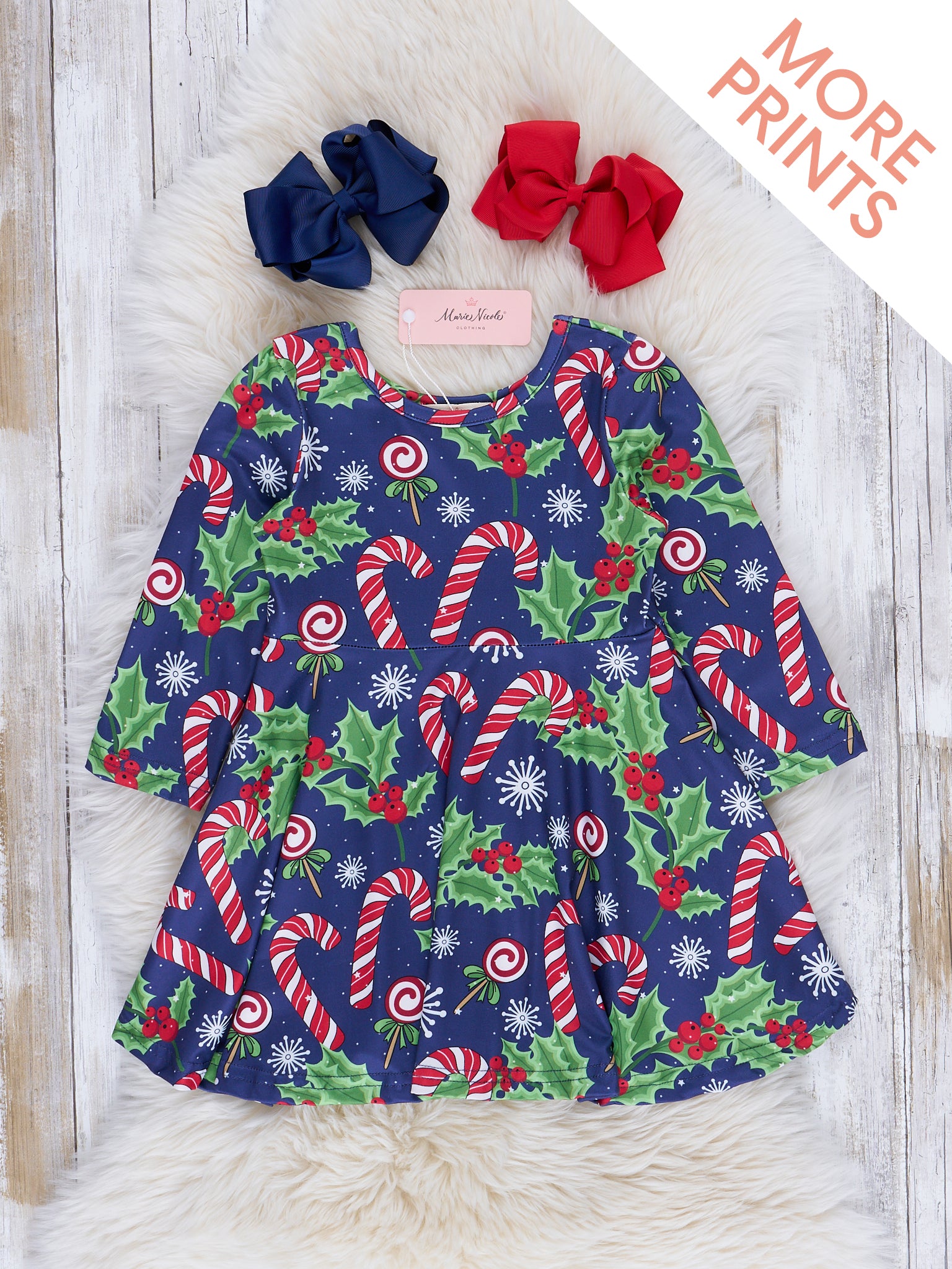 Everyone's favorite swing dresses are back with the most adorable holiday prints! Outfit your mini every day of the season with these comfy long-sleeved dresses that cinch at the waist and have subtle pleats.