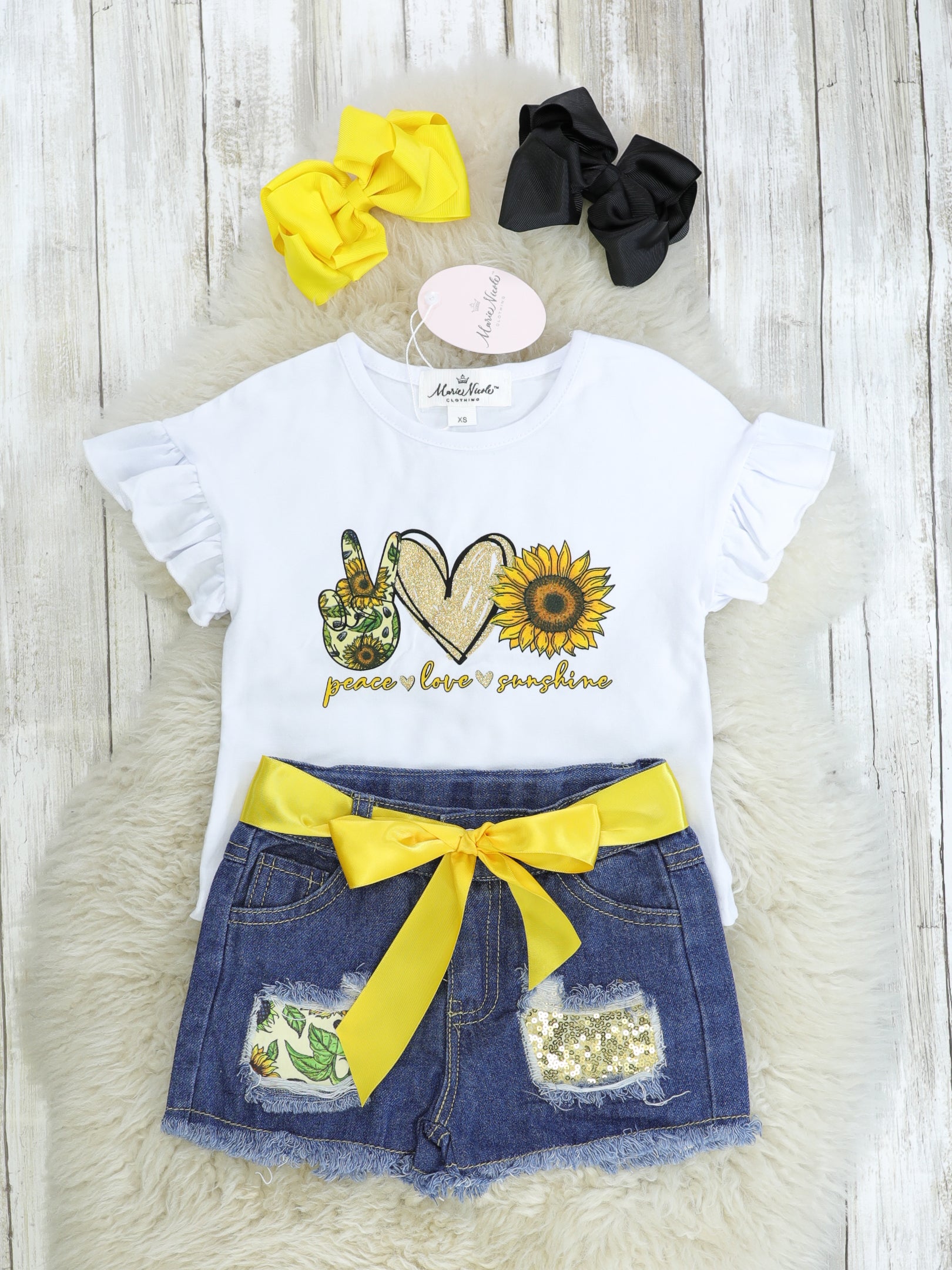 Peace, Love, & Sunshine! The recipe for a great Summer! This outfit features the cutest details on the top & distressed denim shorts.
