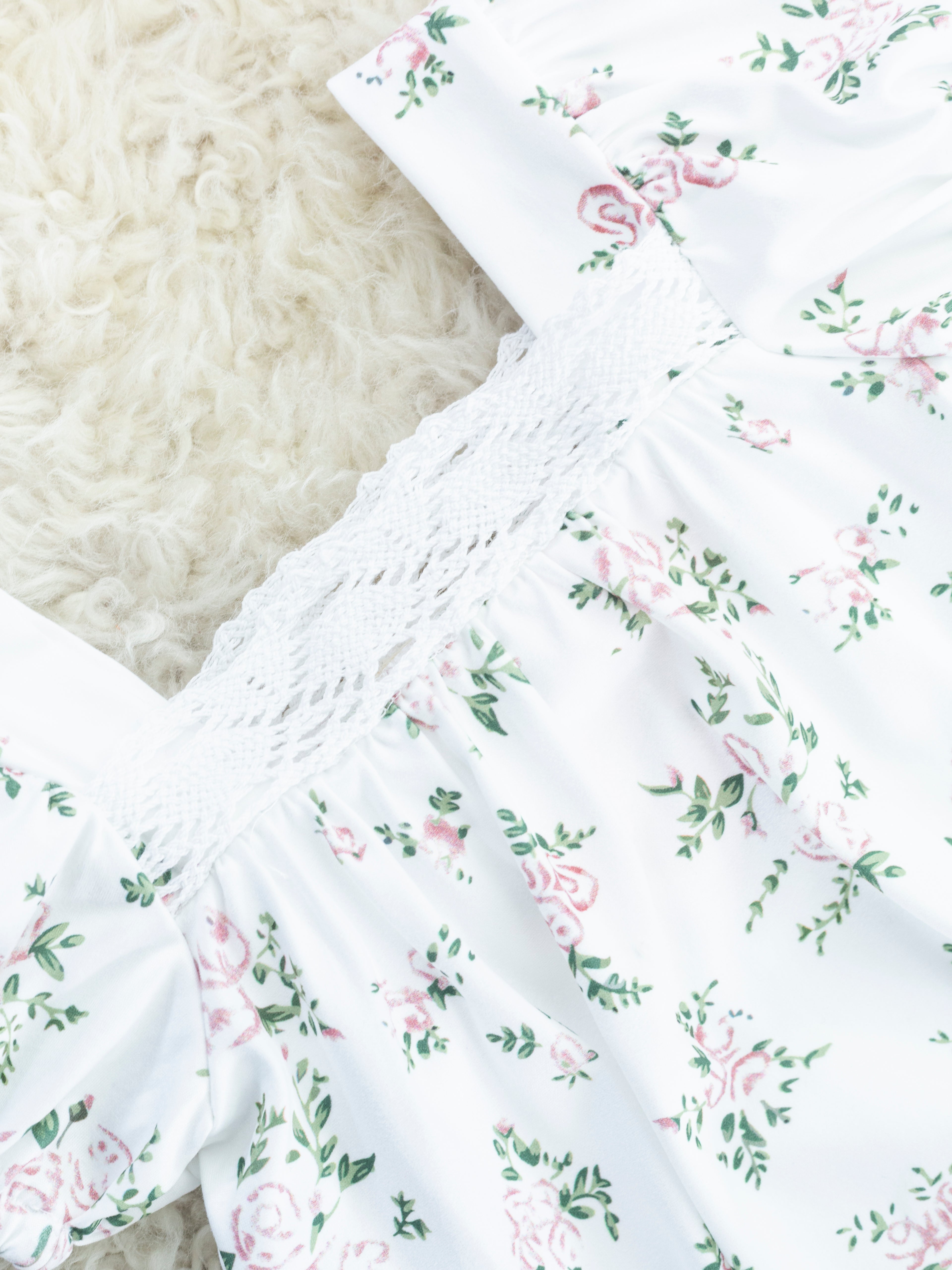 A beautiful bubble for your stunning gals! This bubble features sweet pink roses, doily lace trim, & puff sleeves.
