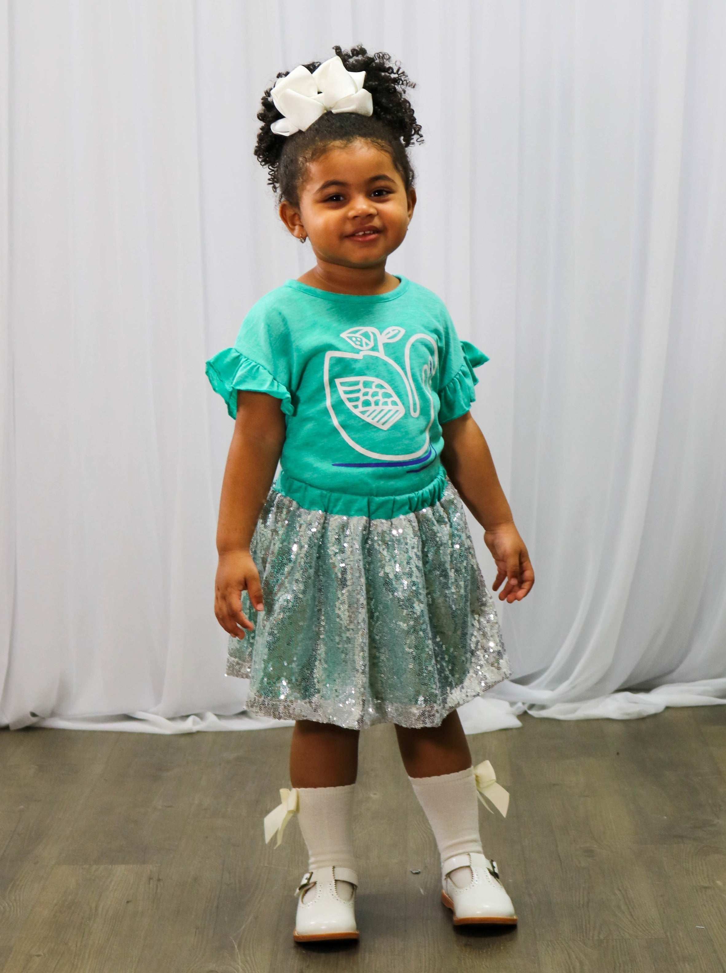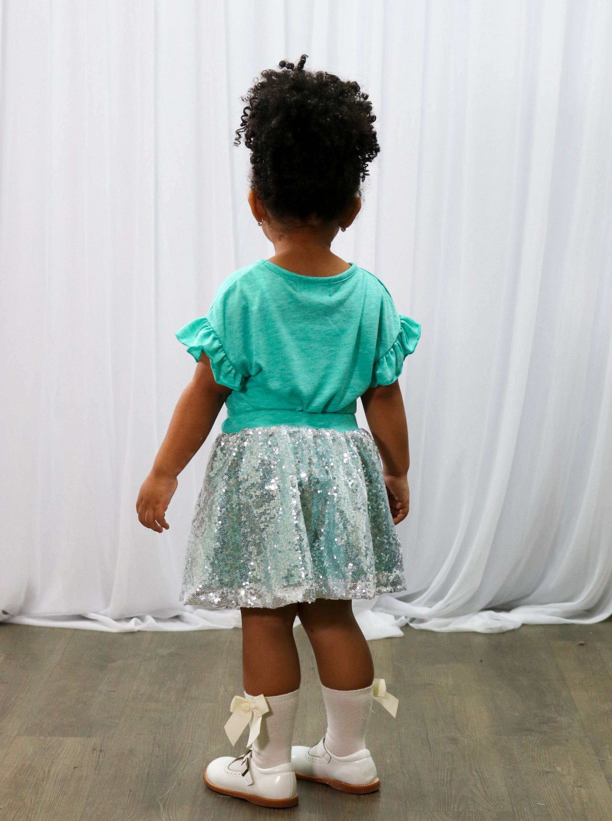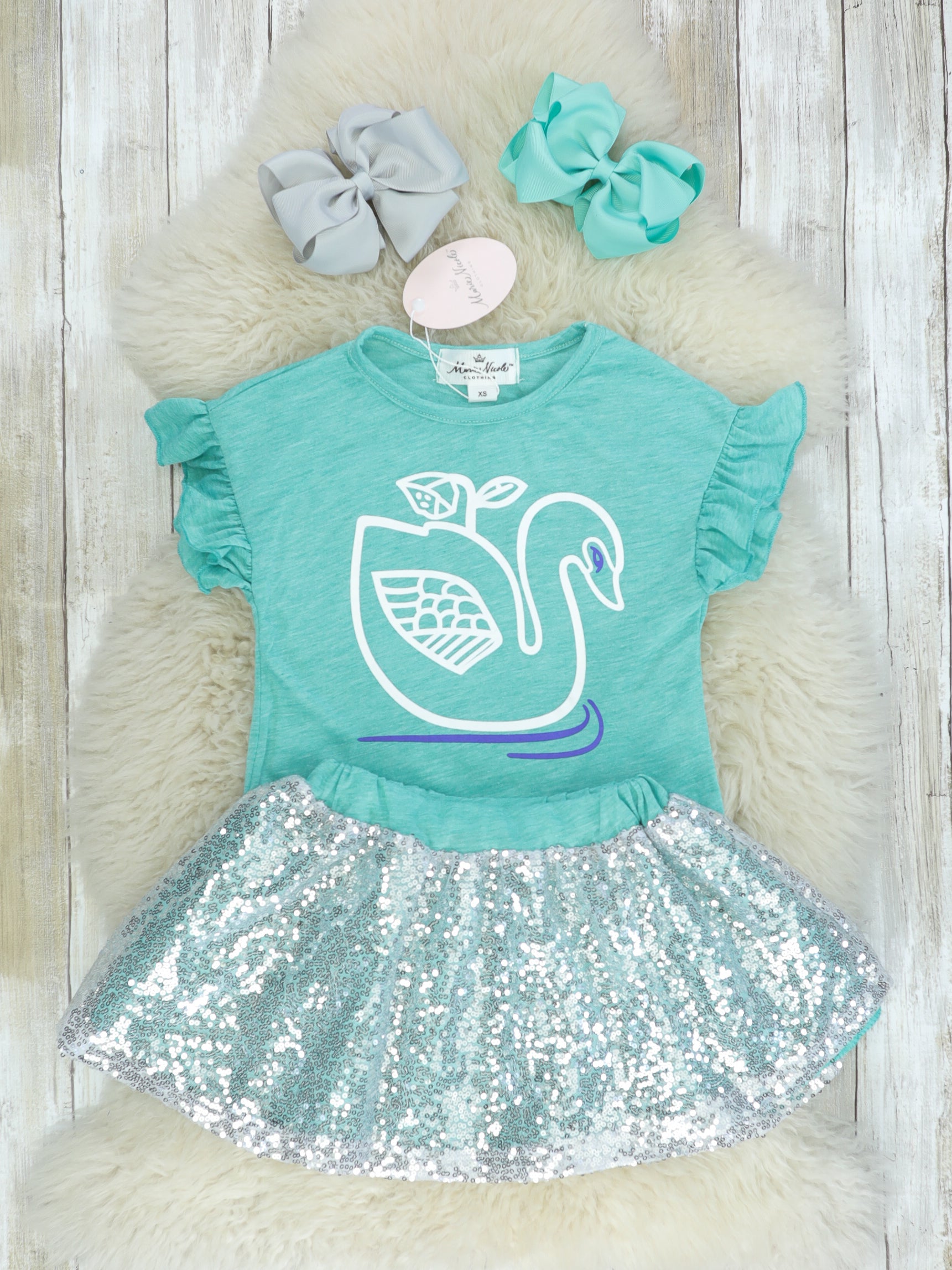 Your little will leave a little sparkle everywhere they go in this outfit! It features a flutter sleeve teal top with the prettiest swan detail and a sequin skirt with a stretchy waist.