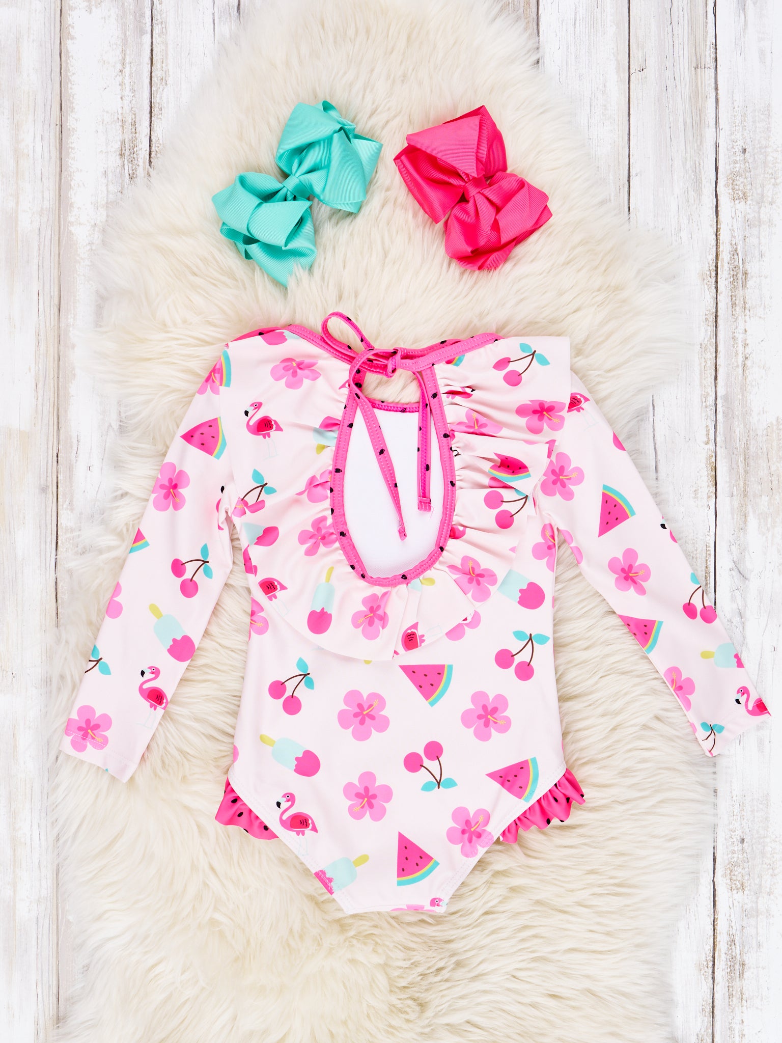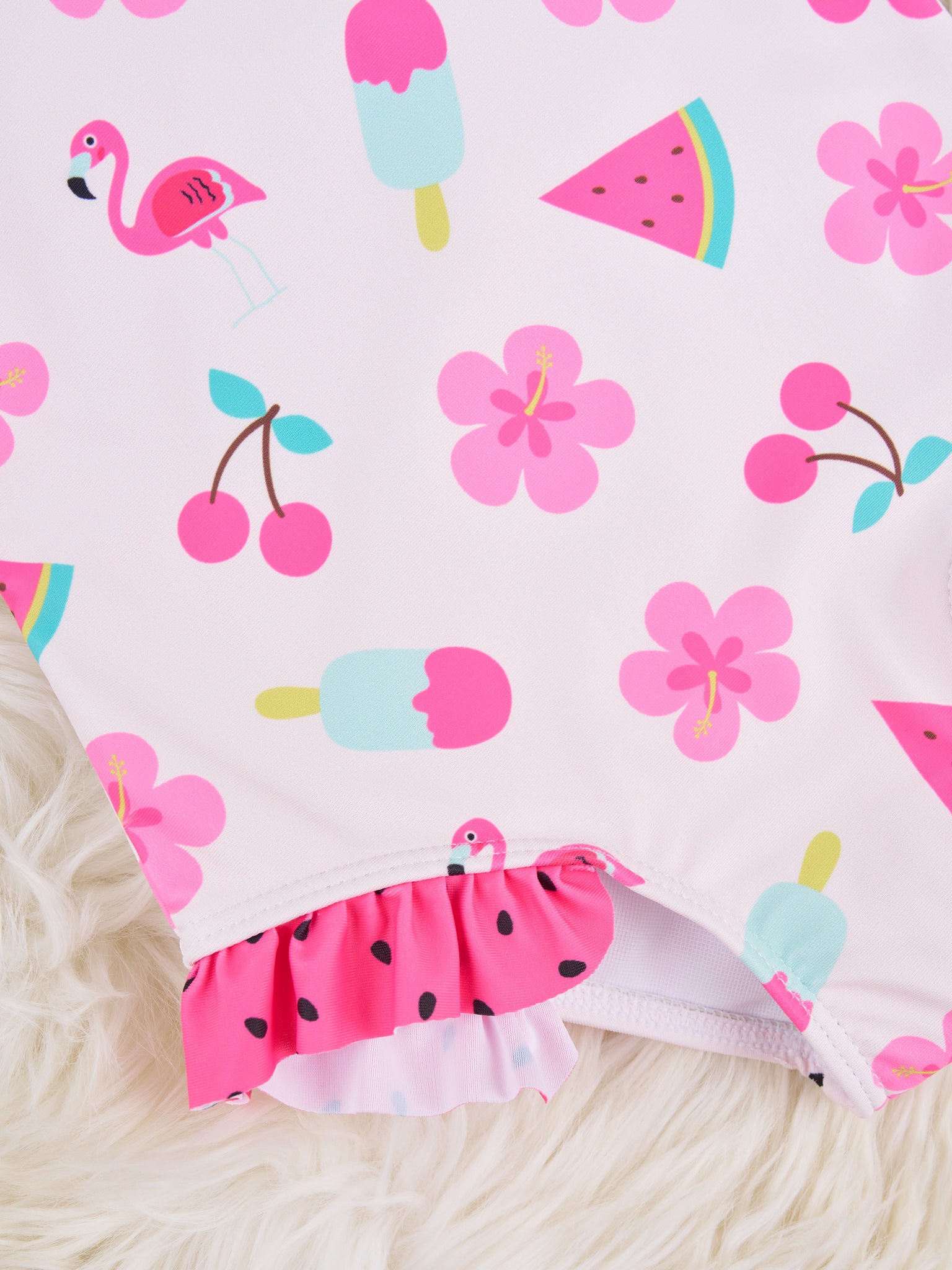 Watermelon & Flamingo Ruffle Rash Guard Swimsuit