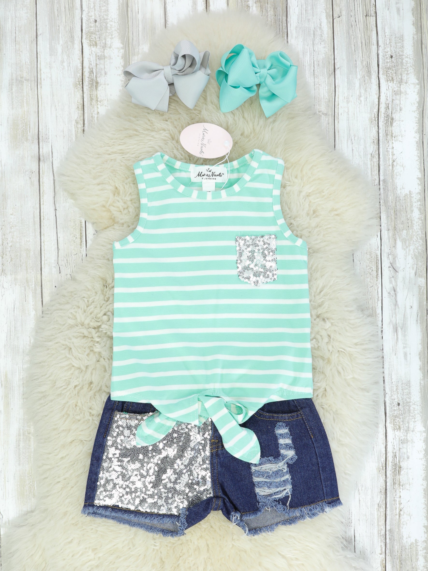 Silver Mint Knot Tank & Sequin Denim Outfit